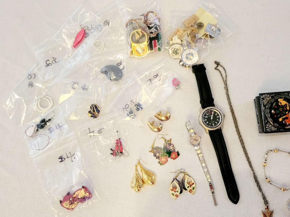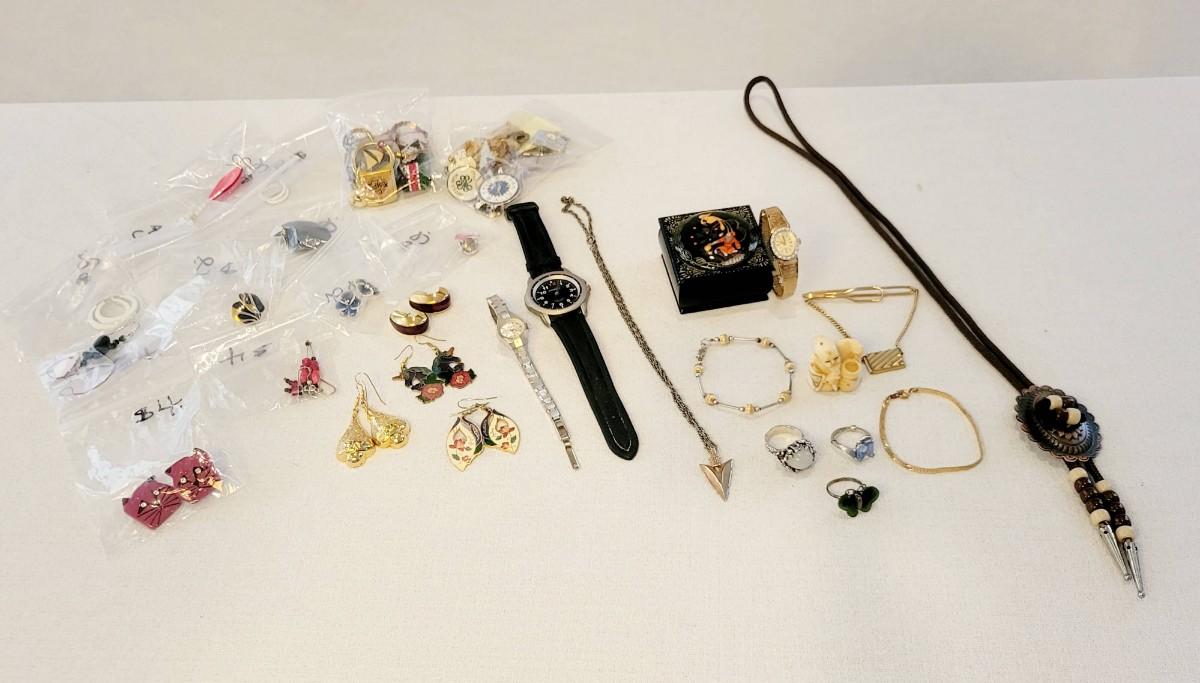 Lot of Miscellaneous Vintage Costume Jewlery including rings, watches, earrings, bracelets, bolo, necklaces, and pins.