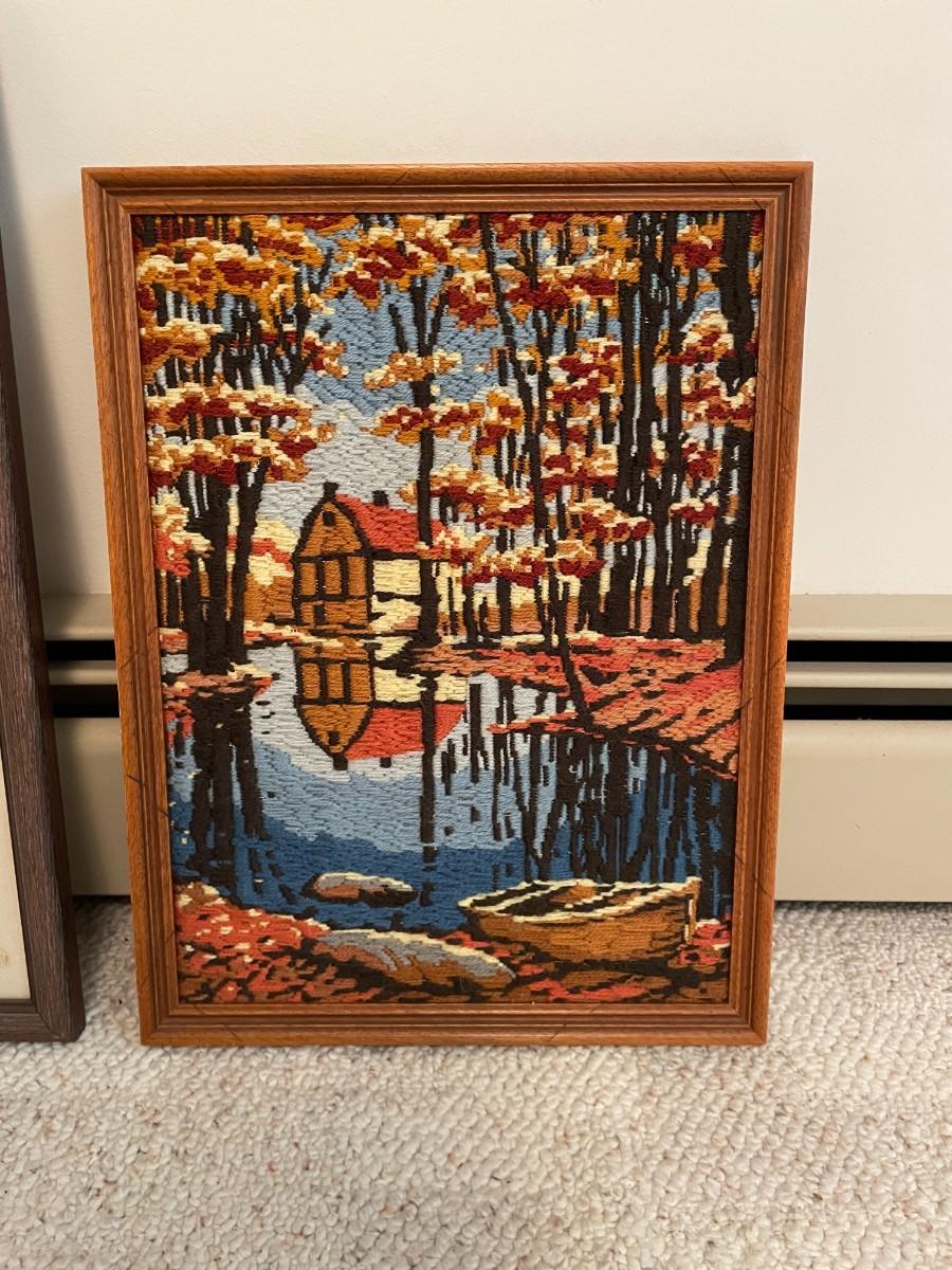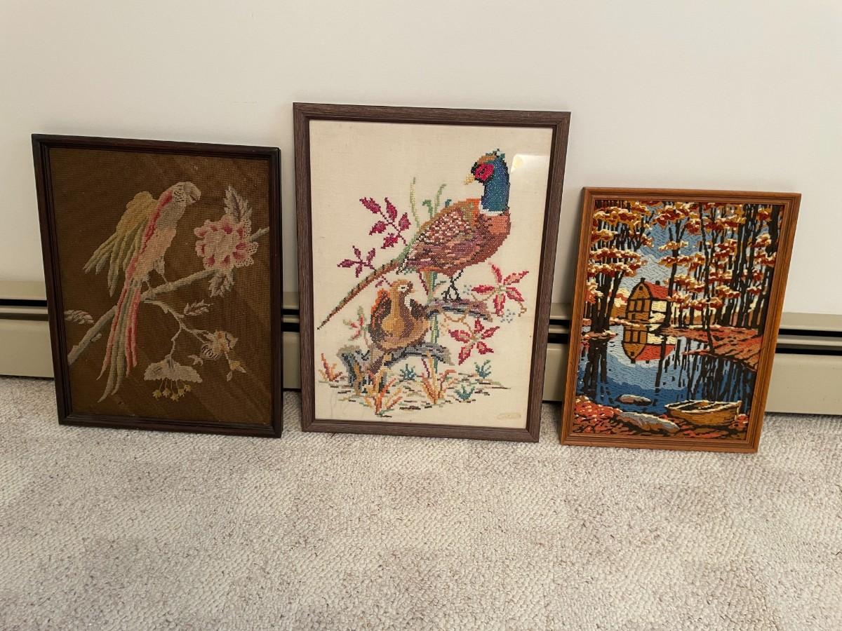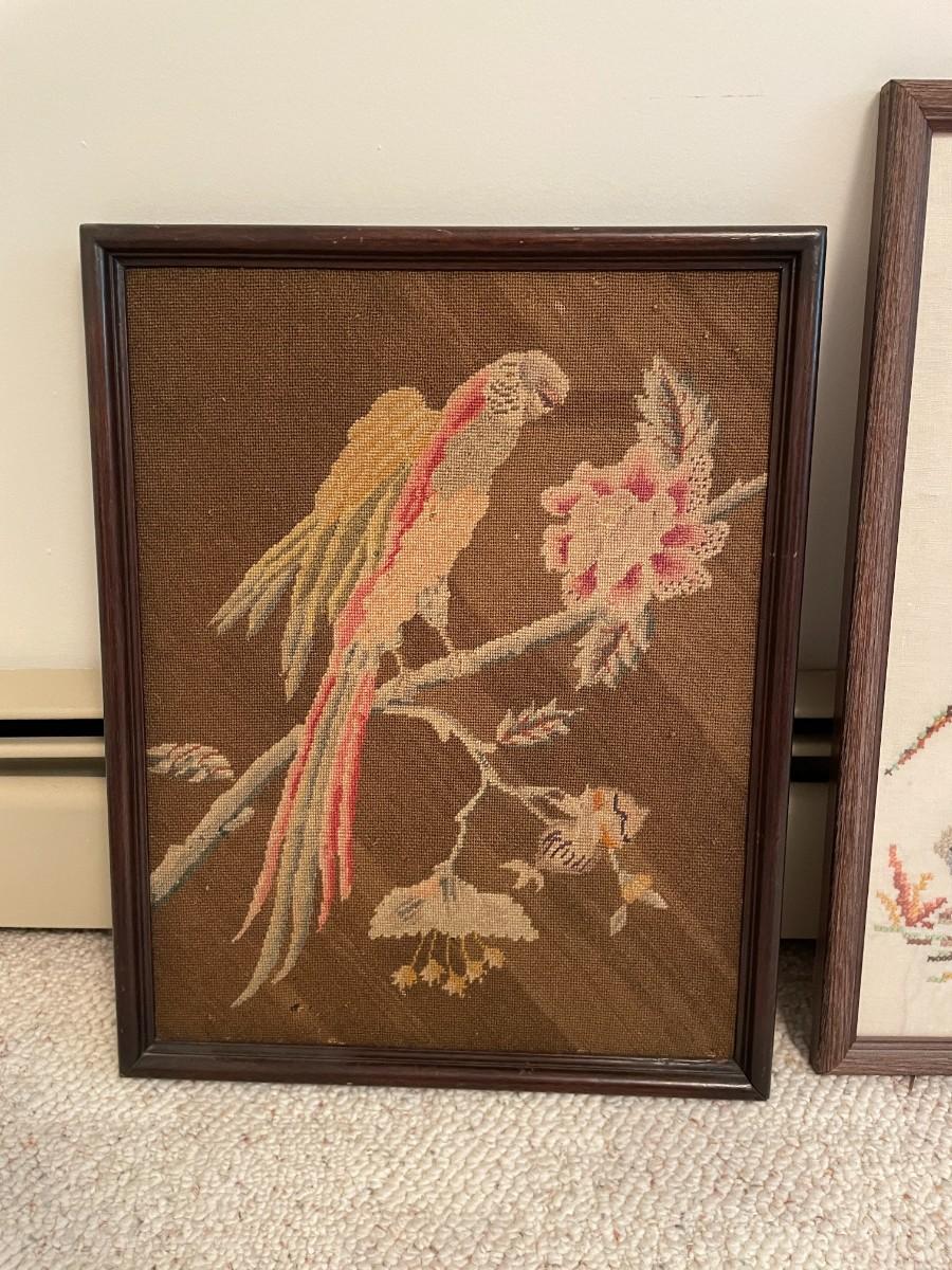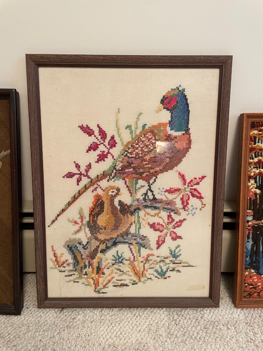 1960s Vintage Bird Pheasant Wooden Rustic Framed Art. Vintage crewel landscape Art. Vintage a Parrot Amidst Flowers art. Largest: 17W x 23H