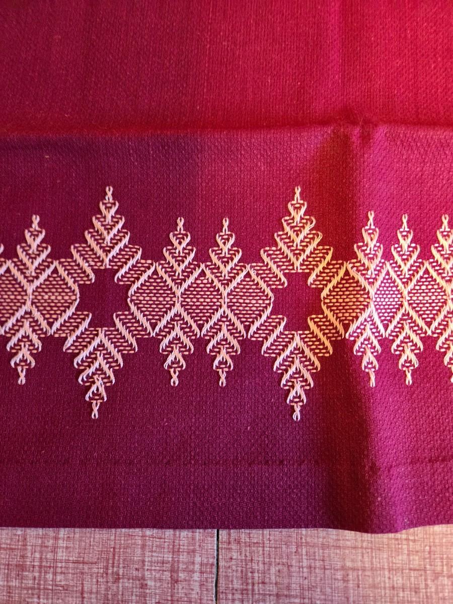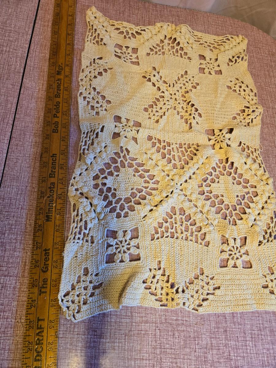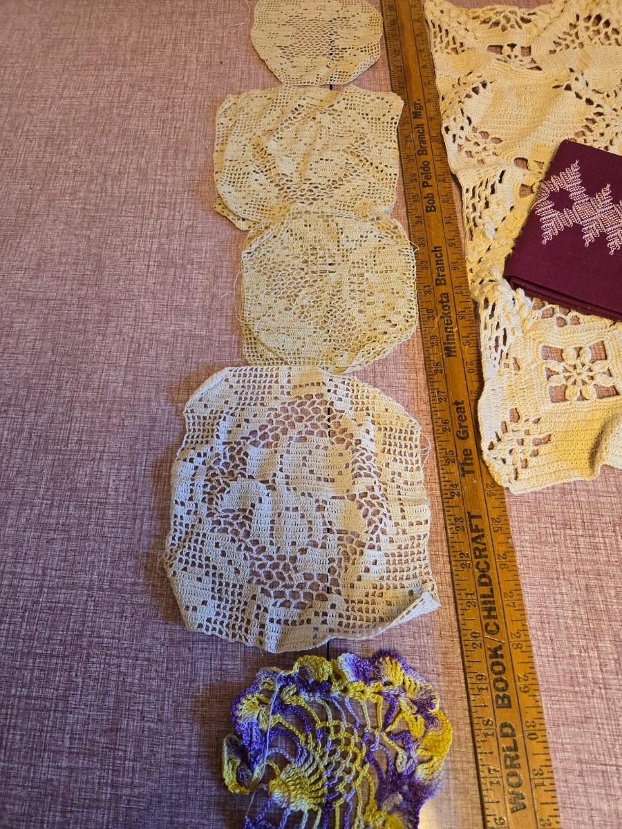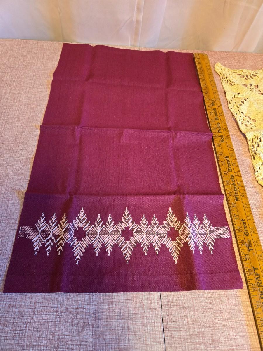 Lot includes deep maroon/purple embroidered runner 26 inches long, 22 inch crocheted ecru runner & numerous doilies.