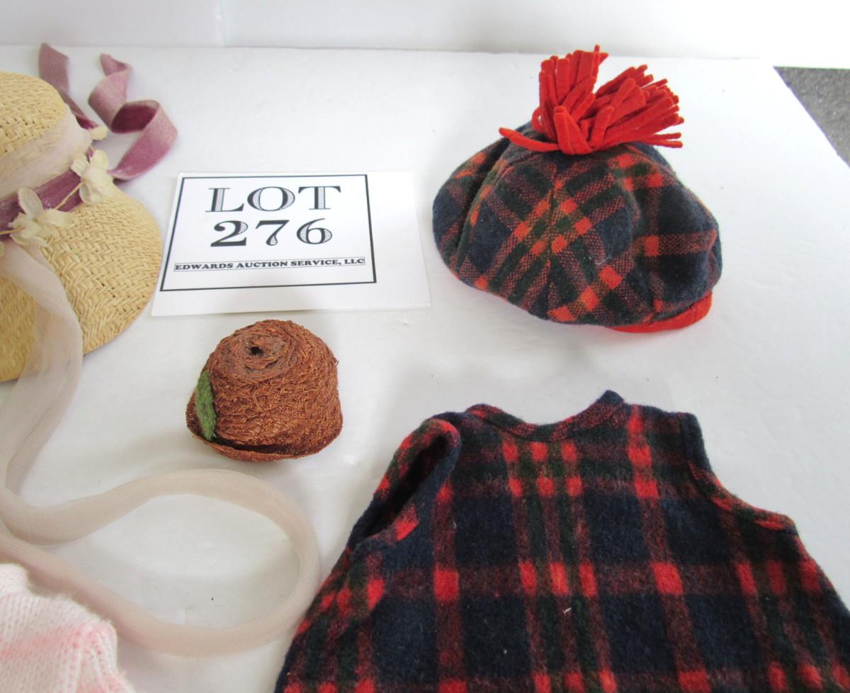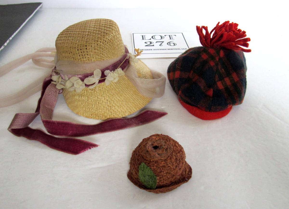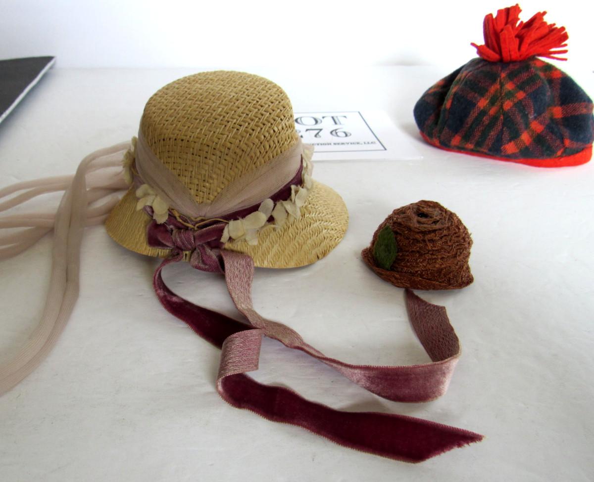 The red set was made in Italy and is in very nice shape. Tiny hat is marked Zona's and is missing some embellishments on top and/or side. Straw hat unmarked but nice shape. Pink fuzzy top is ok but a few straggling threads here and there. Shipping is available at cost plus $5.00 per box handling and supply fee. See our terms. All sales final.