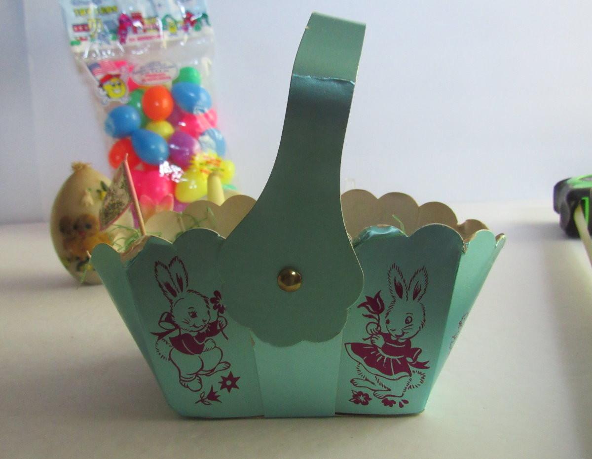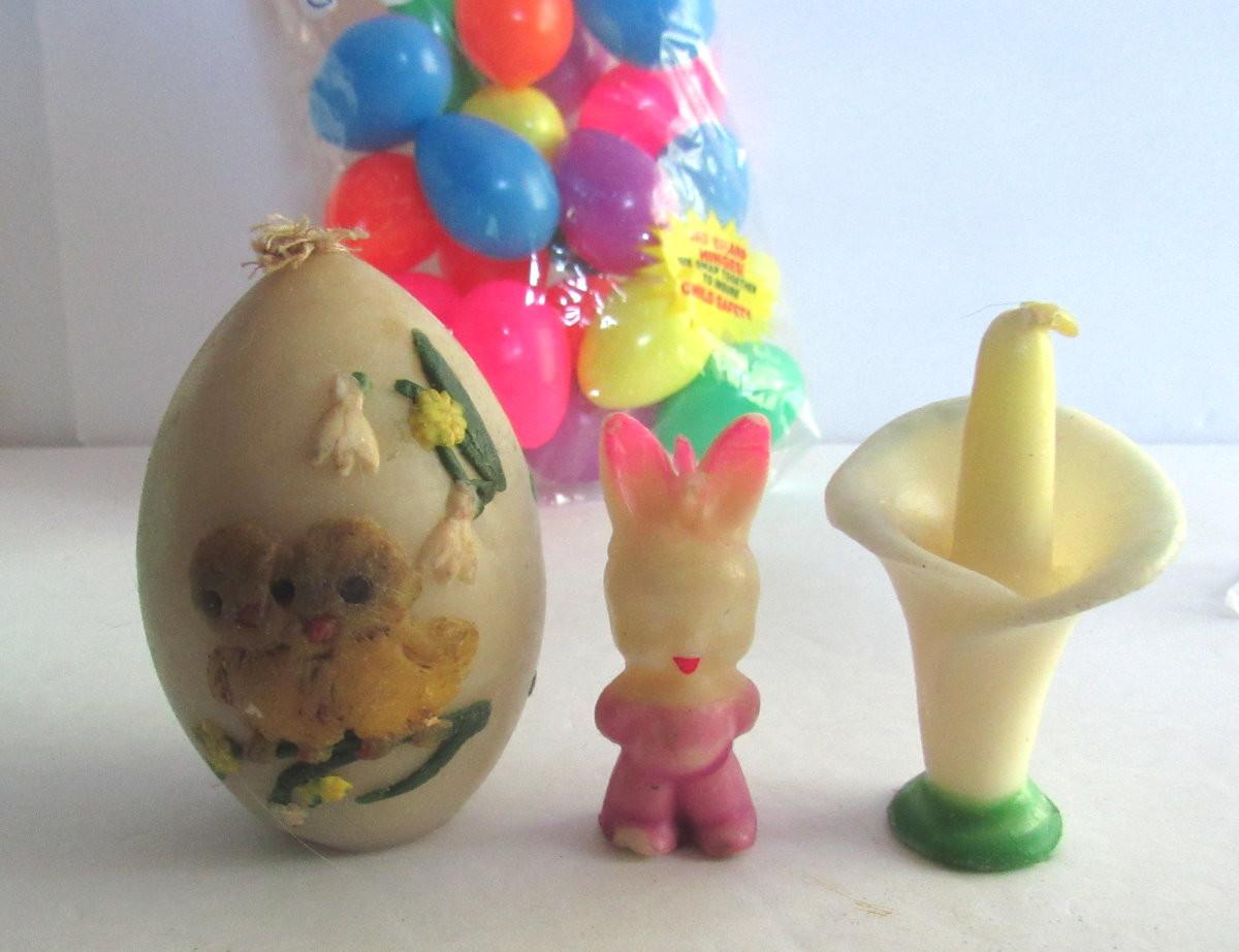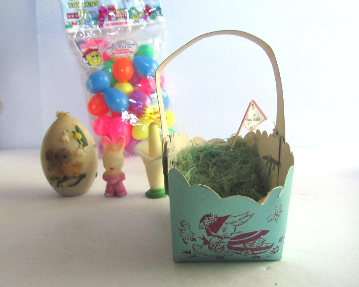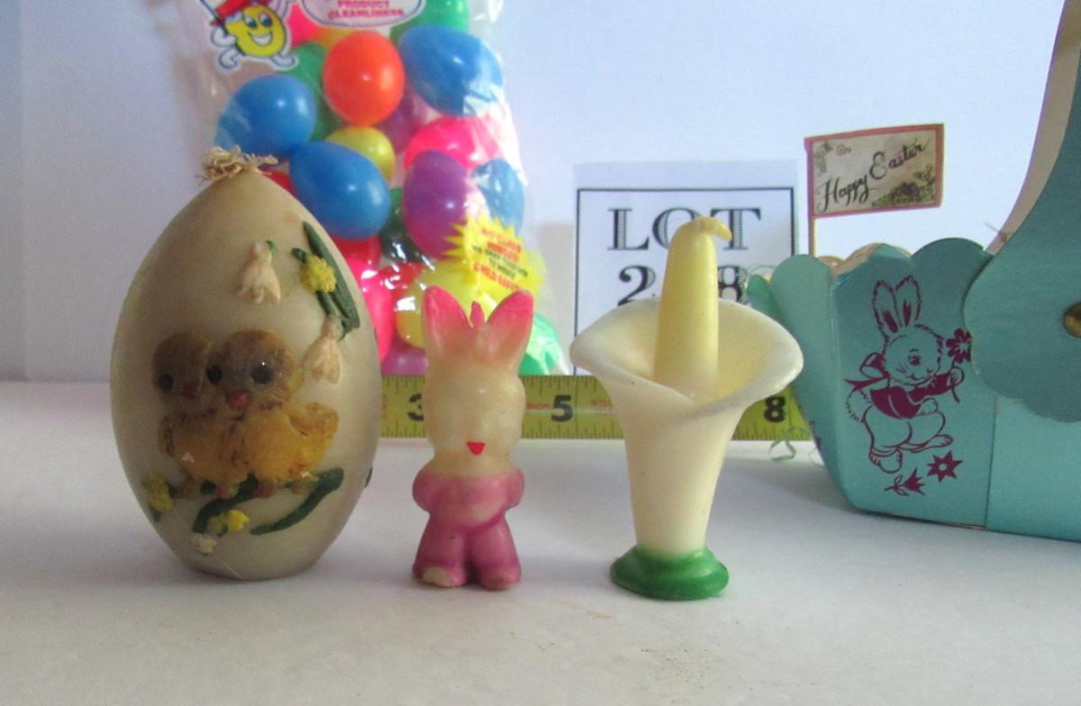 The basket has wear but is just adorable! The rabbit candle has a chip on foot. The egg candle has wear and darkening, unmarked. Little plastic eggs are unused. Shipping is available on this lot with additional shipping and handling fees. See our terms for details.