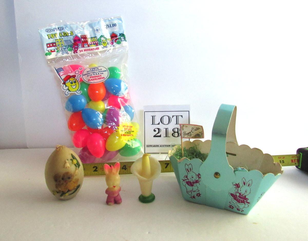 Lot of Vintage Easter Items: Gurley Candles, Cardboard Basket, Eggs