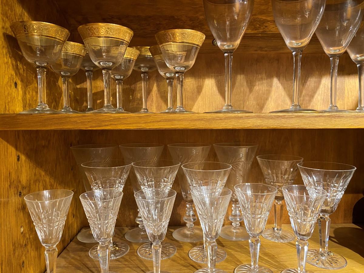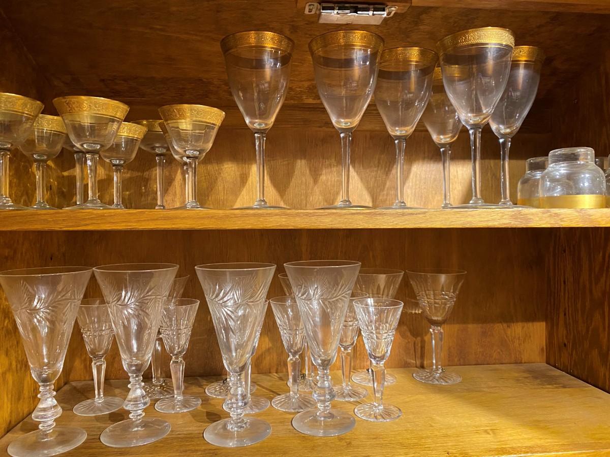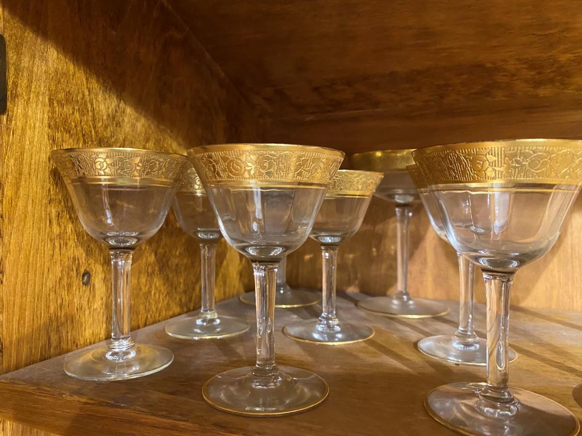 Lot of Vintage Entertaining Wine Champagne Glasses. Some are gold rimmed, and others are cut crystal. In very good condition.