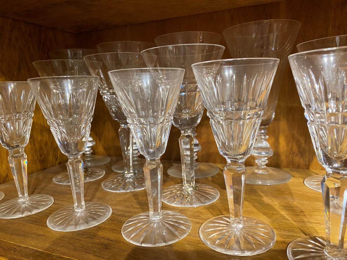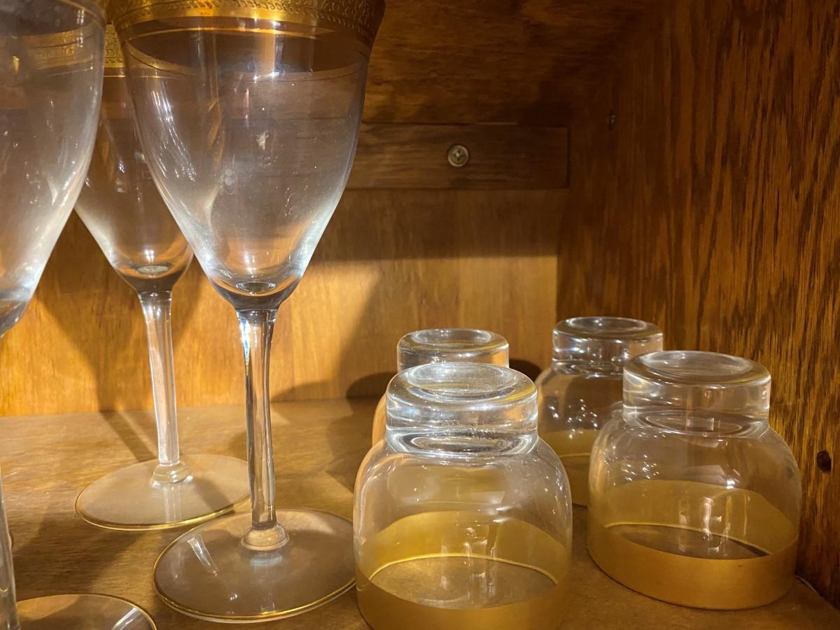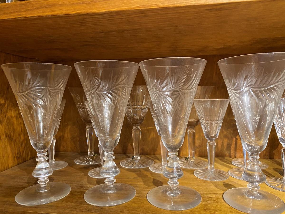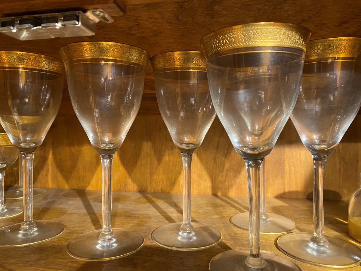 Lot of Vintage Entertaining Wine Champagne Glasses. Some are gold rimmed, and others are cut crystal. In very good condition.