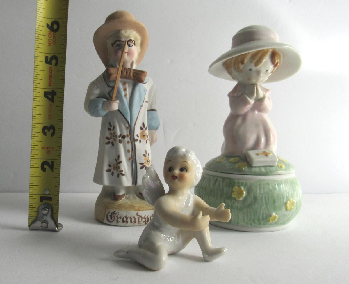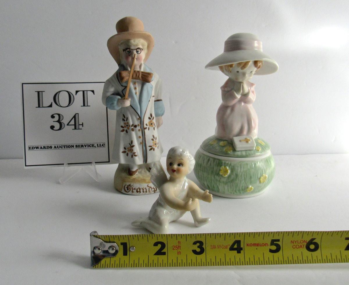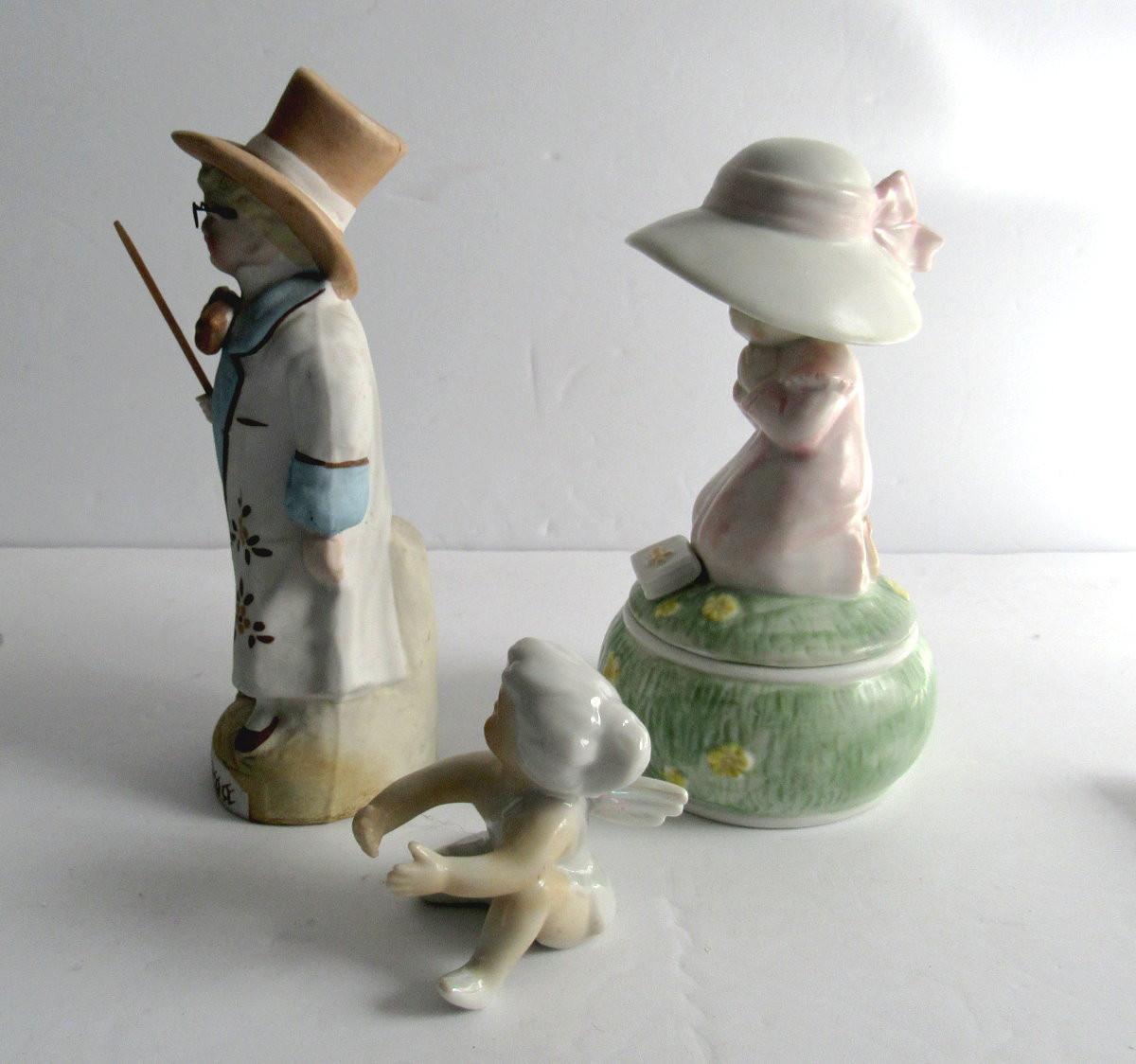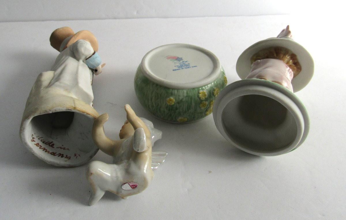 Lot of Vintage Figurines: German Bisque Boy, Japan Porcelain Angel Candle Climber, Enesco Trinket box