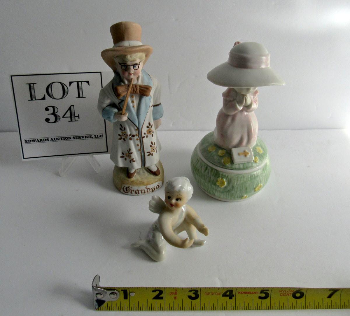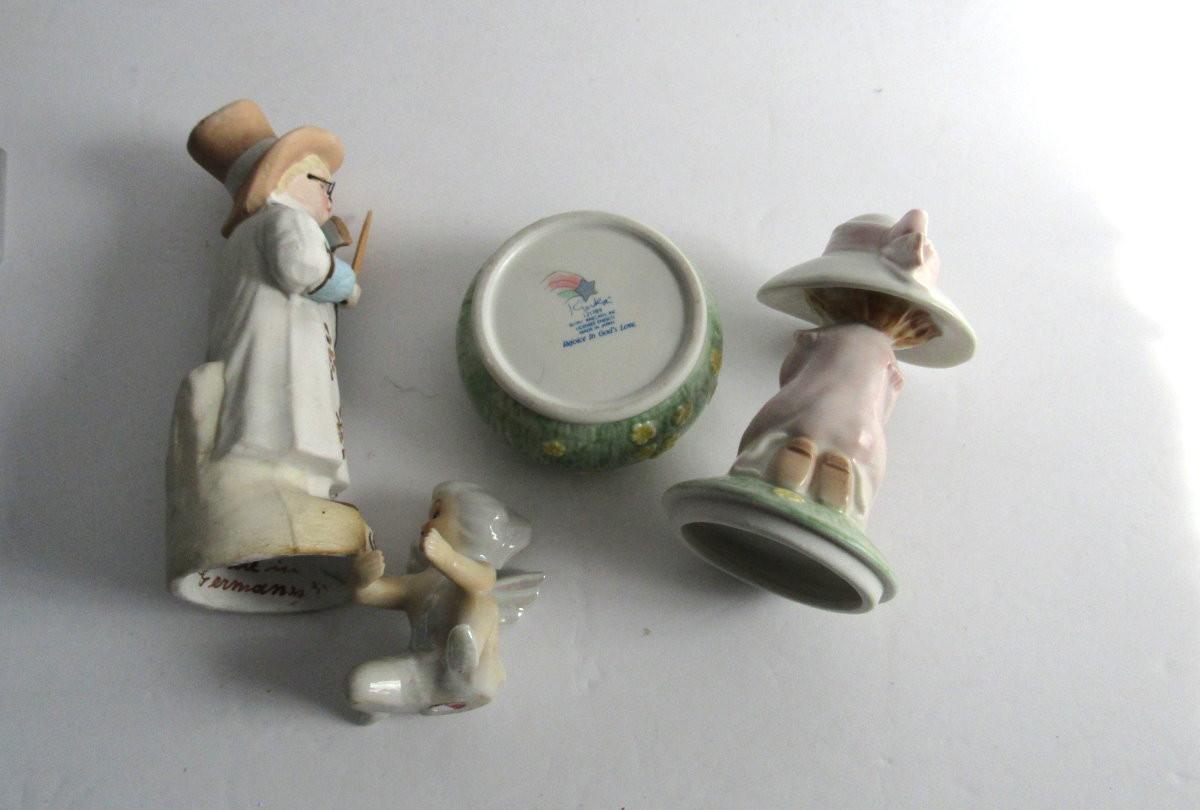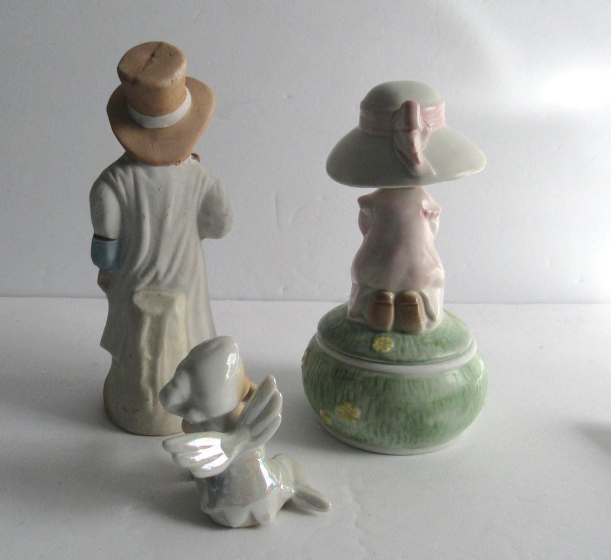 Lot of Vintage Figurines: German Bisque Boy, Japan Porcelain Angel Candle Climber, Enesco Trinket box