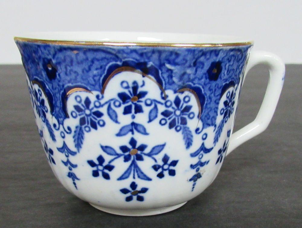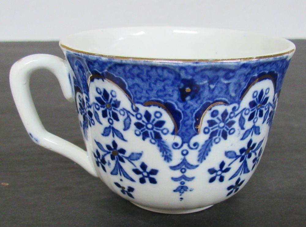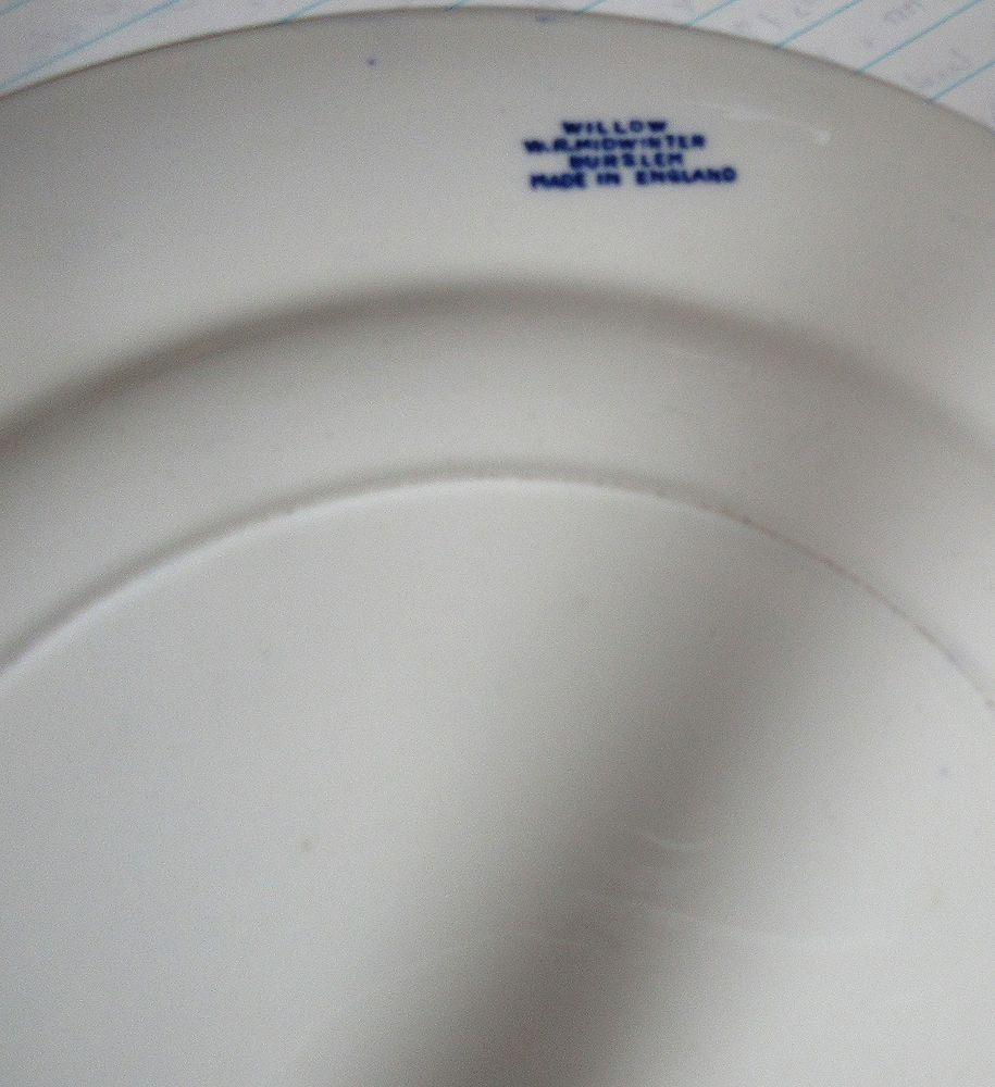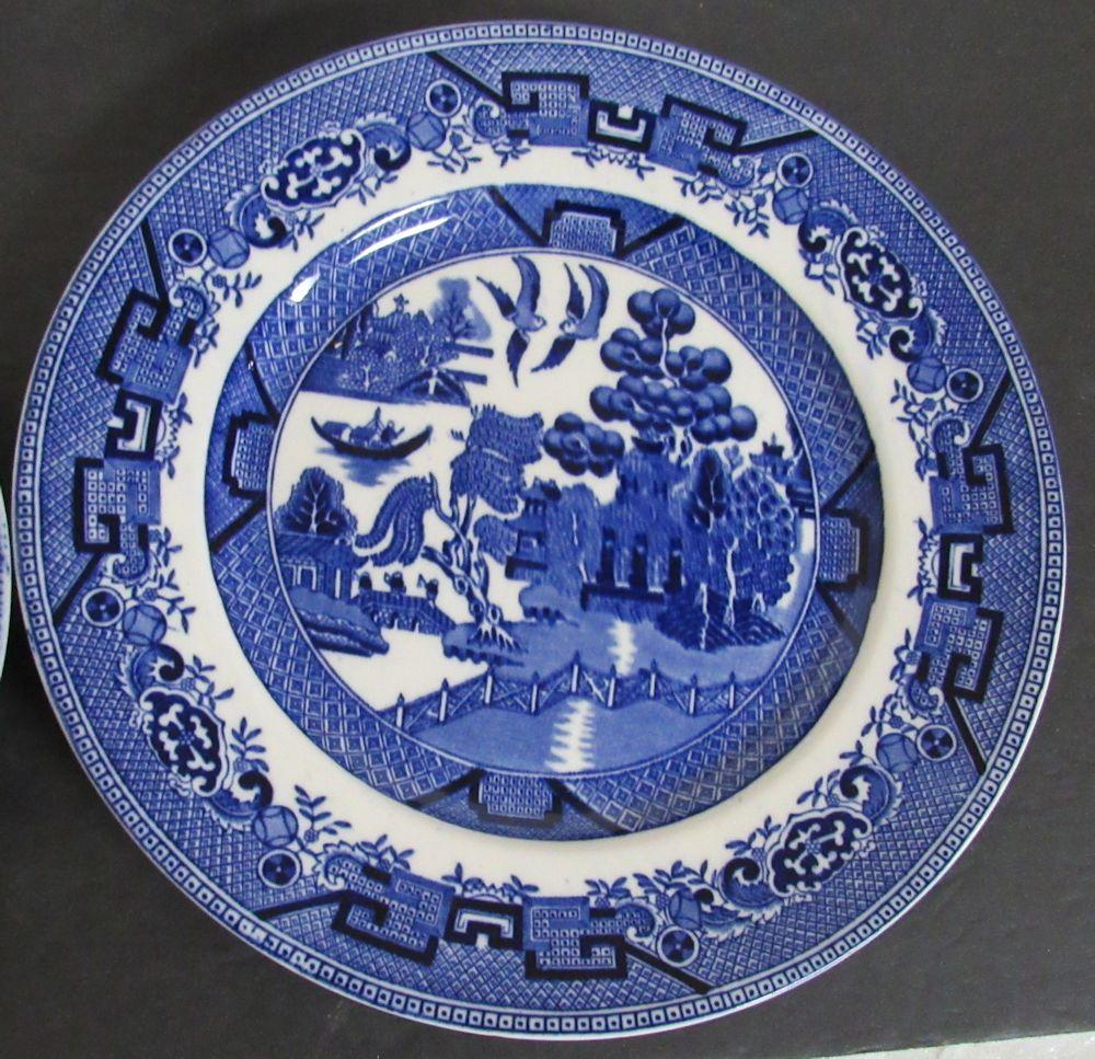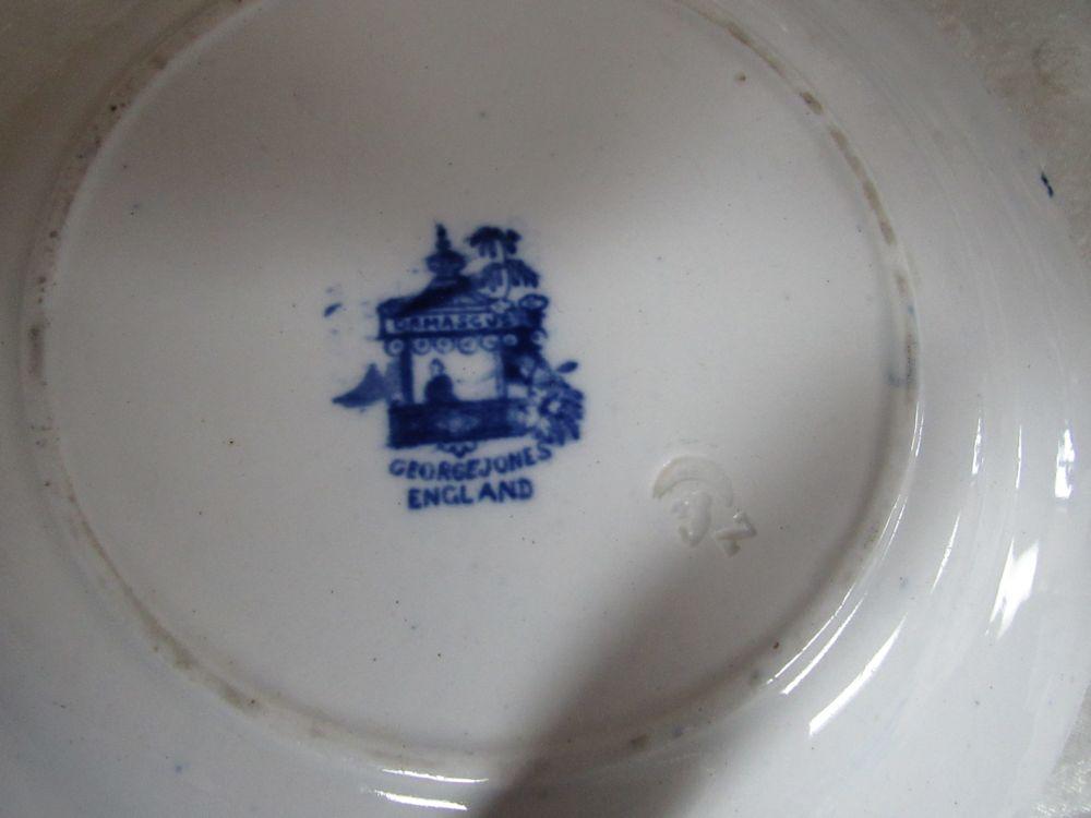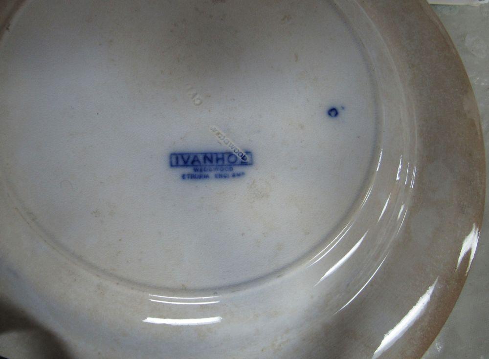 Ivanhoe is by Wedgwood, Etruria, England, Blue Willow is by Burslem, England, the Damascus plate is by George Jones, England, and the flow blue cup is unmarked. All in good shape, but the Ivanhoe plate has brown spotting on the rim and back side as seen in photos, but this is quite old. Shipping is available at shipping cost plus $5.00 handling fee on up to 8 lots, $10.00 handling fee on 9 or more lots or two boxes. This box will be at least 5 lbs.