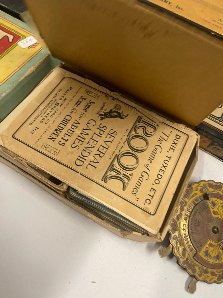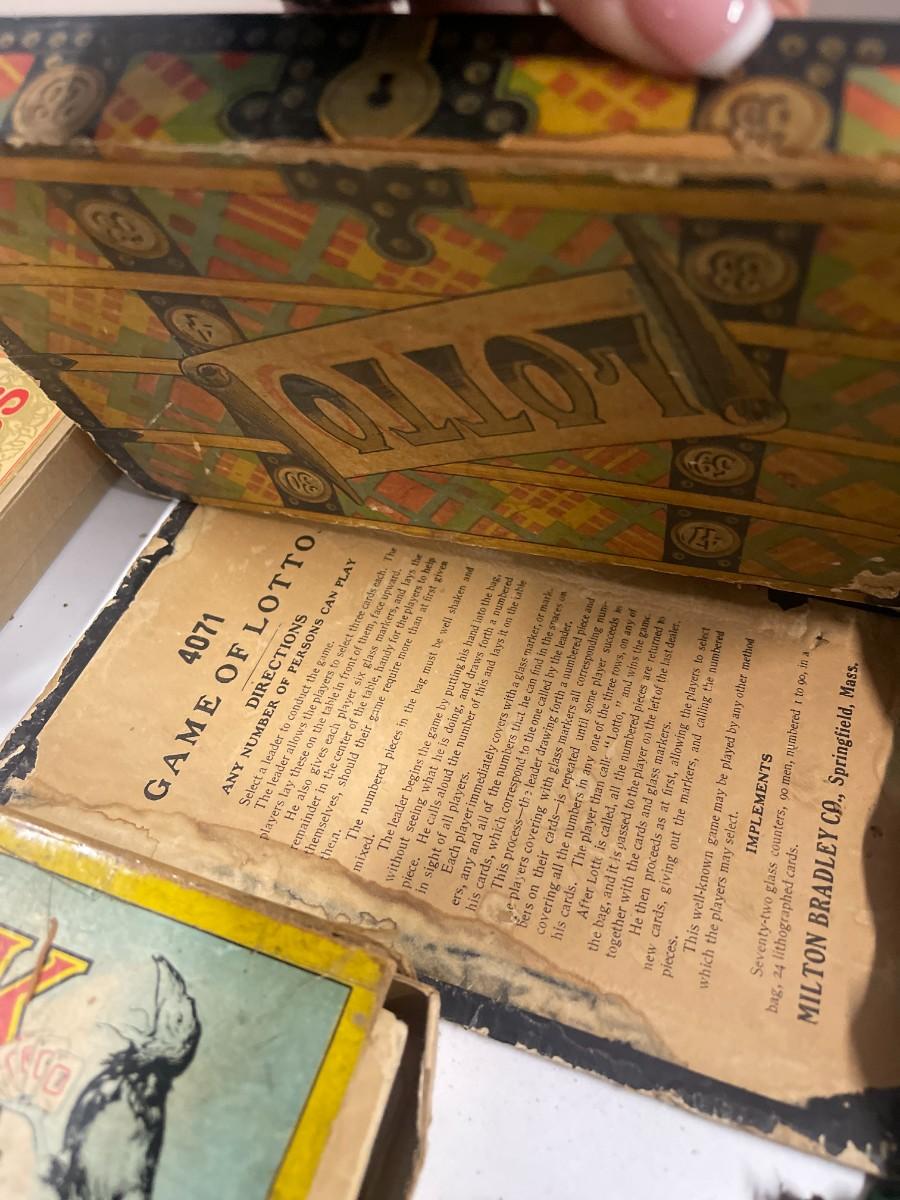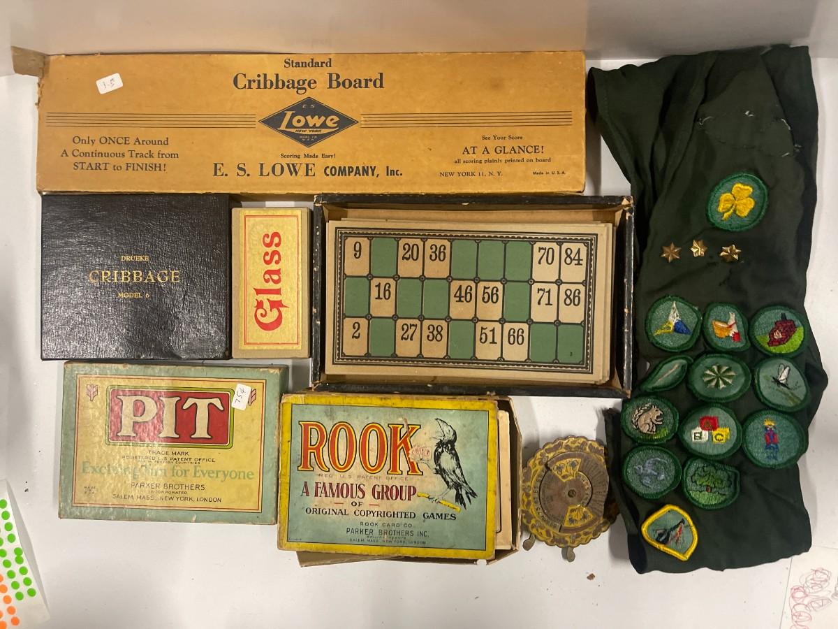 Lot of vintage games and girl scout sache with patch badges. All in various conditions from poor to good.