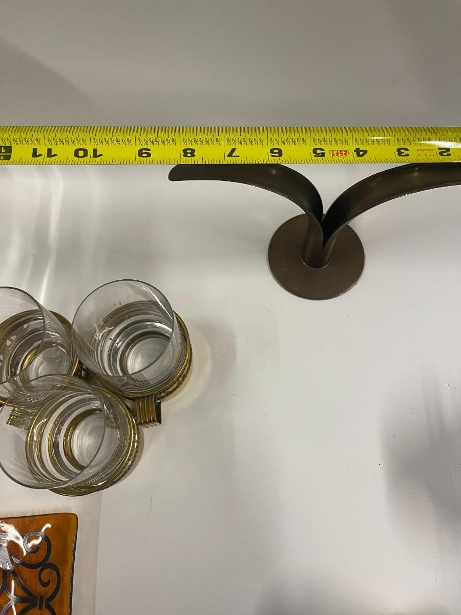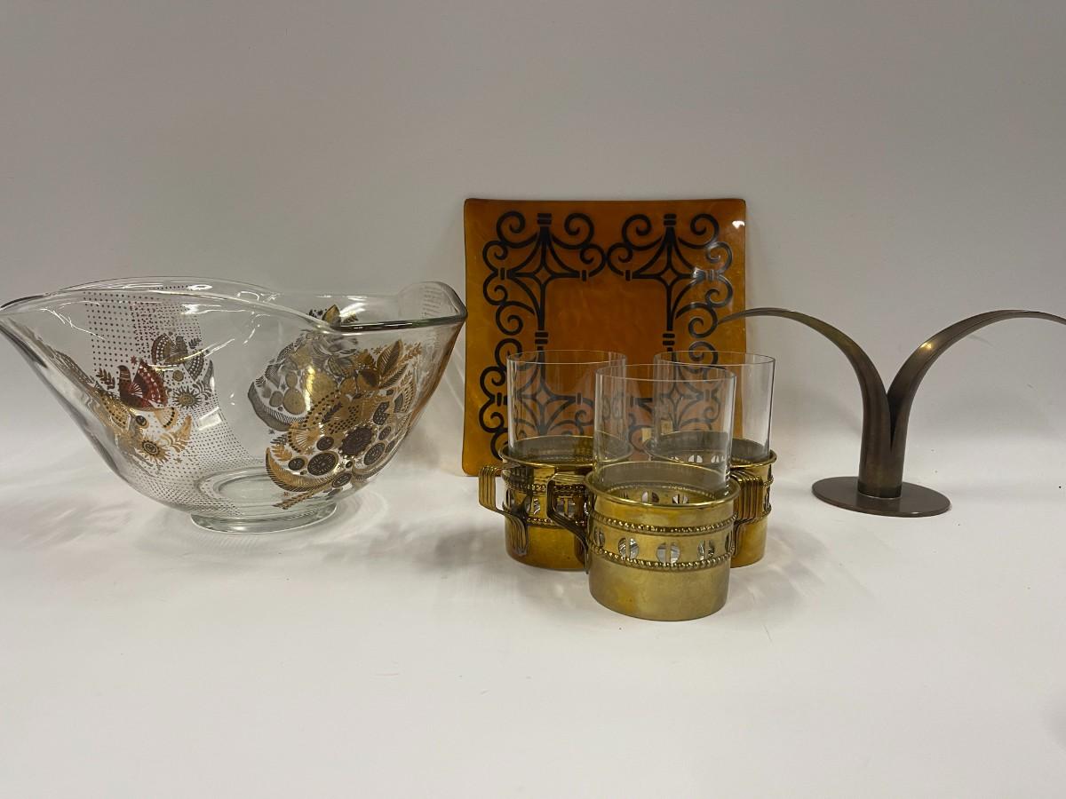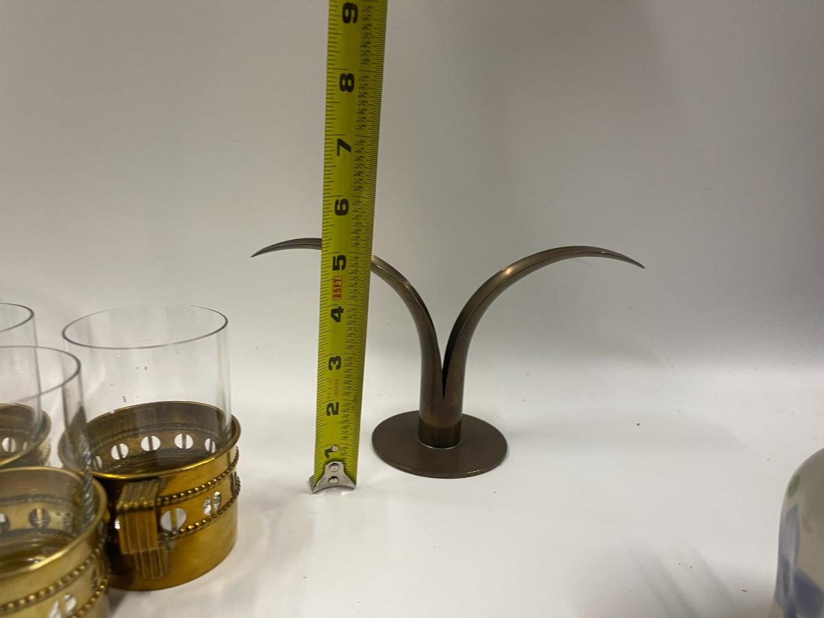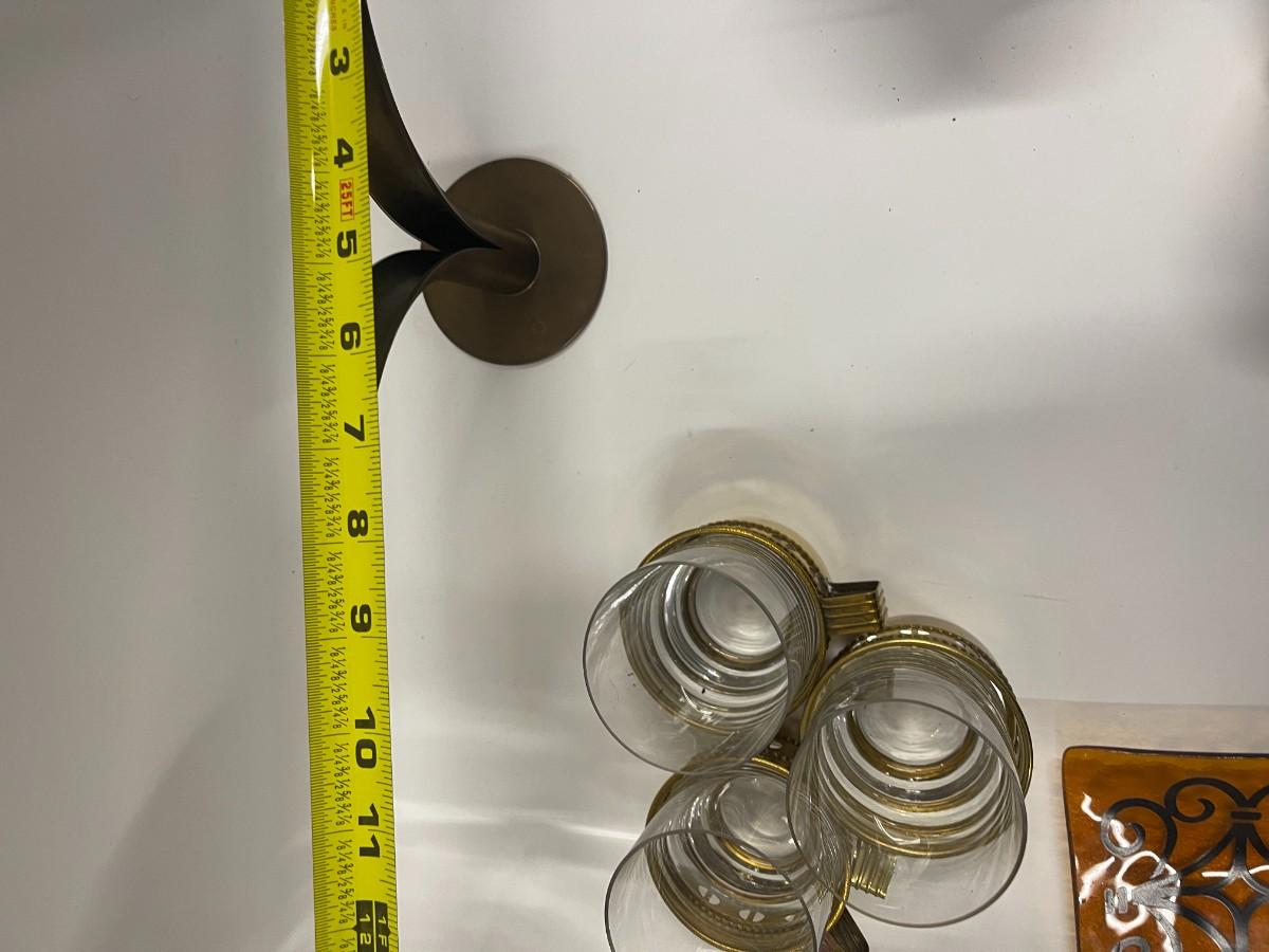 Lot of Vintage Georges Briard Glass, Ystad Candlestick & Glass Teacups With Metal Holders