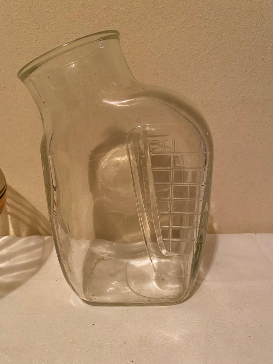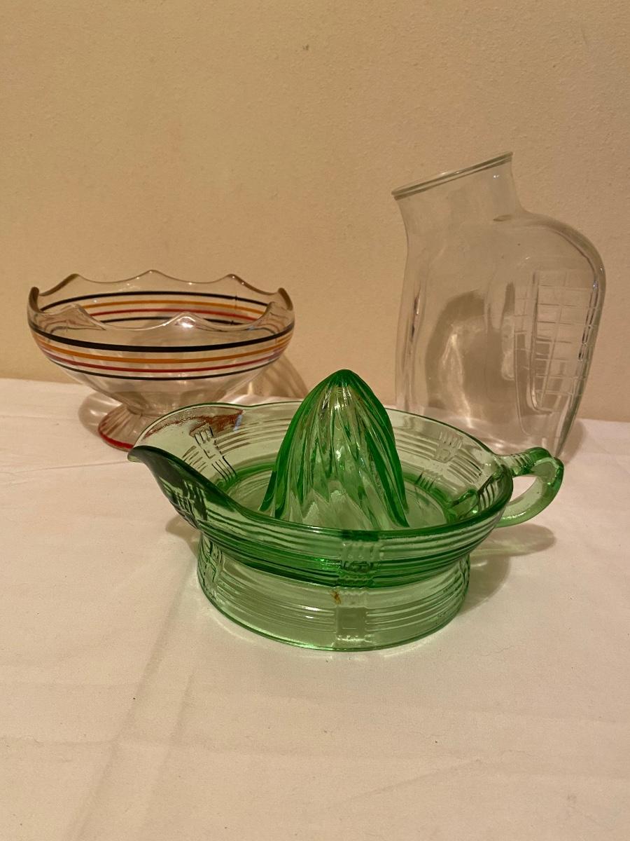 Lot of vintage glass items. Green citrus juicer, glass refrigerator bottle and striped footed bowl. Pitcher is approx 5-1/2h x 6w. All in very good vintage condition