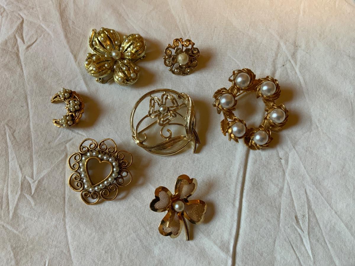 Nice lot of vintage pins. Sarah Coventry and Coro are 2 of the makers mark. Please see photos for condition.