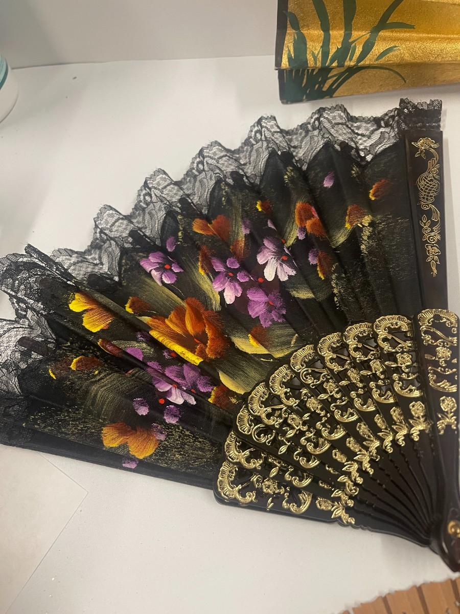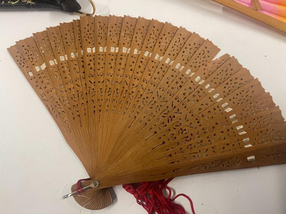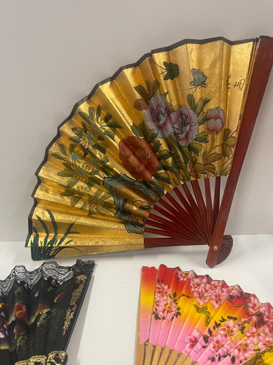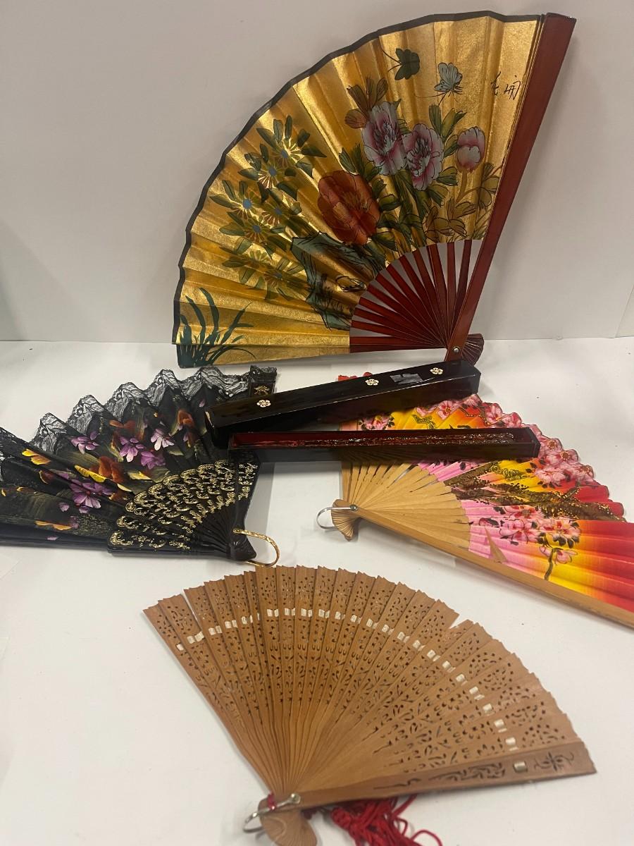 Lot of vintage hand held fans, includes 3 hand painted fans and one carved fan. The carved one seems to have a damaged piece. Examine photos carefully for condition. Lot also includes a pair of chop sticks.