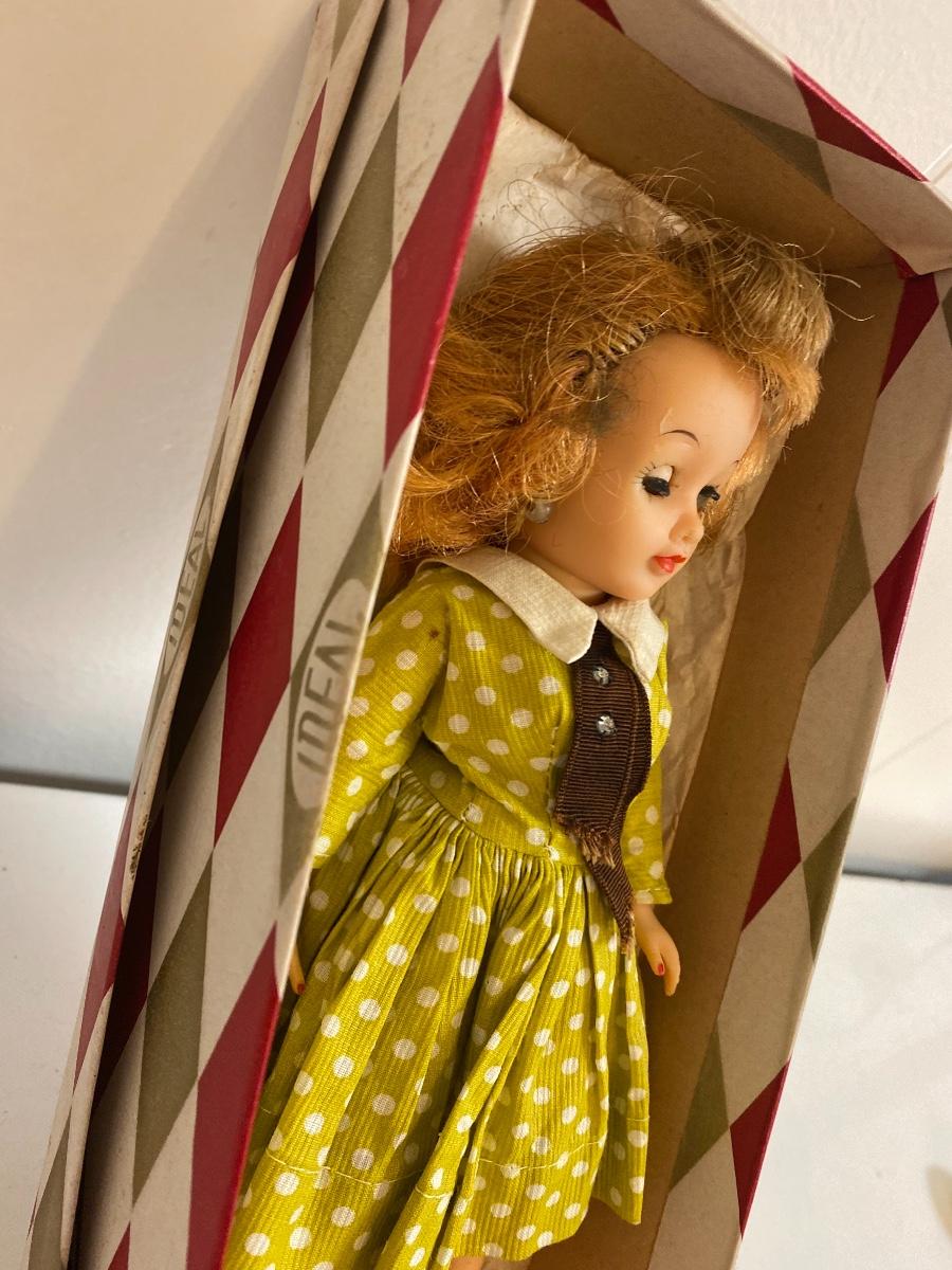Vintage Little Miss Revlon doll by Ideal Doll VT 10 1/2”, dressed in original outfit, green polka dotted dress, bra, panty girdle, with earrings, no shoes. In good vintage condition, including original box and 2 brochures.