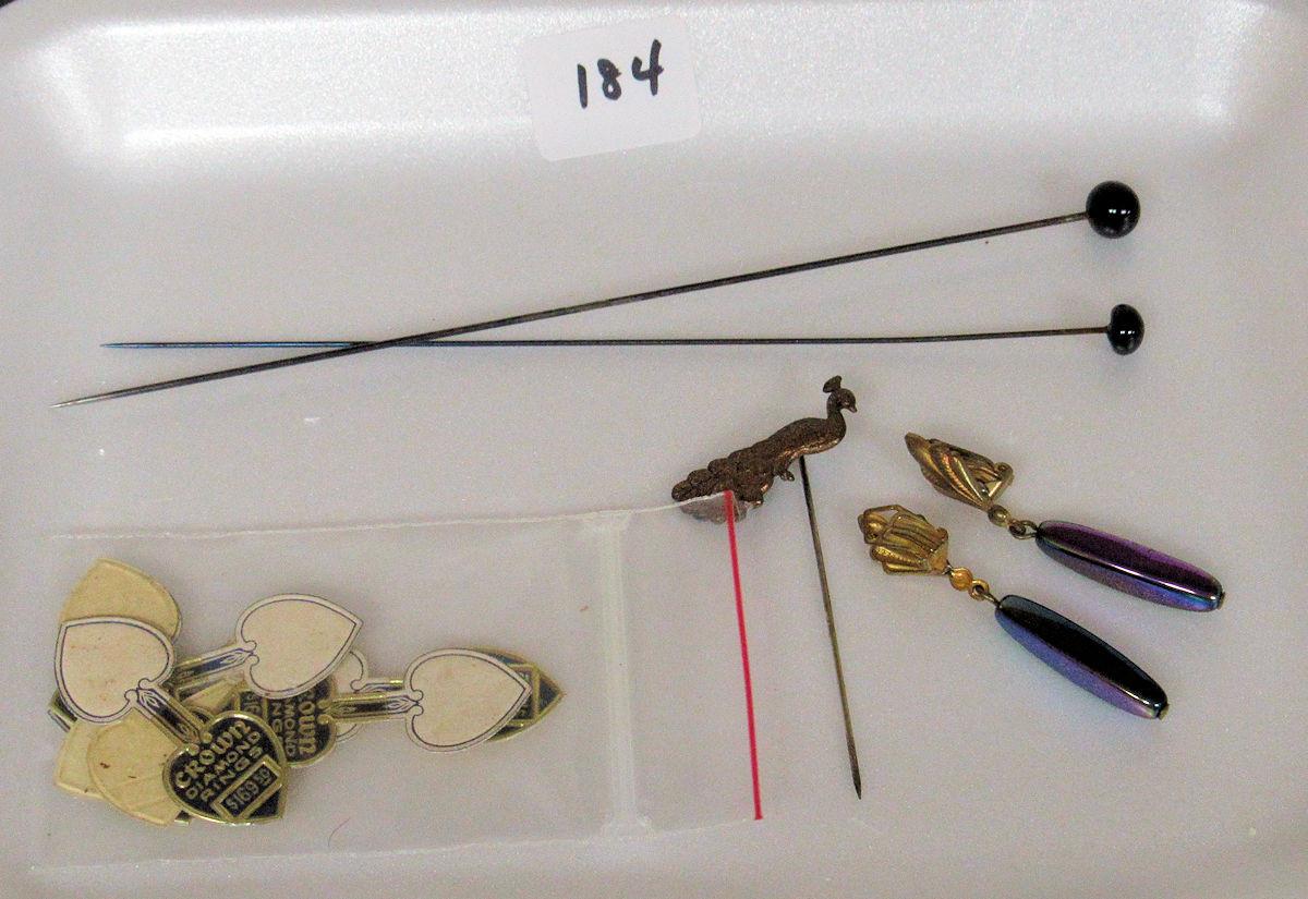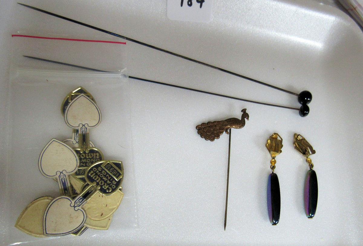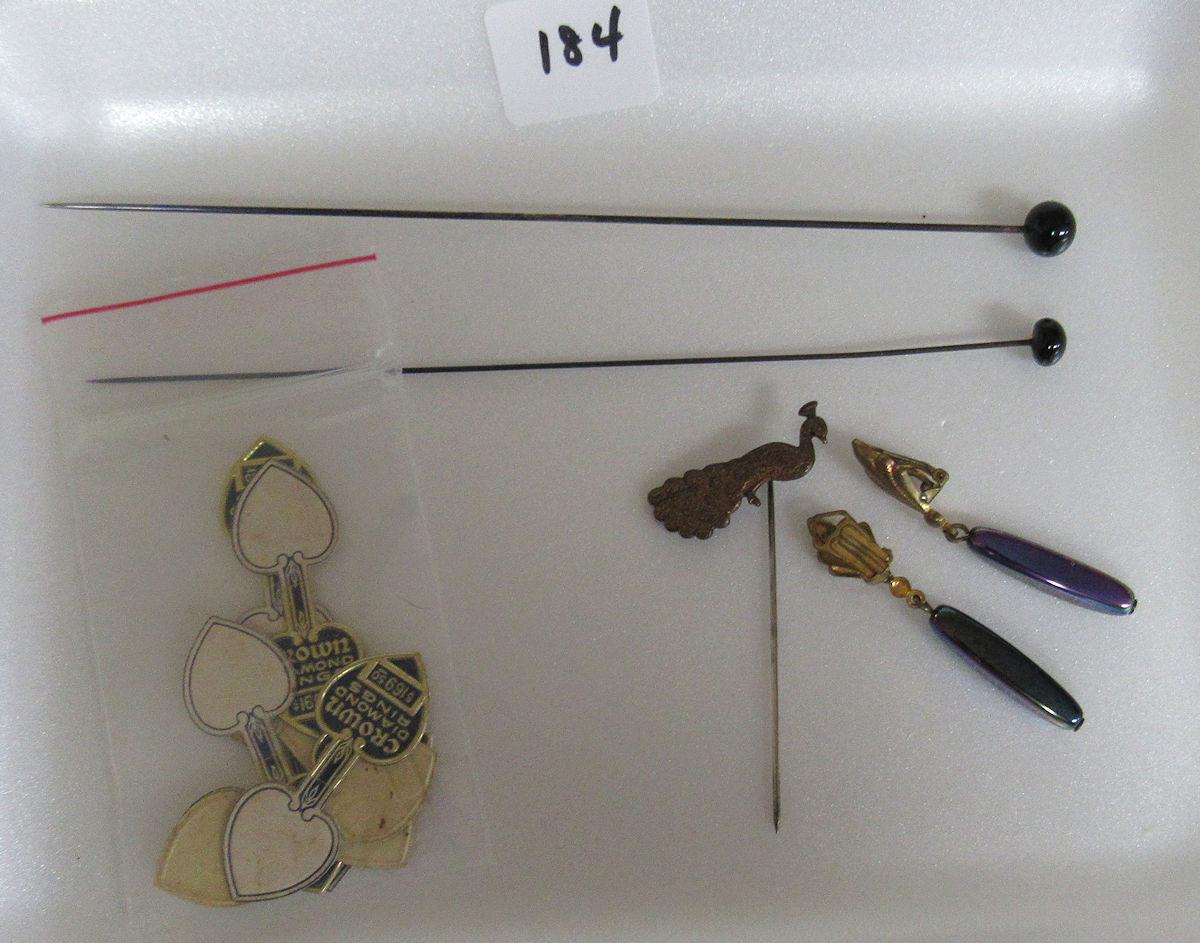 2 Old Black Glass Hatpins, 1 Peacock Stick Pin, Pair Irridescent Earrings, and Old Jewelry Tags for Crown Diamond Rings