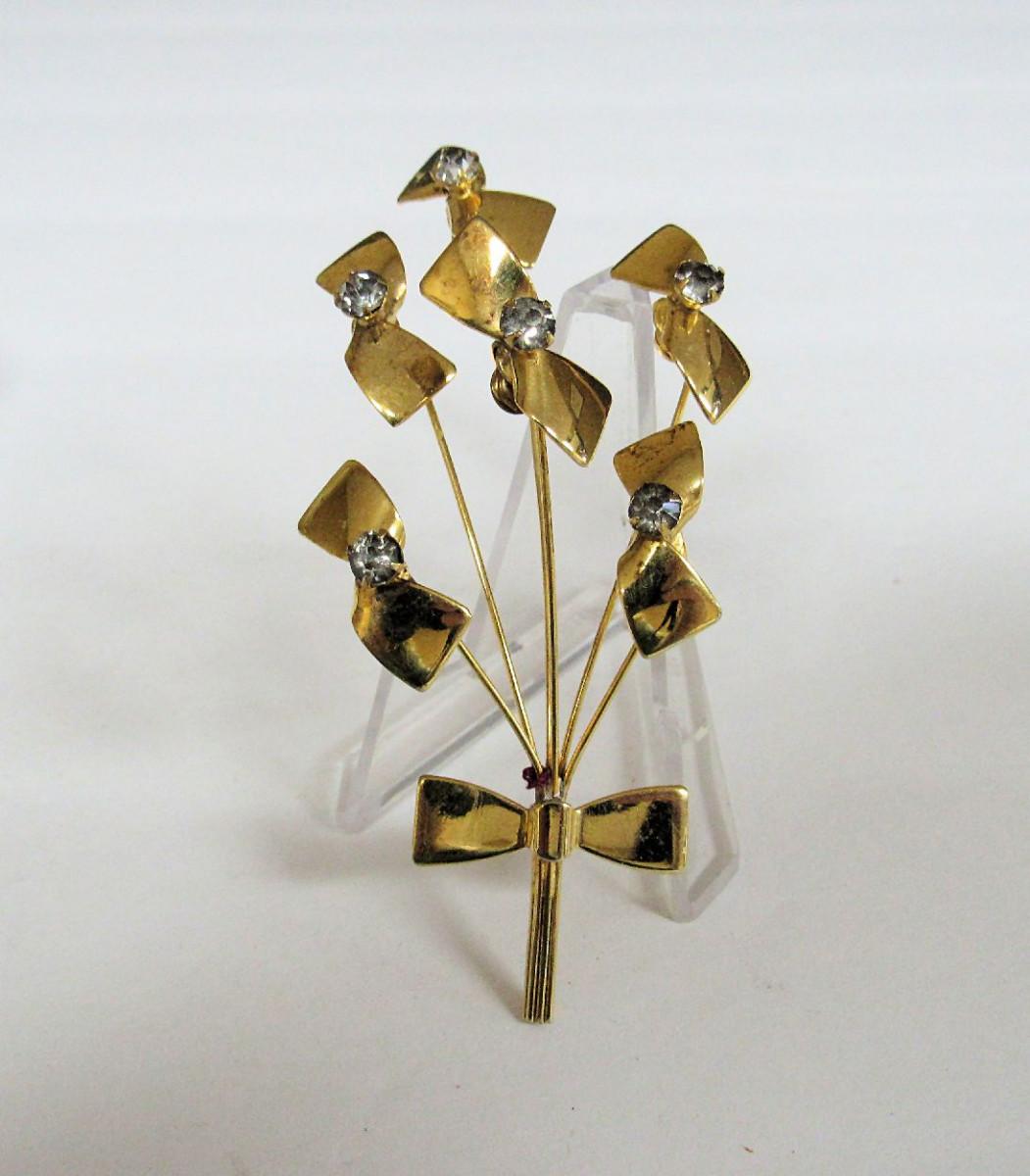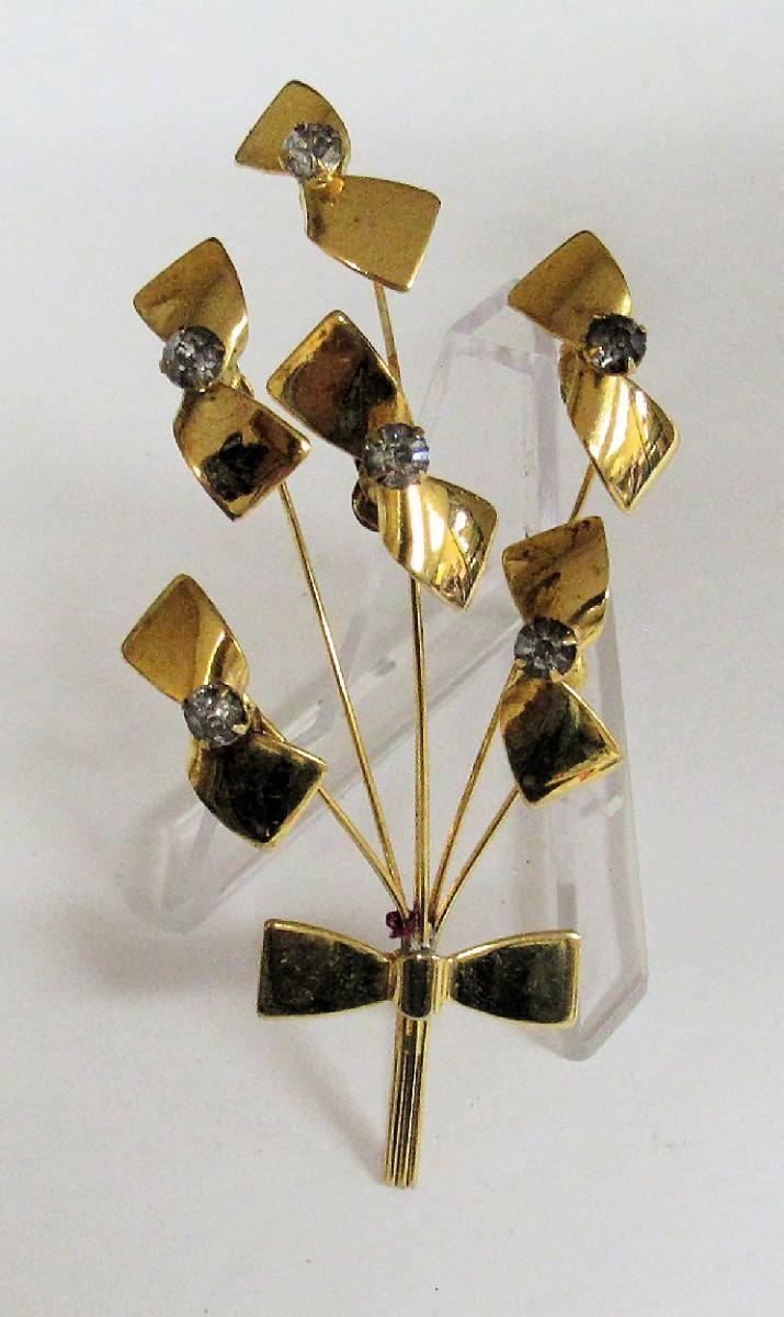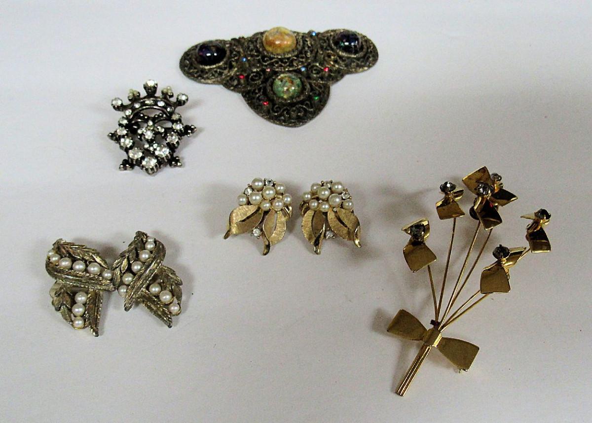 Minor wear on some. The pin is starting to tarnish in spots, but is just really pretty. The gold/rhinestone earrings are Trifari. We did not check the stones for chips or looseness. Shipping is available at shipping cost plus $5.00 handling fee on one box, $10.00 handling fee on two boxes, $15.00 handling fee on 3 boxes. Helps cover shipping materials and labor cost. You will receive exact item as pictured, no refunds, returns not accepted. Do not bid if you do not intend to pay for your lots or the shipping/handling fees.