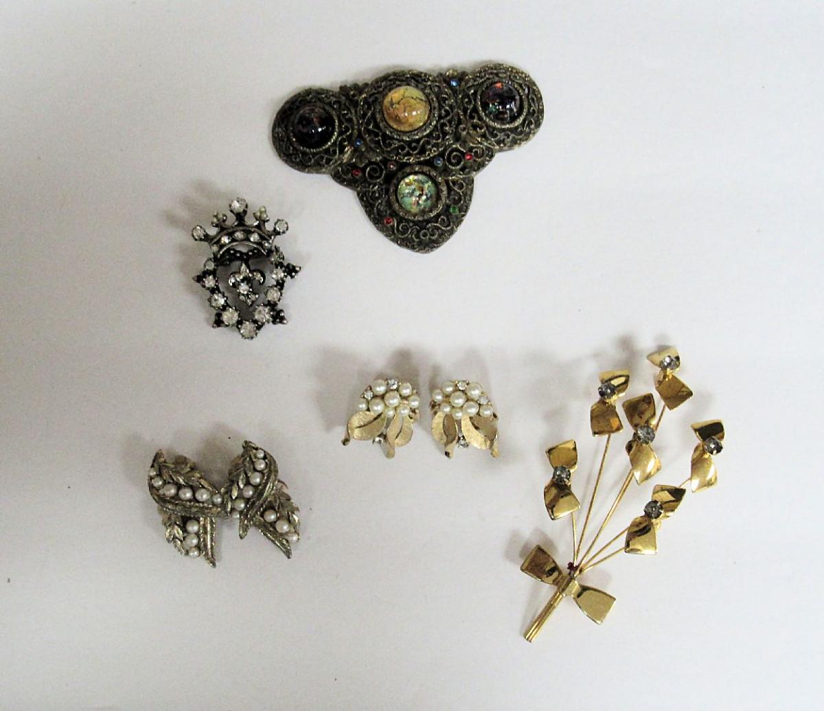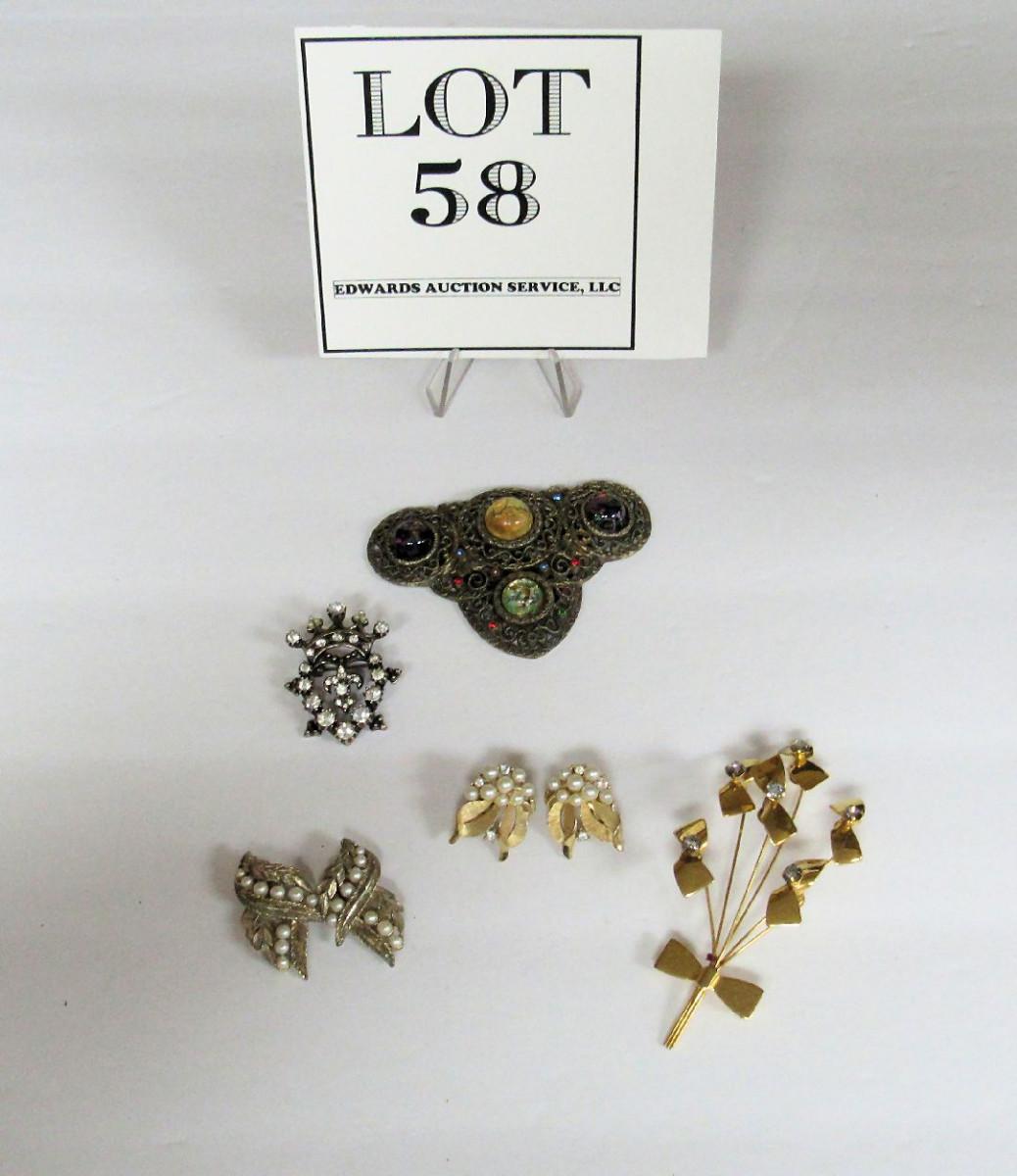 Lot of Vintage Jewelry, Brass and Stone Clip, Earrings, Nice Pin