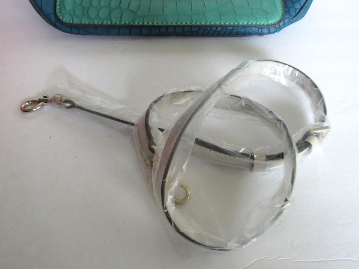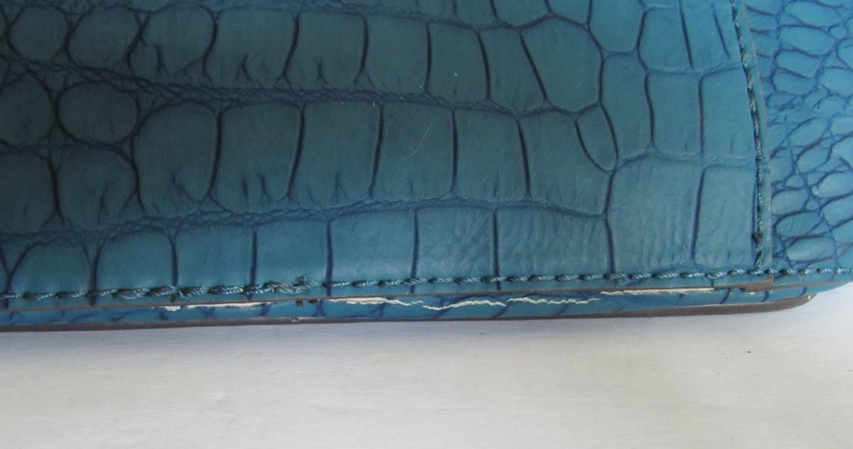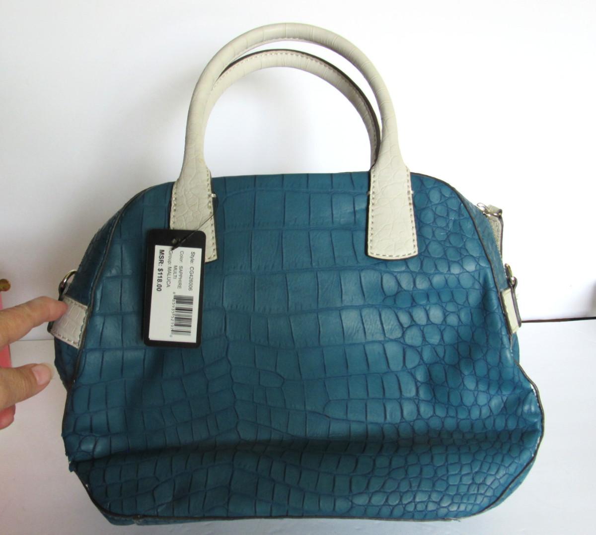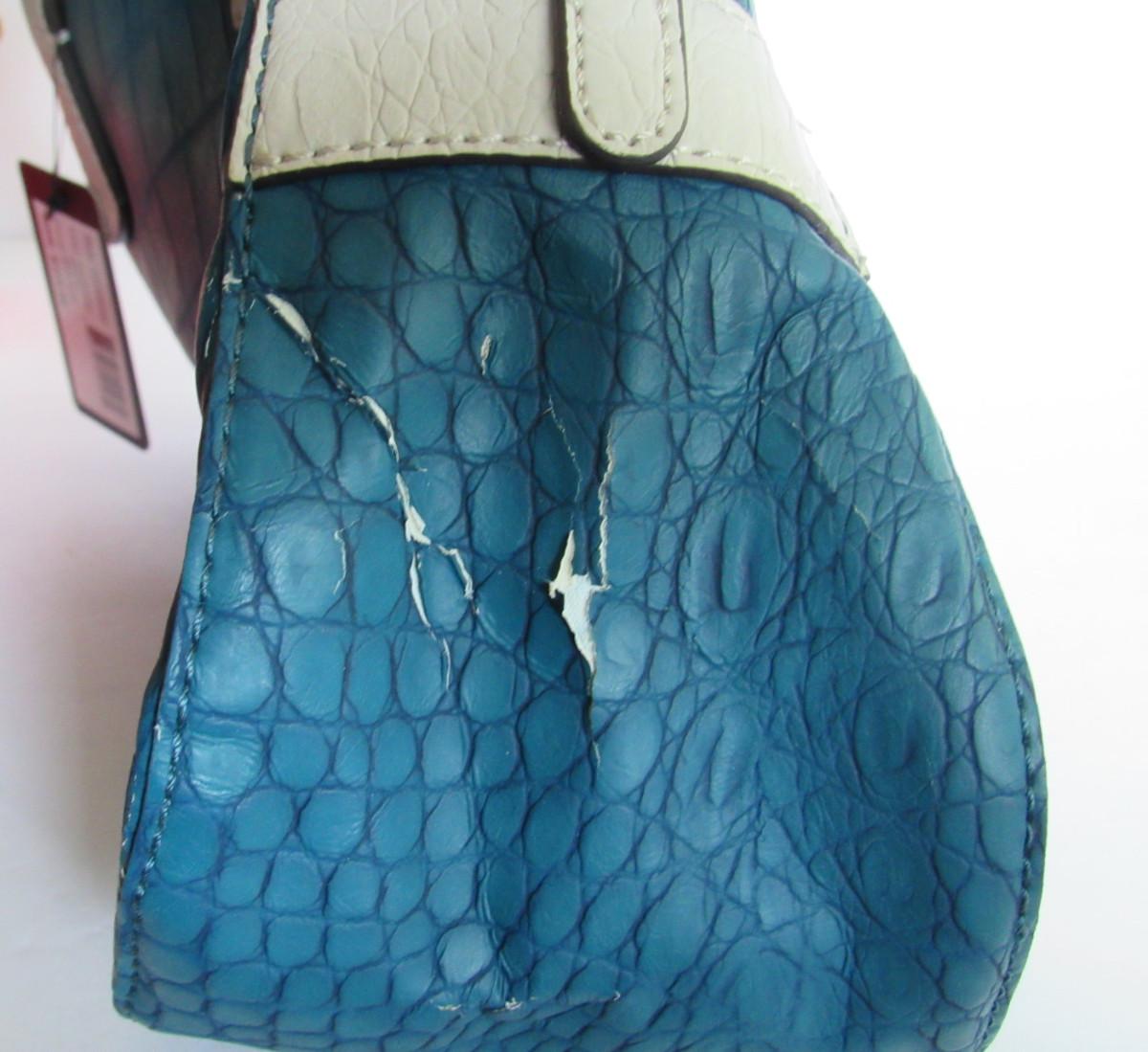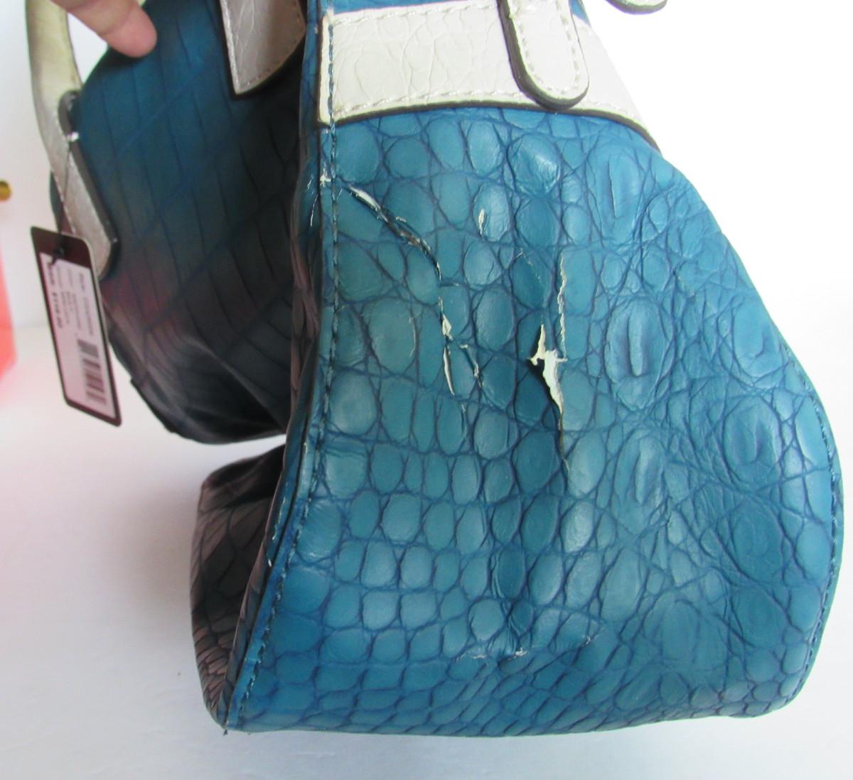 This handbag has never been used, but it is not perfect. See all photos. It has a lot of little surface tears on the dark teal sides and bottom seam. Have no idea what happened to it since it still has its original price tag on it and was never used. The film was never removed from the hardware. I am wondering if the lady's cat scratched it up some how? Anyway, it is still very usable, great zippers and hardware, good solid straps. Nice pockets. Includes extra long shoulder strap. If you can overlook the scratches, it is a nice bag. Some wear and staining on the Minnie Mouse one. Shipping is available at actual shipping cost plus $5.00 handling fee per box for supplies/labor. See our terms for details. All sales are final. Condition notes may not be all inclusive, we may miss some issues as most vintage items are not in mint condition and have some degree of wear, paint loss, etc, but we always try to note obvious damage.