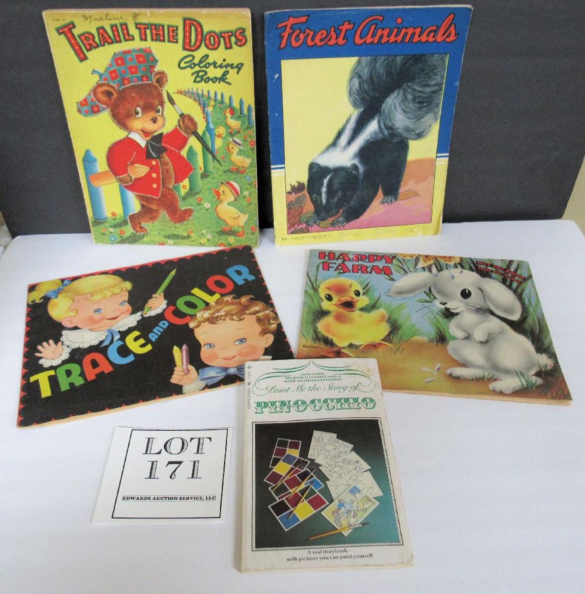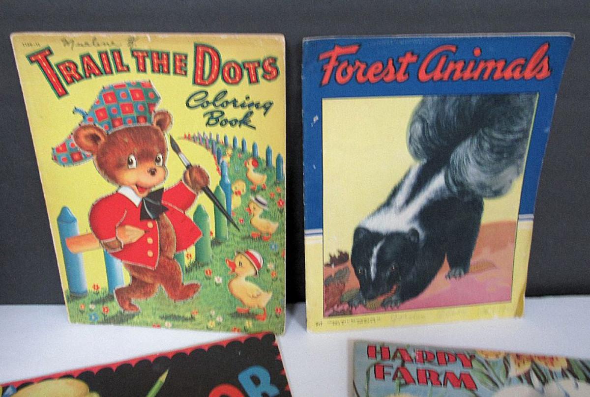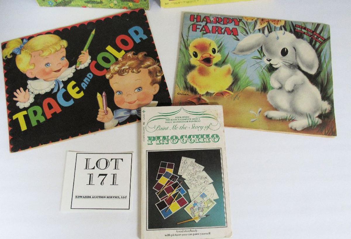 Worn and partially used to ok. There is a dot to dot book, well used but still a lot to do. There are 2 vintage paint with water books, (the Pinocchio one has blocks of watercolor paints at the back of the book) 1 trace and color book and one just book. Too cute. Shipping is available at shipping cost plus $5.00 handling fee on one box, $10.00 handling fee on two boxes, $15.00 handling fee on 3 boxes. Helps cover shipping materials and labor cost.
