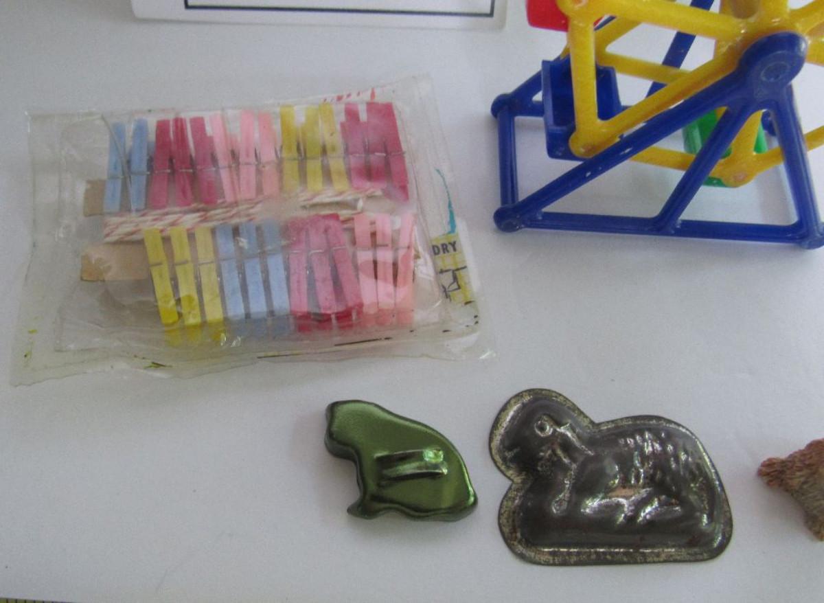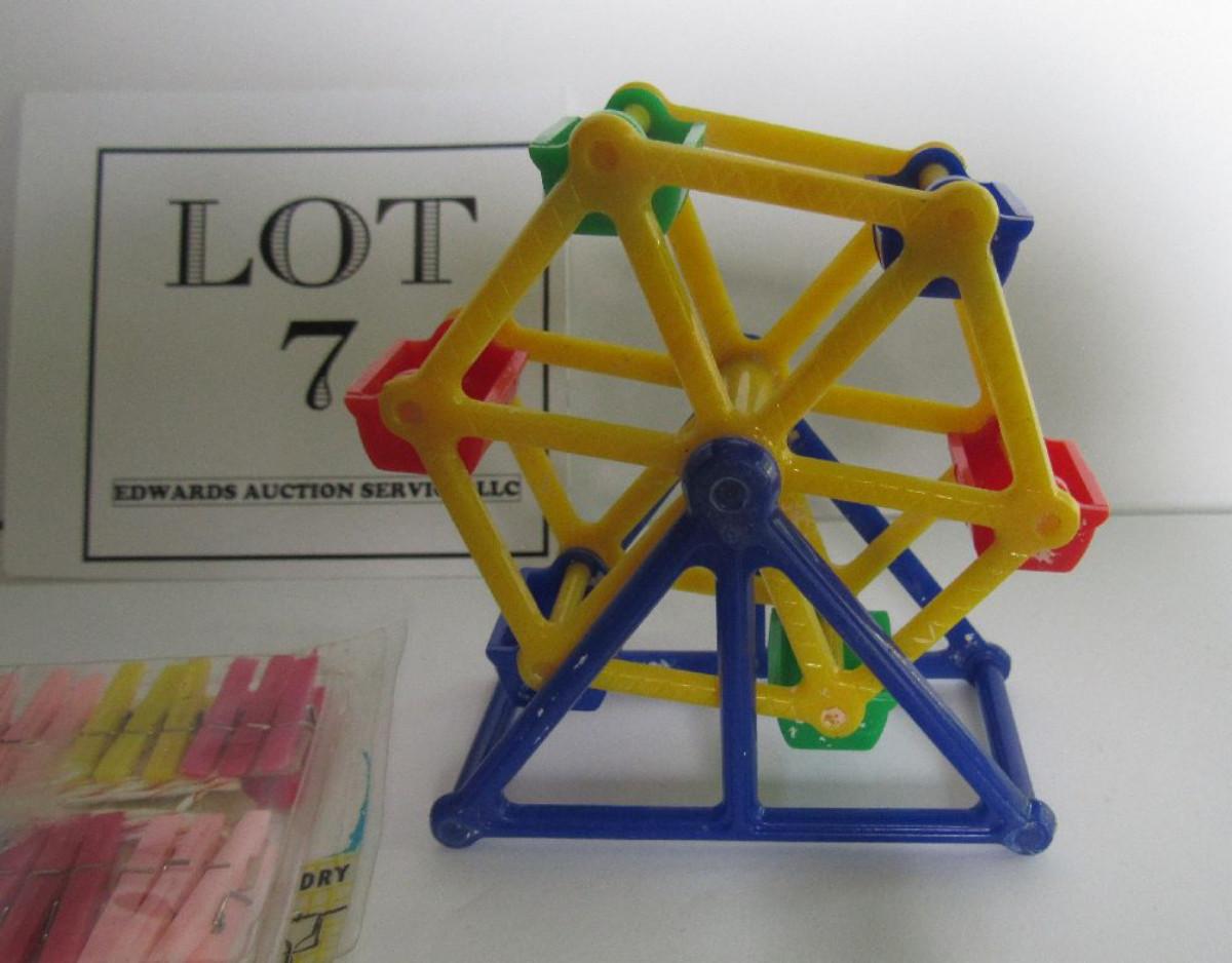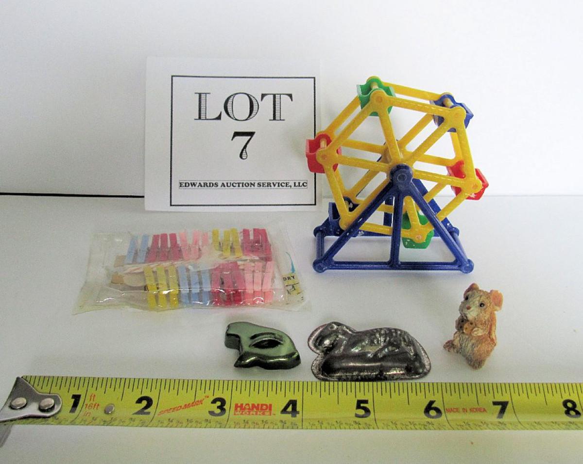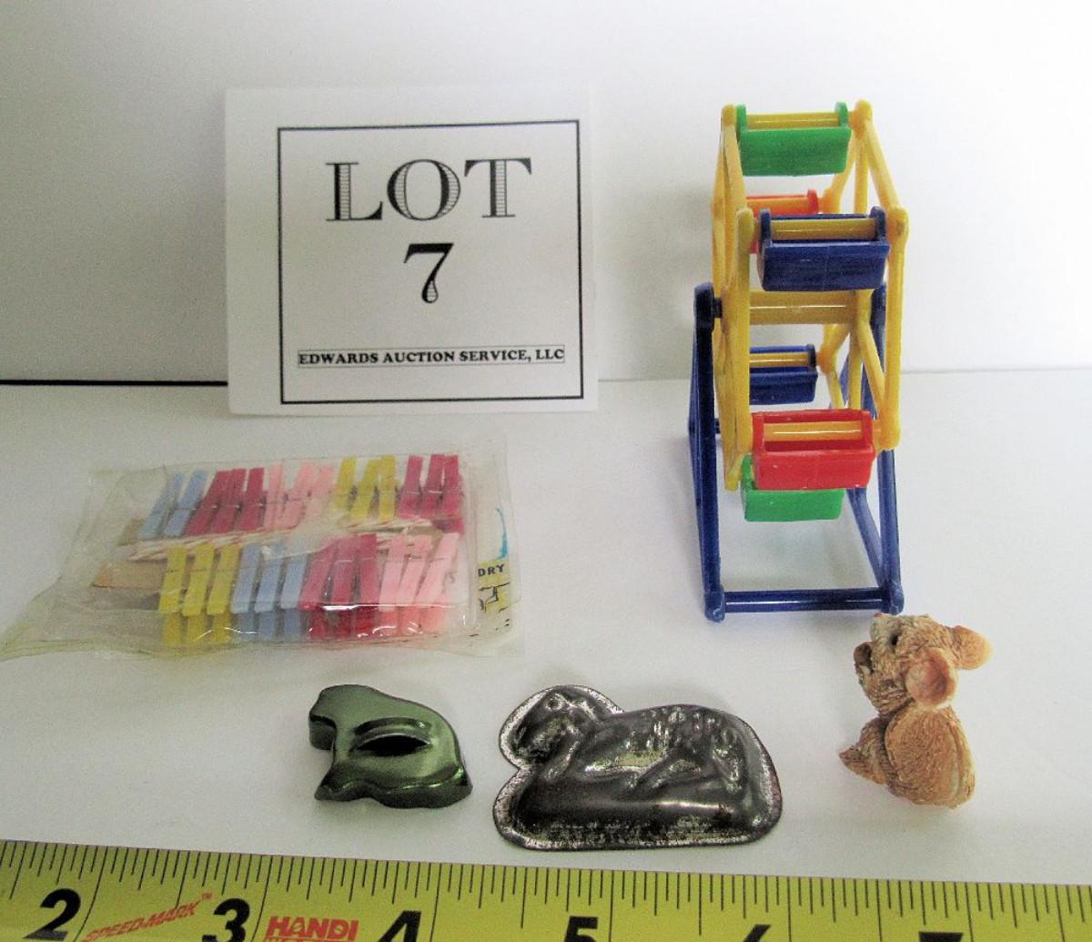 Hard plastic Ferris wheel and tiny clothespins, metal cookie cutter and mold, mini figurine. Shipping is available on this lot with additional shipping and handling fees. Please see our terms for details.