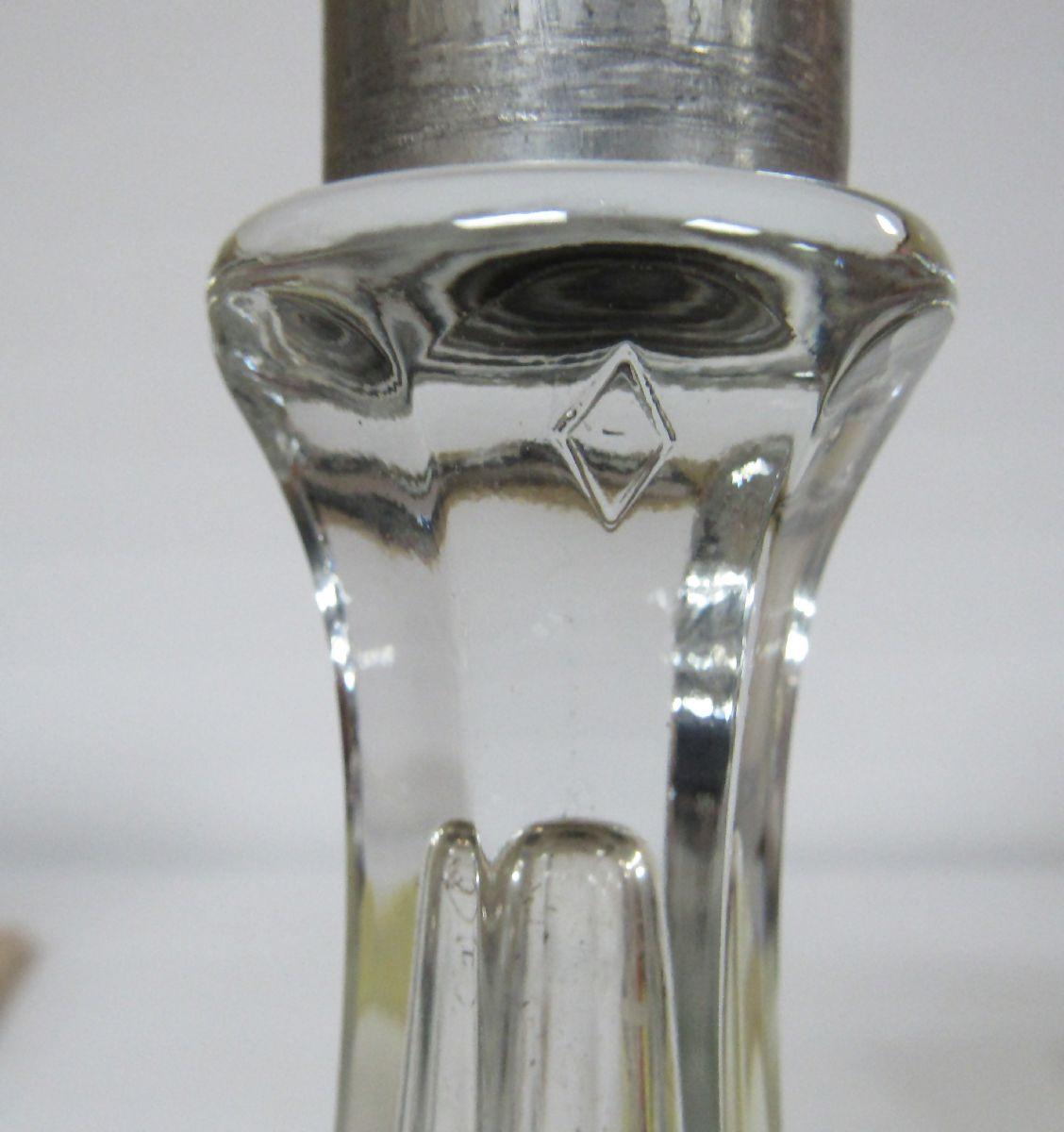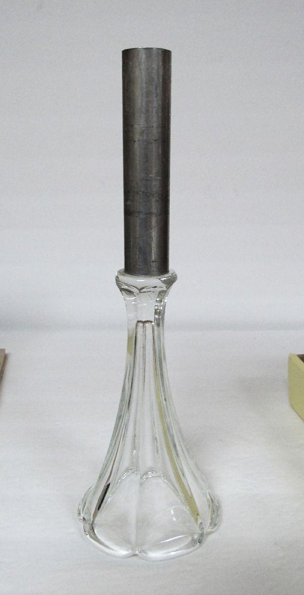 The cruets do not have stoppers. The candle base is vintage Heisey glass.