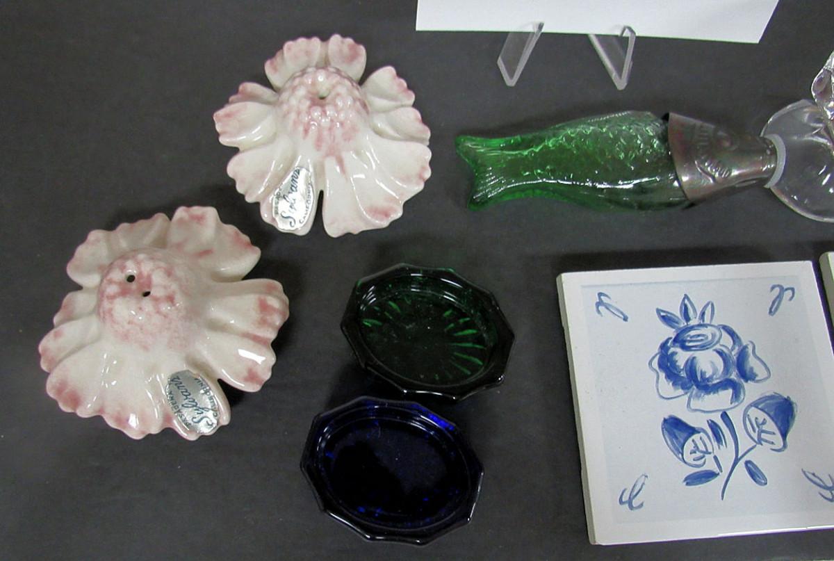 The flower shakers are Sylvans of Cal pottery, very good condition. The others are also in very good condition. The oval open salts are from the 1990s.