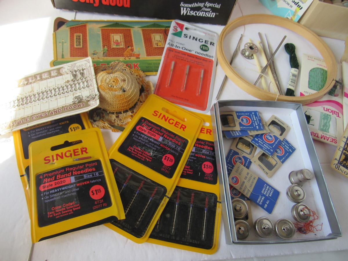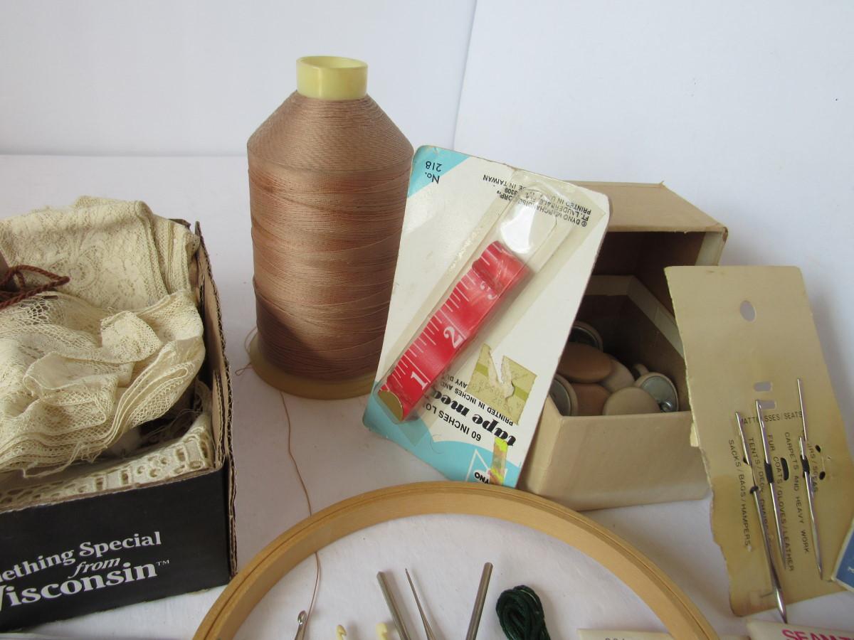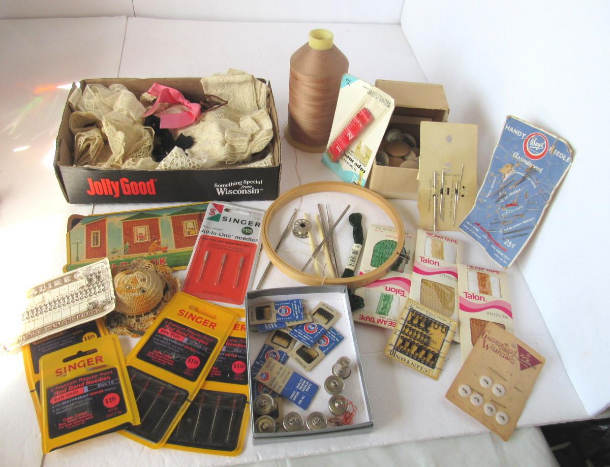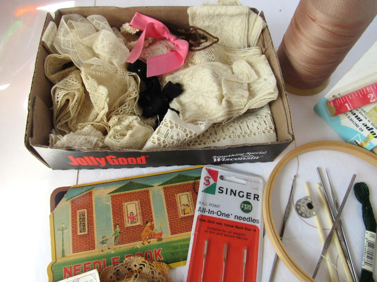 Lot of Vintage Lace Rolls and Sewing Notions, Needles, Etc