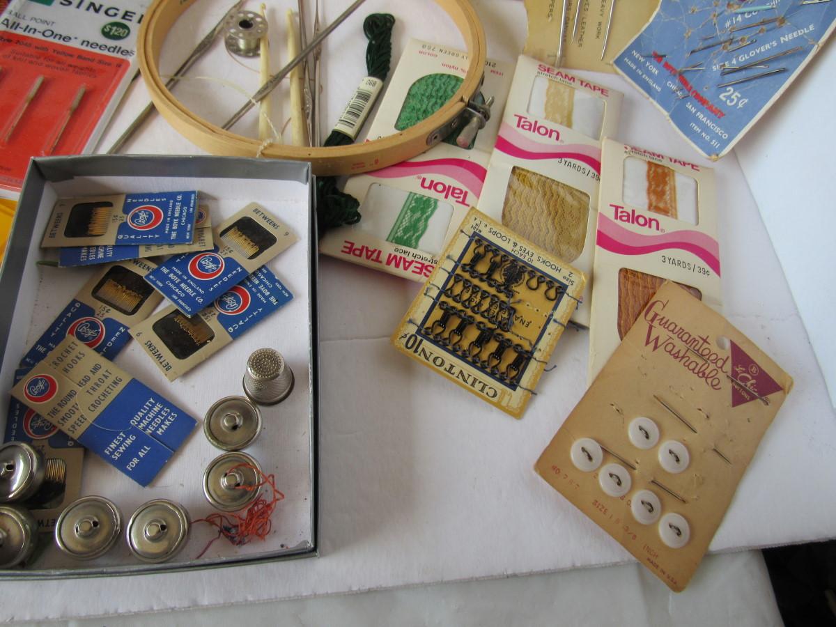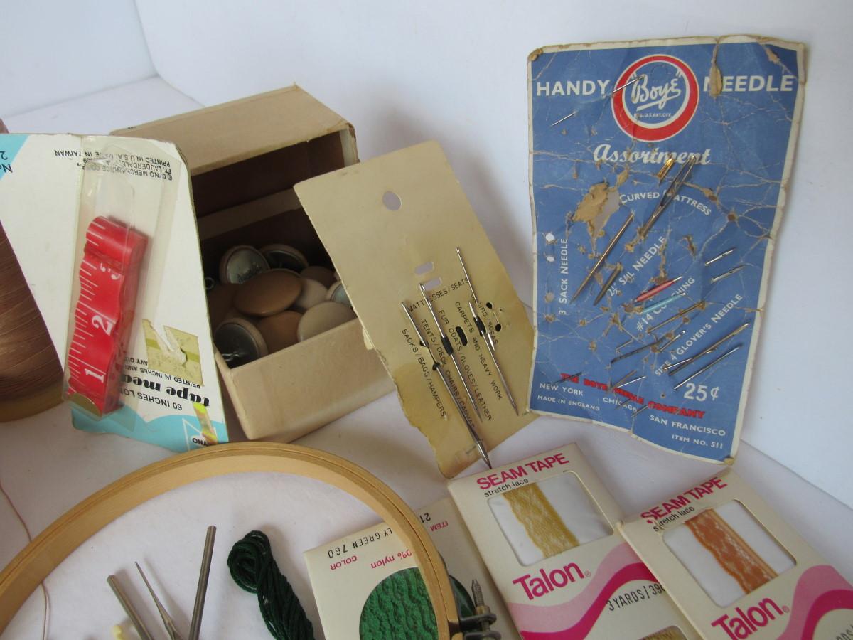 The lace is in all sizes and styles, some very nice. Some needles unused, from very thin and tiny to very heavy duty. Buttons, tape measure, hook/eyes, more. Shipping is available at actual shipping cost plus $5.00 handling fee per box for supplies/labor. See our terms for details. All sales are final. Condition notes may not be all inclusive, we may miss some issues as most vintage items are not in mint condition and have some degree of wear, paint loss, etc, but we always try to note obvious damage.