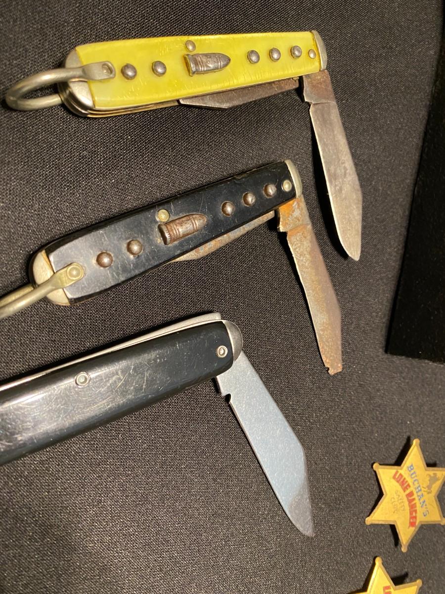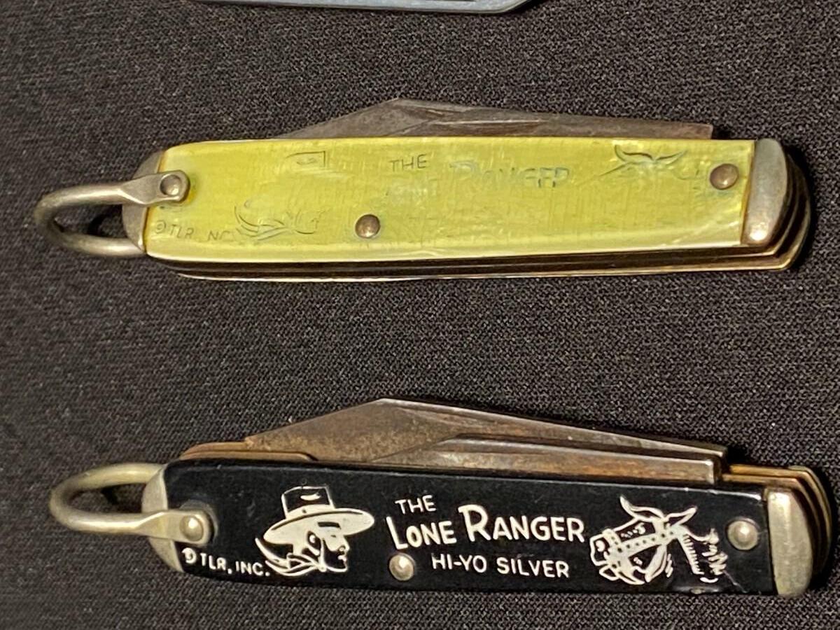 Lot of Vintage Lone Ranger Badges Buttons Pins Ring Pocket Knives Bullets. Includes several vintage Lone Ranger badges, cheerios flashlight ring, buttons, tin watch, 3 pocket knives, Lone Ranger Bullets. Condition as shown.