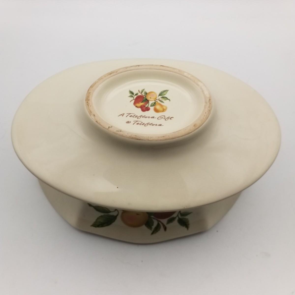 Telaflora Planter with Vintage Fruit Illustration, approximately 7 wide x 5 x 4 inches. No apparent chips or cracks observed; see photos for details.