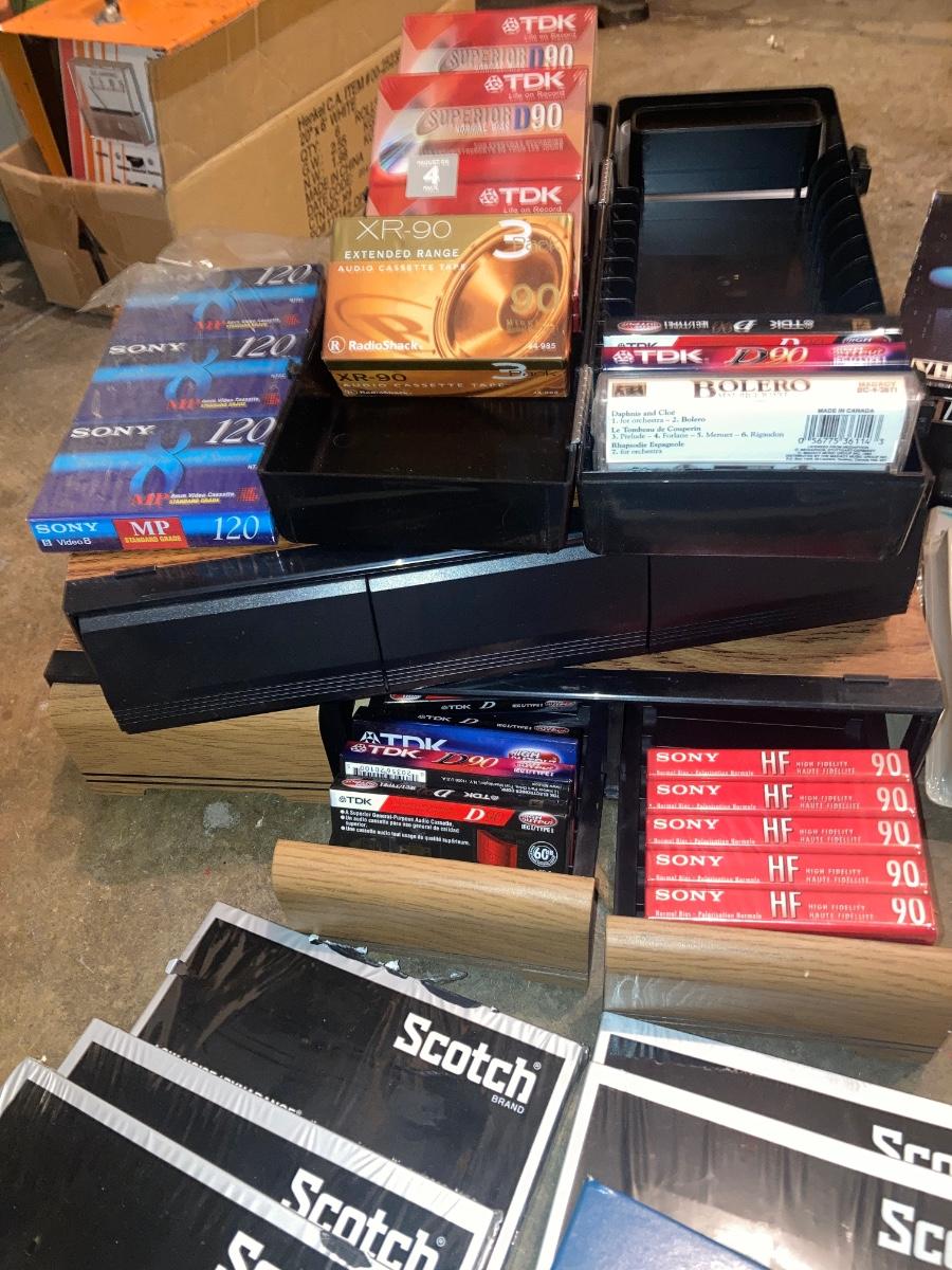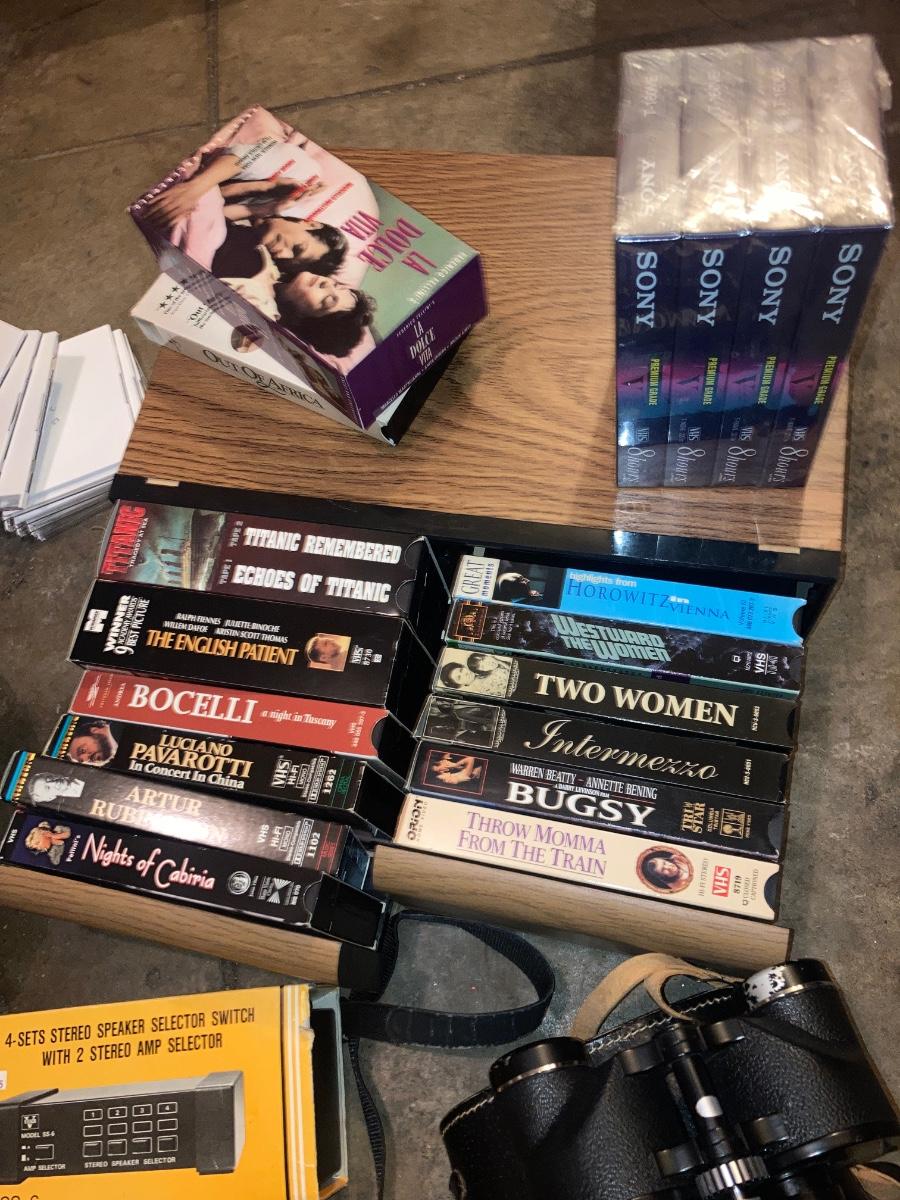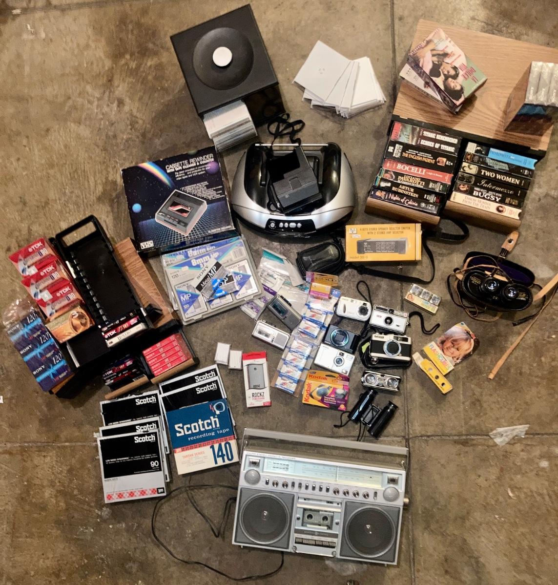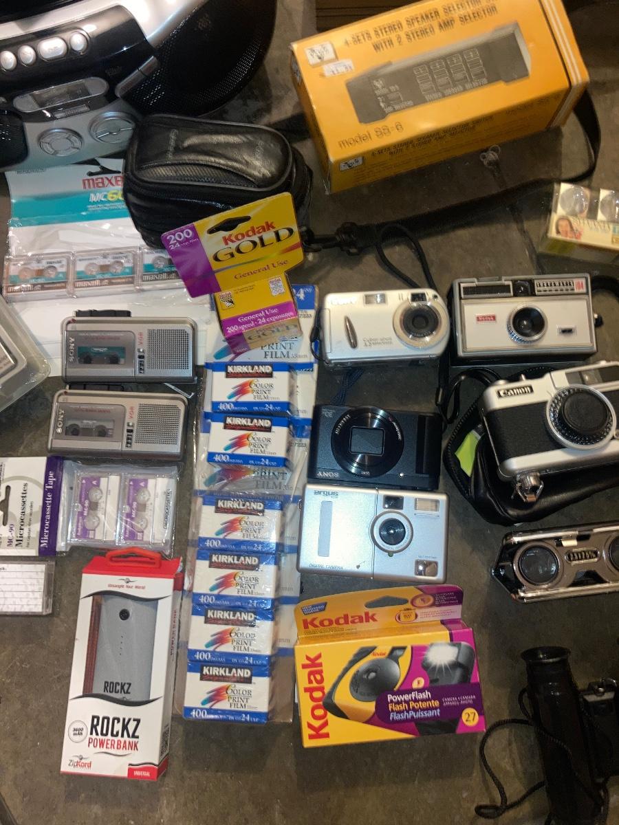 Lot includes a cassette tape portable blaster, Polaroid Calera, cassette tape holders, VHS tape holders, CD tower, blank media of various kind cd mp3 player, cassette tape rewinder , Vintage Tasco binoculars, 35mm film and cameras VHS movies