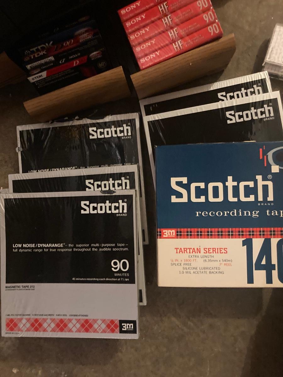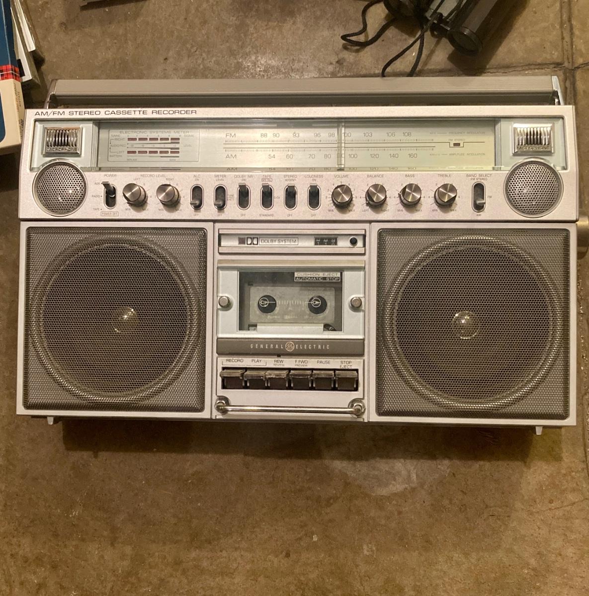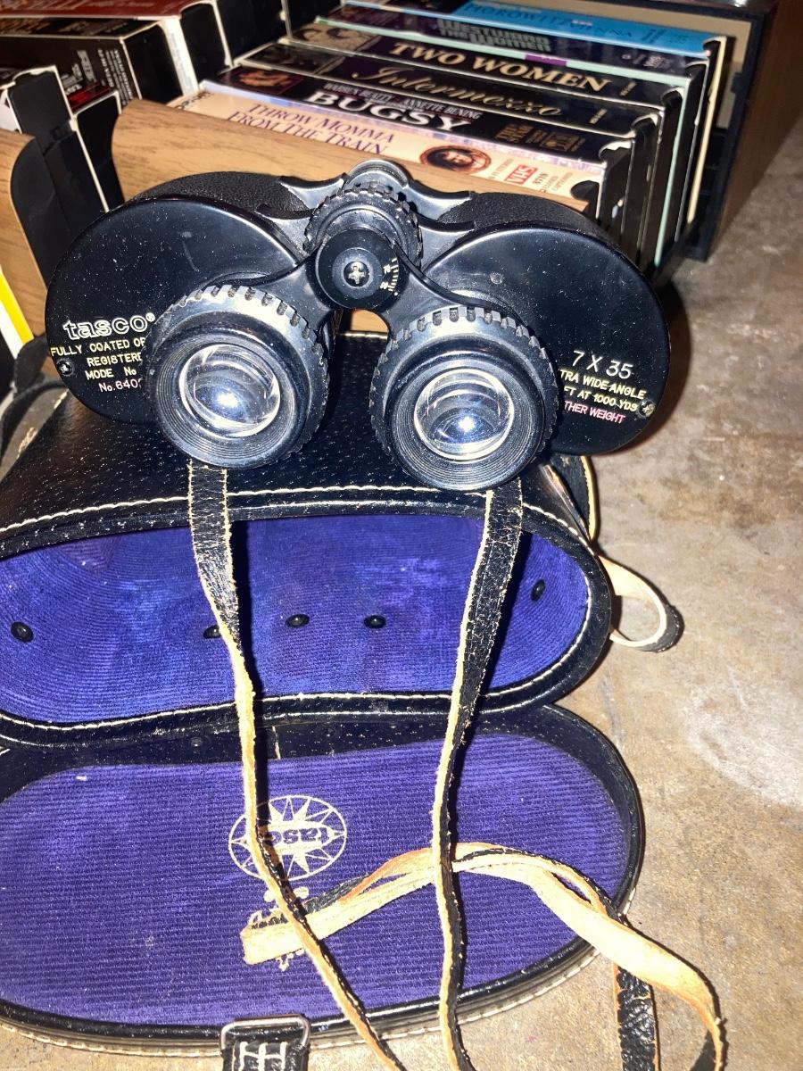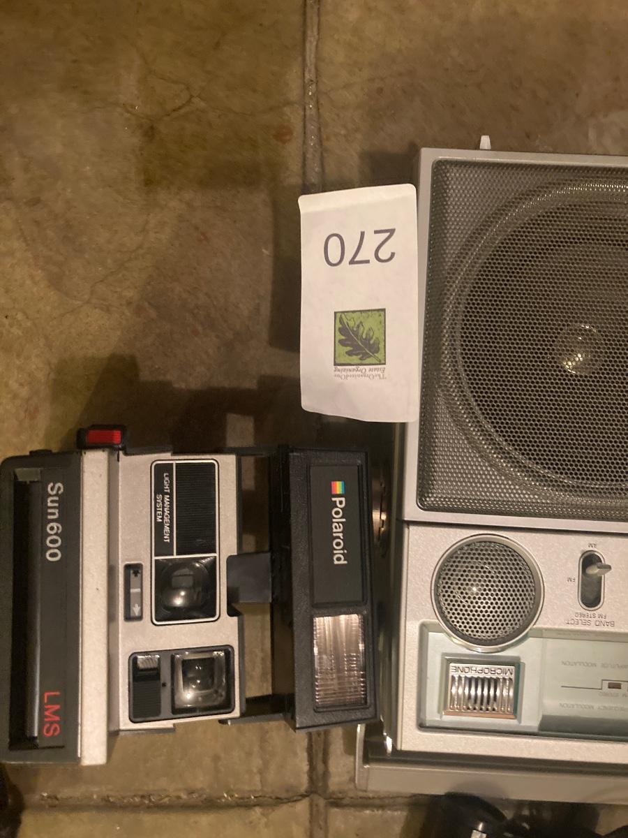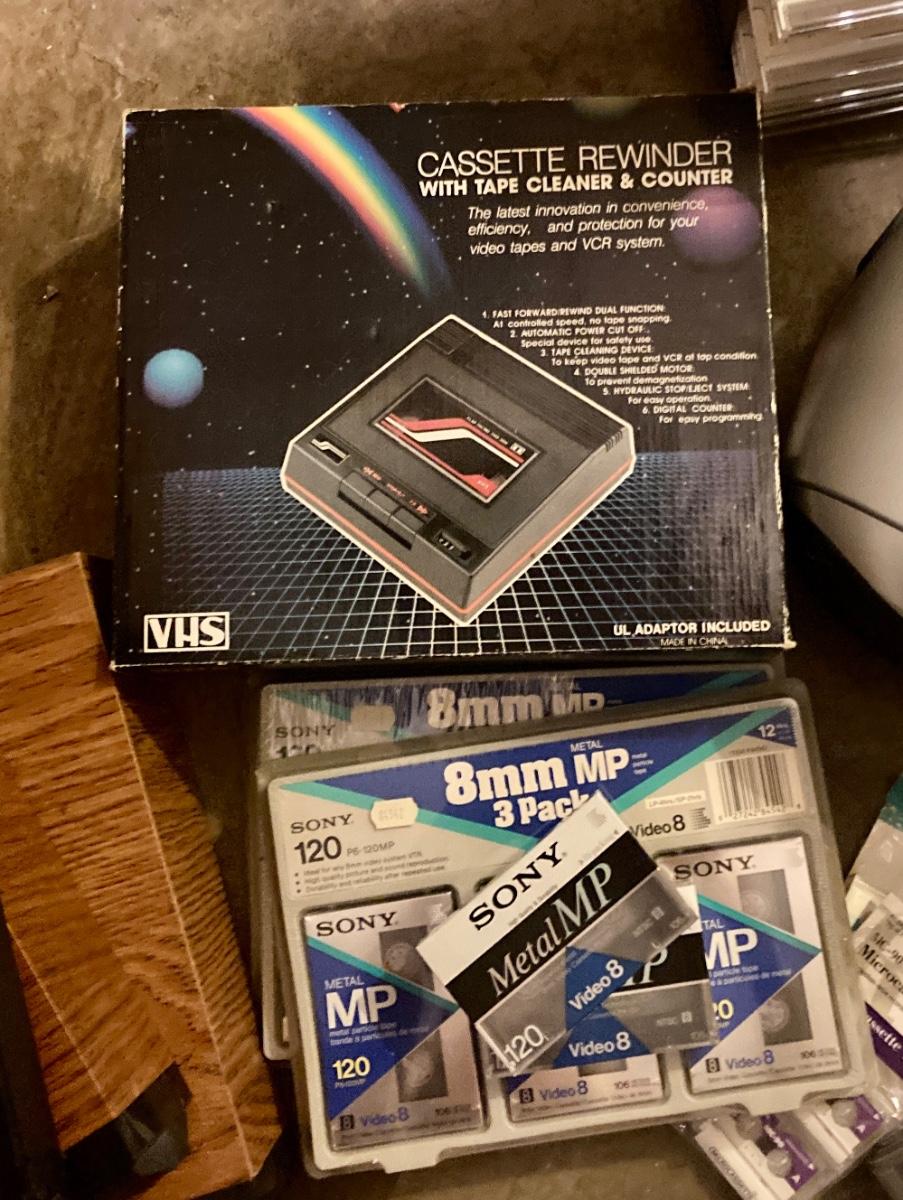 Lot includes a cassette tape portable blaster, Polaroid Calera, cassette tape holders, VHS tape holders, CD tower, blank media of various kind cd mp3 player, cassette tape rewinder , Vintage Tasco binoculars, 35mm film and cameras VHS movies