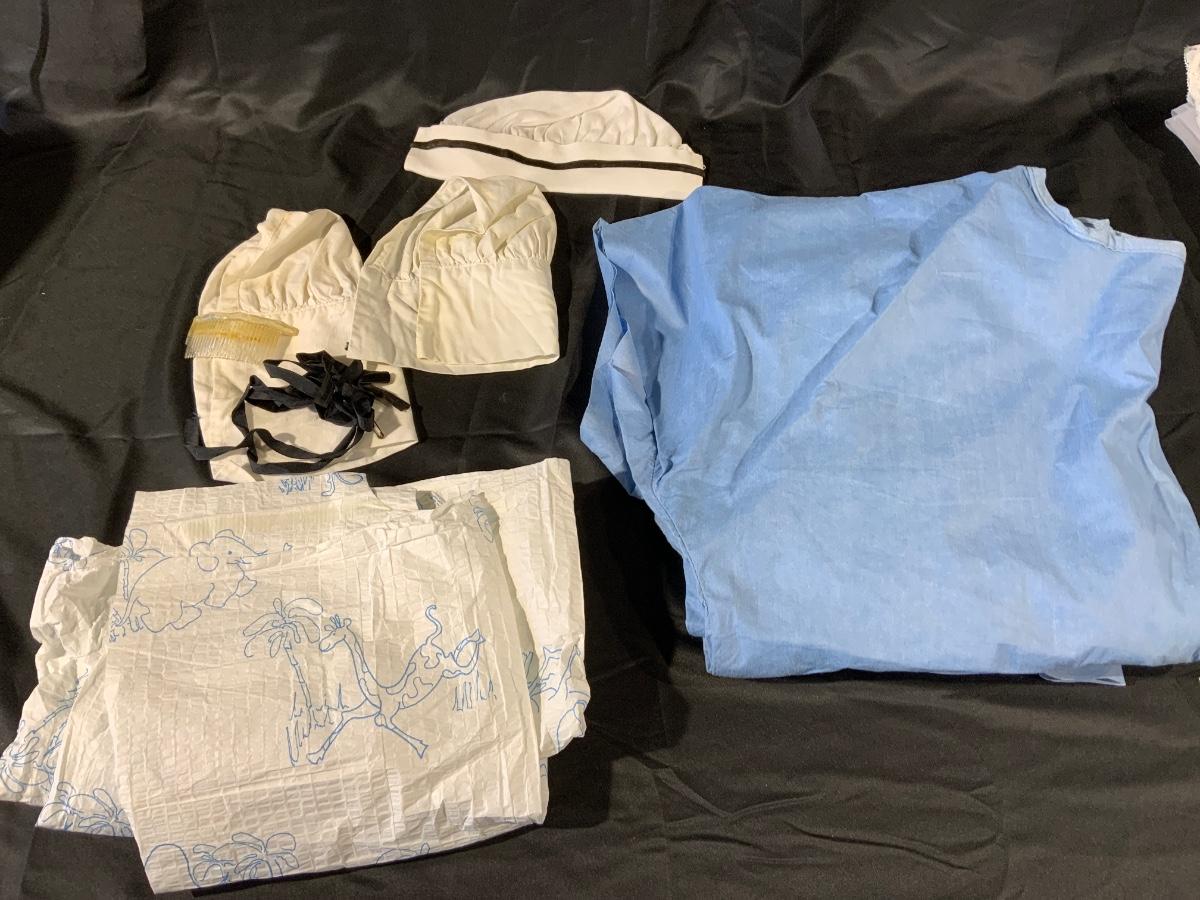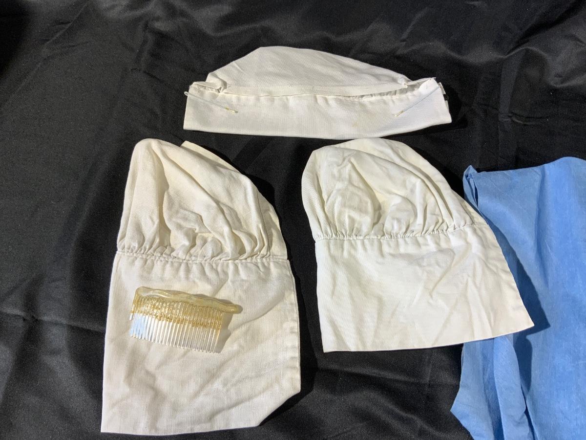 Lot of vintage medical related items, including vintage nursing hats, and paper gowns