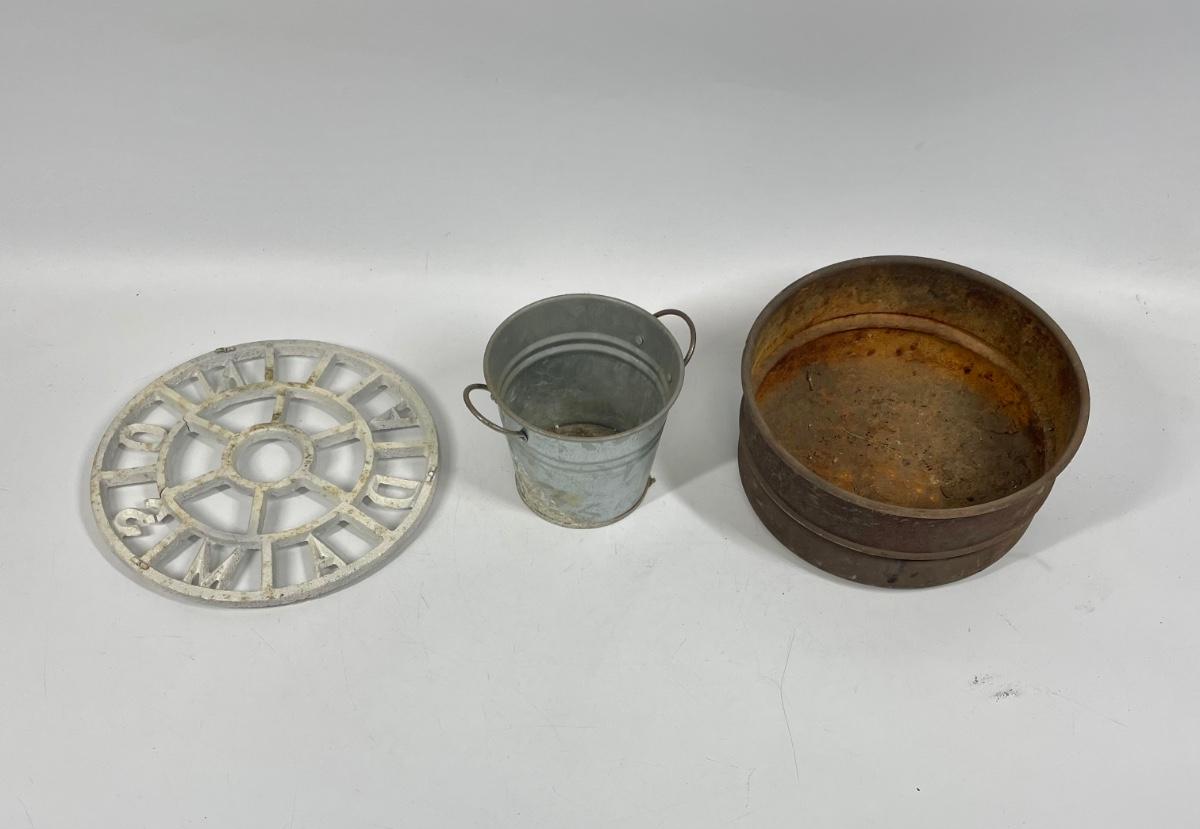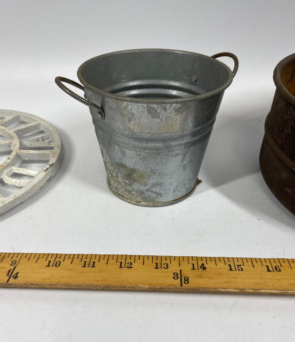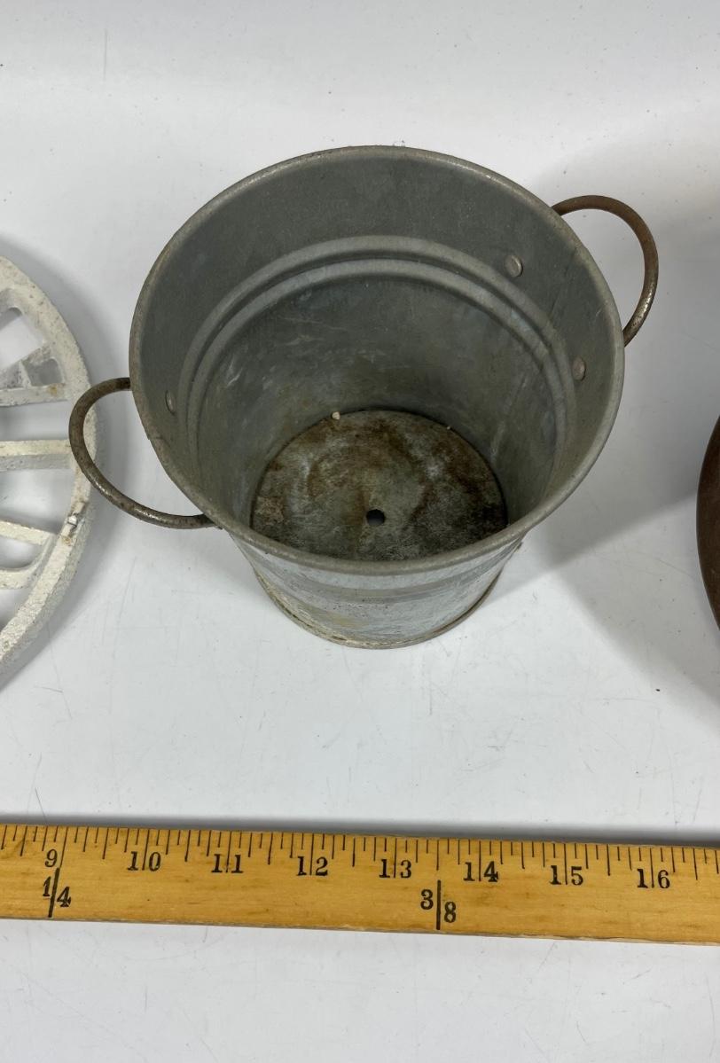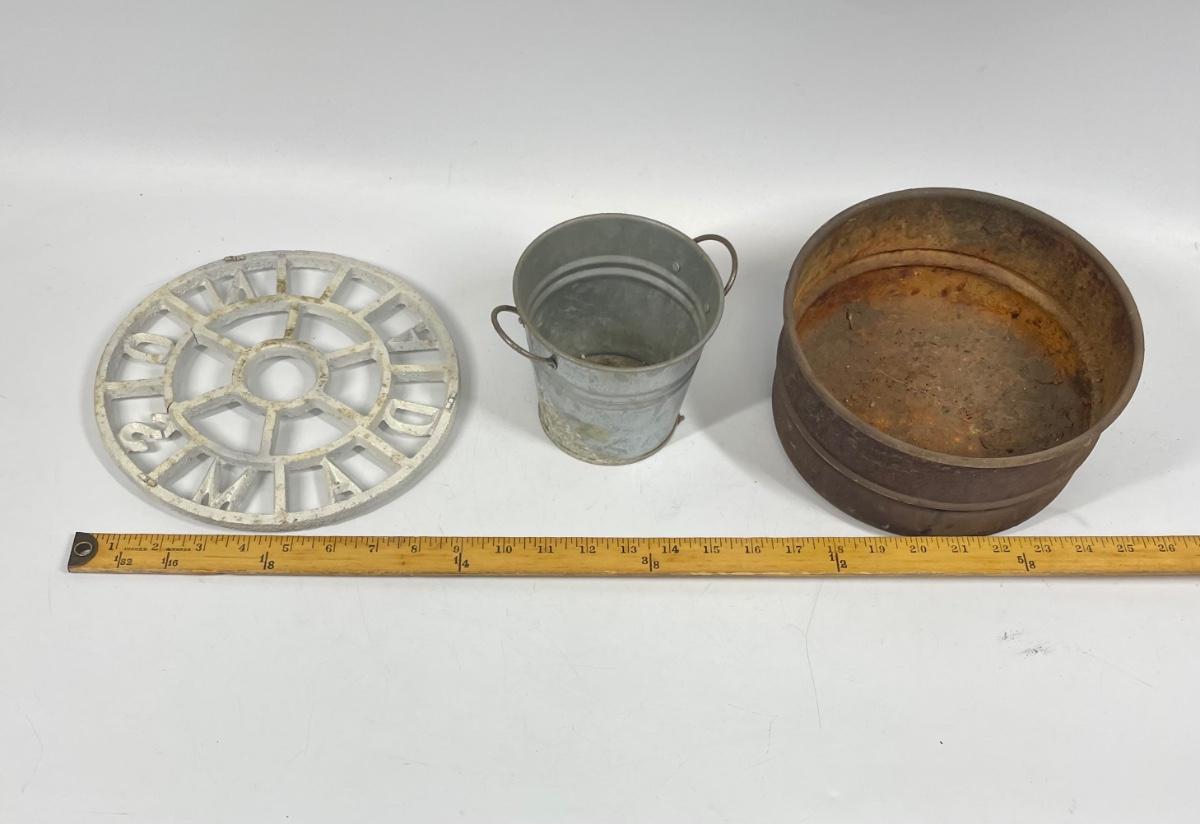 Lot of vintage Metal Yard Decor Items. Includes a round cast iron trivet, a small galvanized bucket, and a metal bowl.
