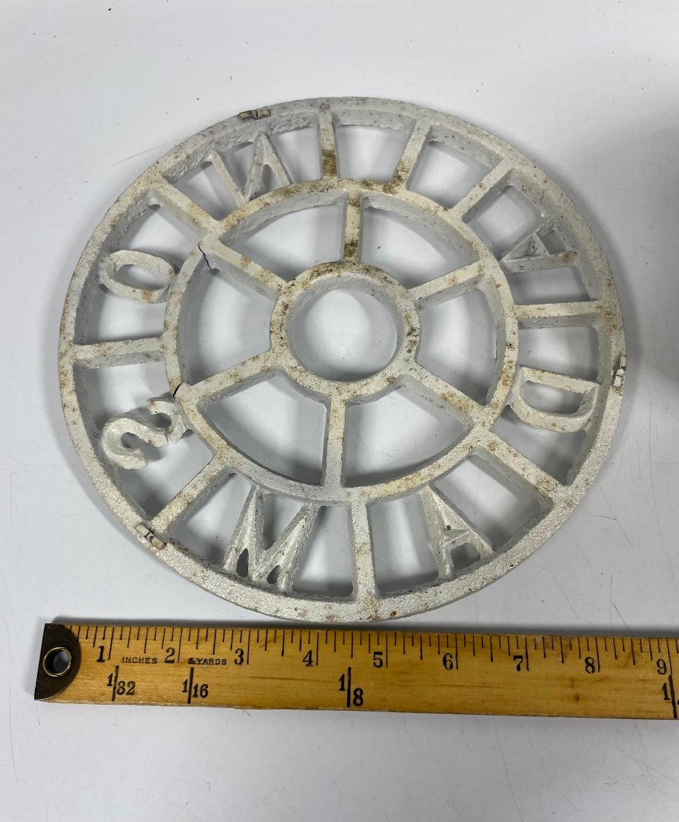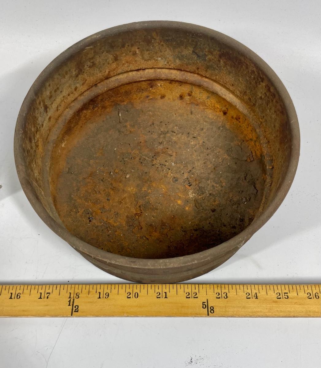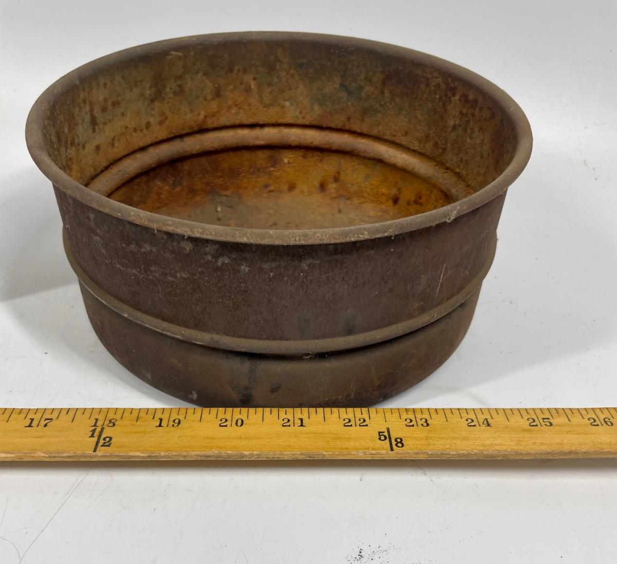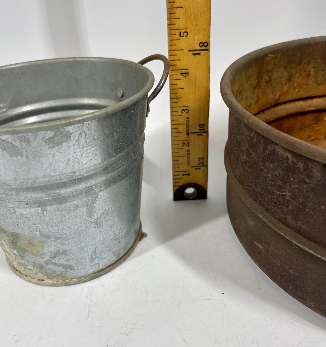 Lot of vintage Metal Yard Decor Items. Includes a round cast iron trivet, a small galvanized bucket, and a metal bowl.