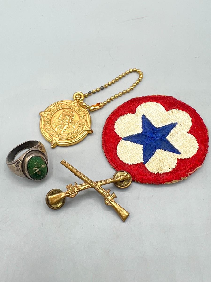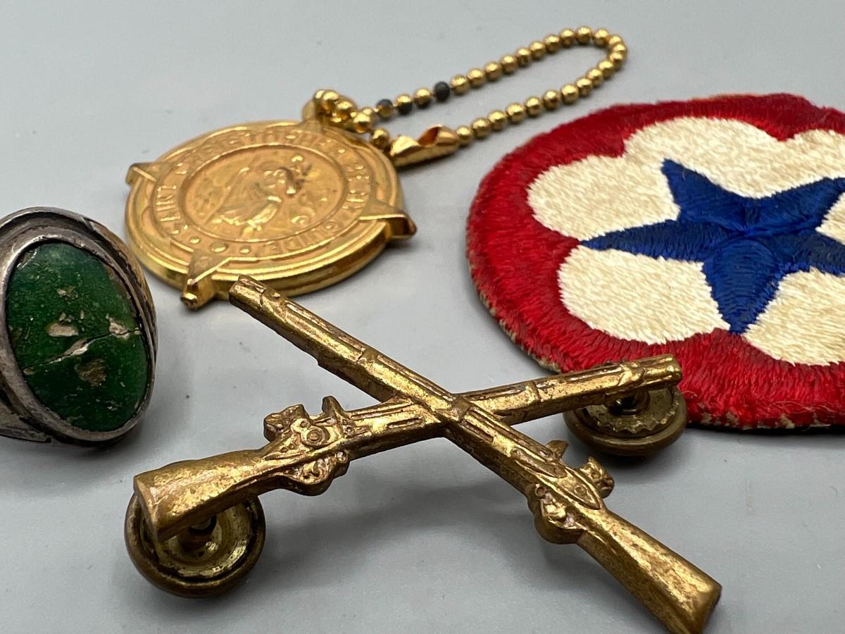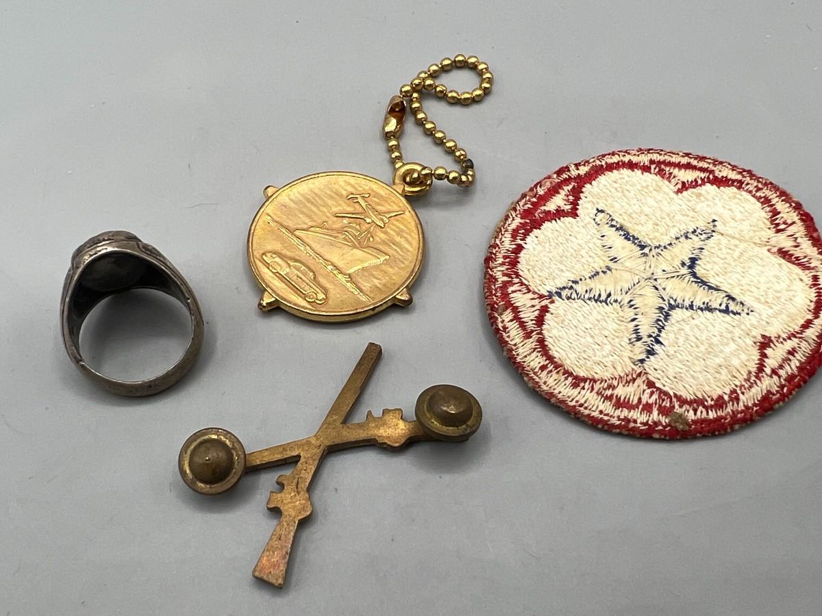 Lot of Vintage Miscellaneous Patches, Musket Pin, Religious Keychain & Ring