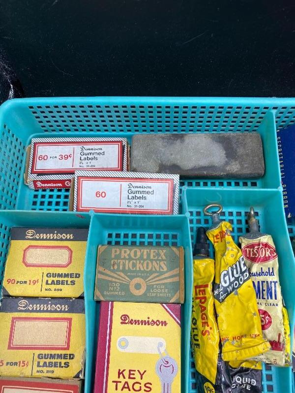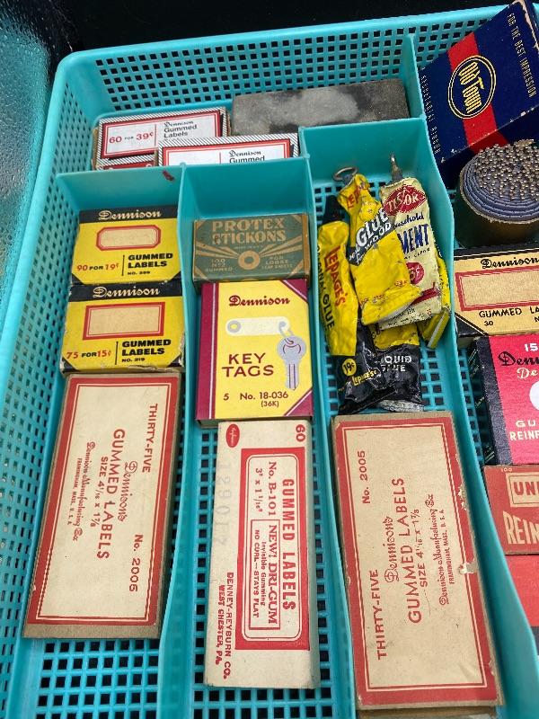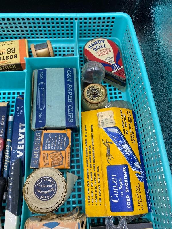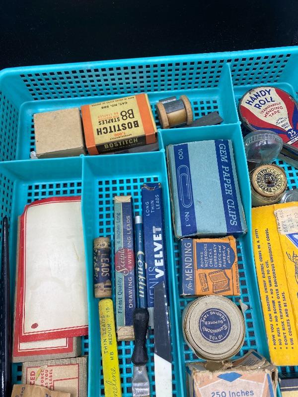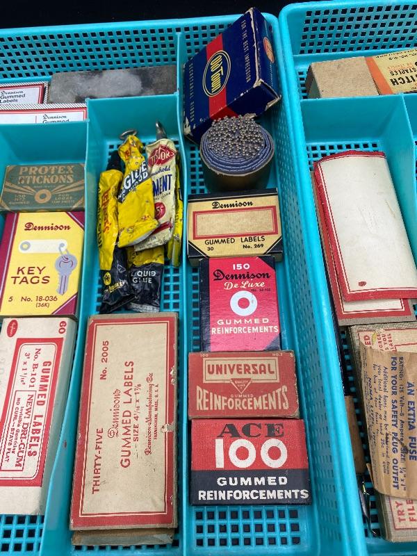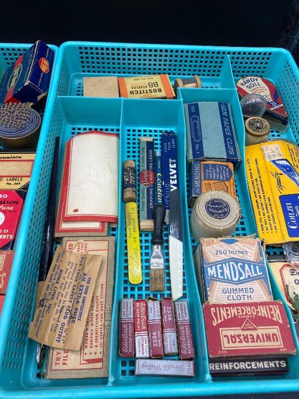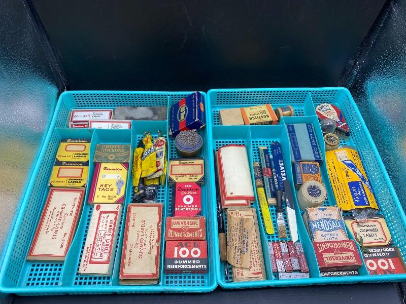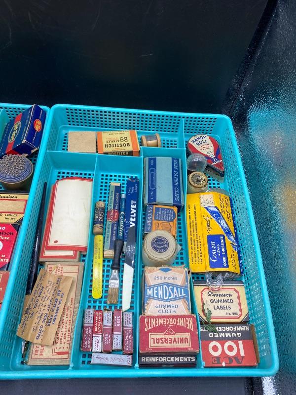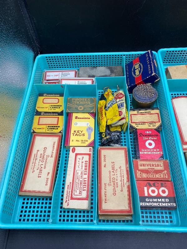 Lot of vintage office supplies. Great vintage packaging for display or craft projects. Everything photo included, even the plastic trays. All boxes seem to have stuff in them.
