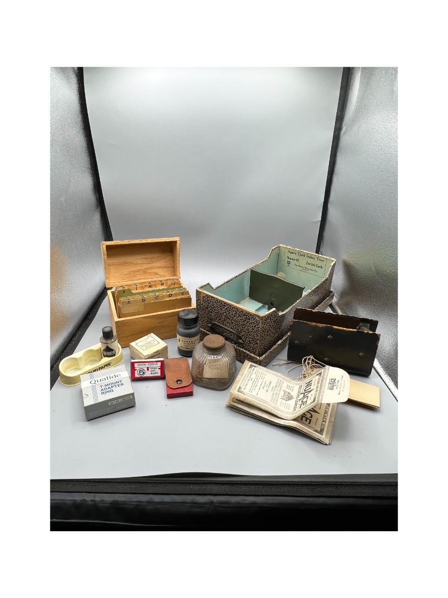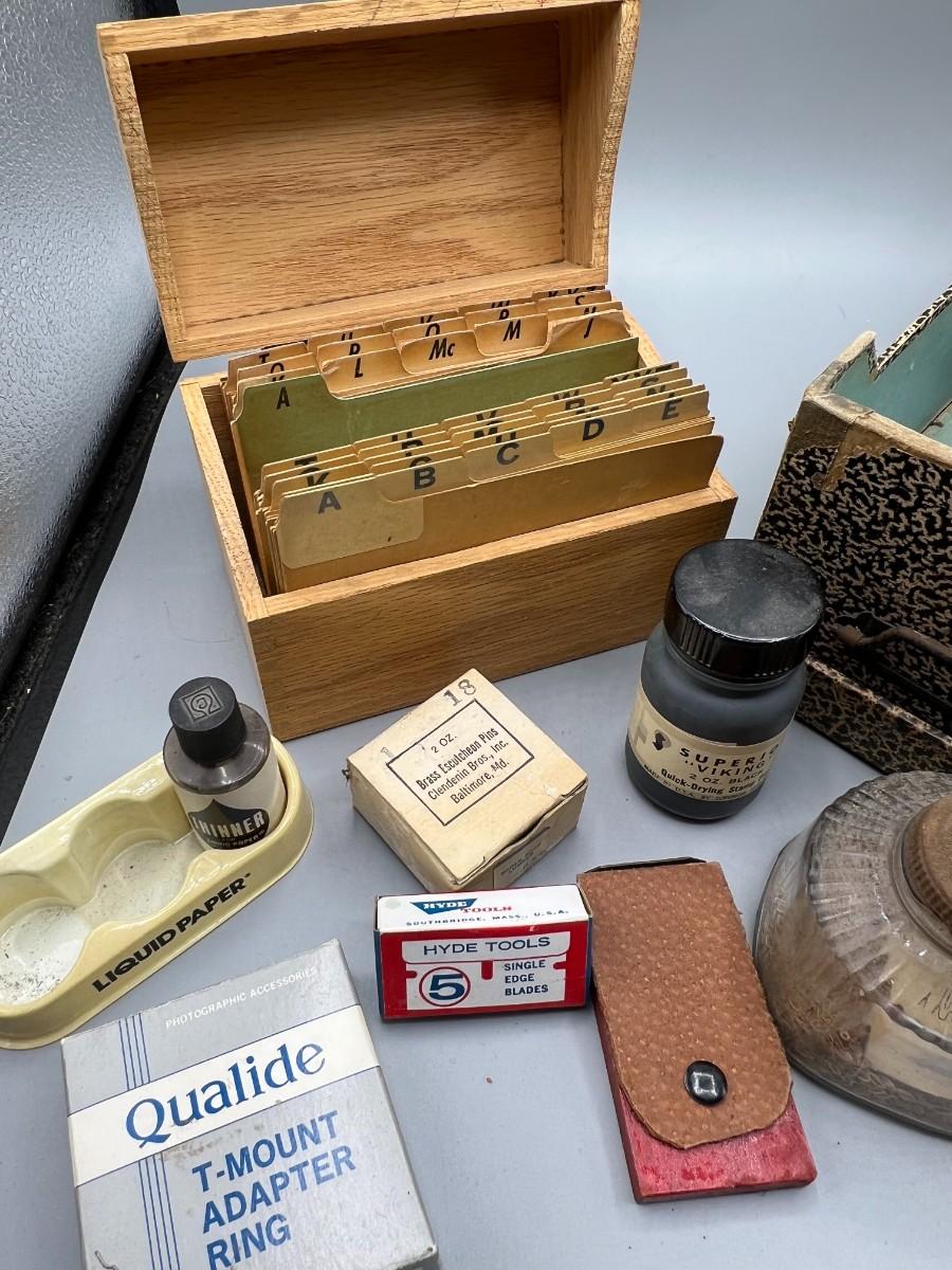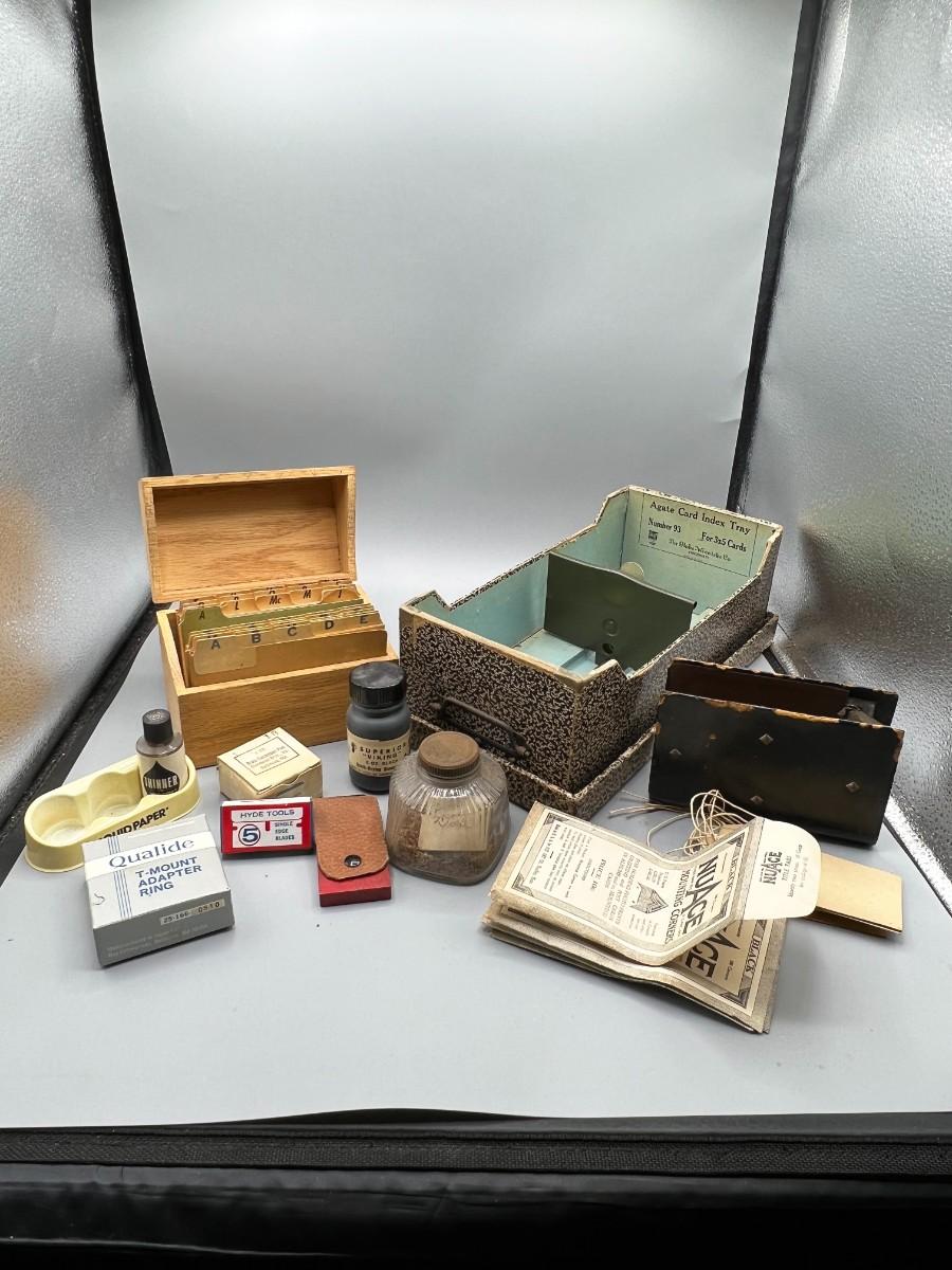 Lot of Vintage Office Supplies, Agate Card Index Tray, Single Edge Blades, Mounting Corners & More, there is some light wear to the materials, but there is no significant damage and is in overall good vintage condition. Check pictures for more details and for sizing.