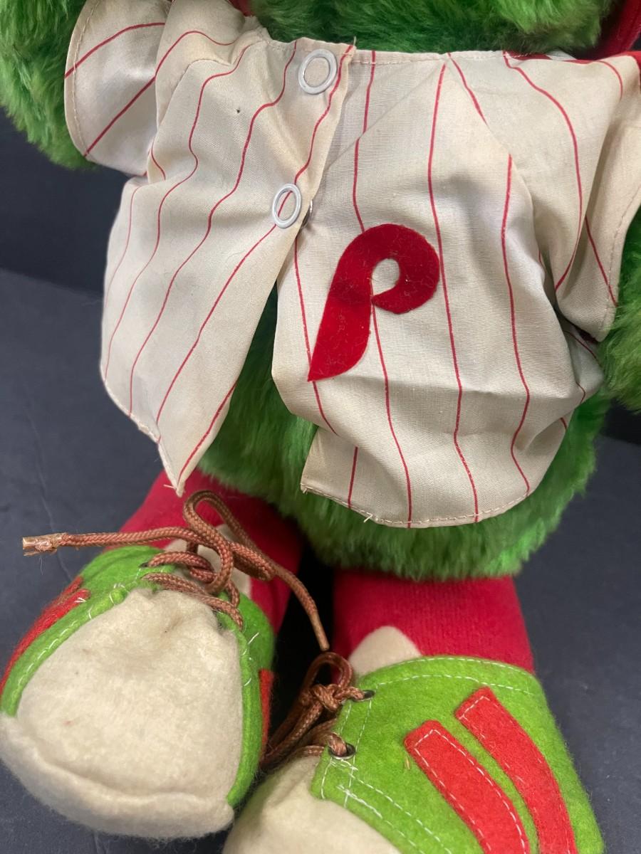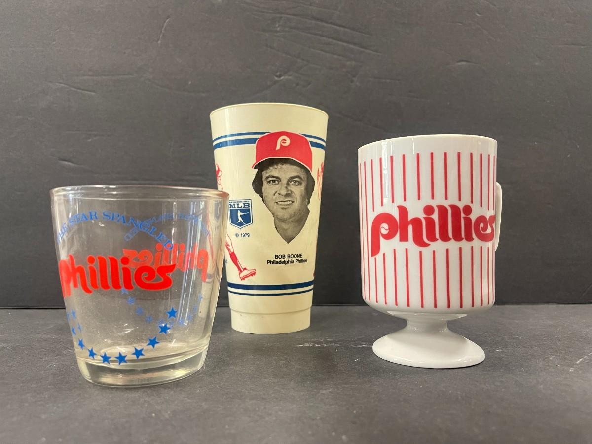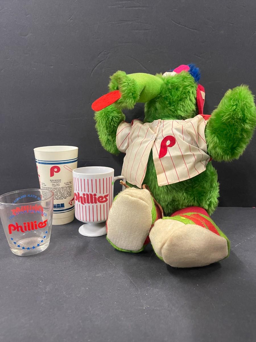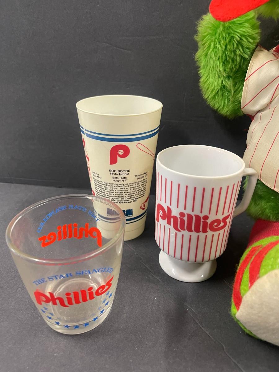 Includes Vintage Phillies footed mug, 1970s Bob Boone plastic cup, 1970s Phillies Star Spangled Banner cup and Vintage plush Phillis Phanatic.