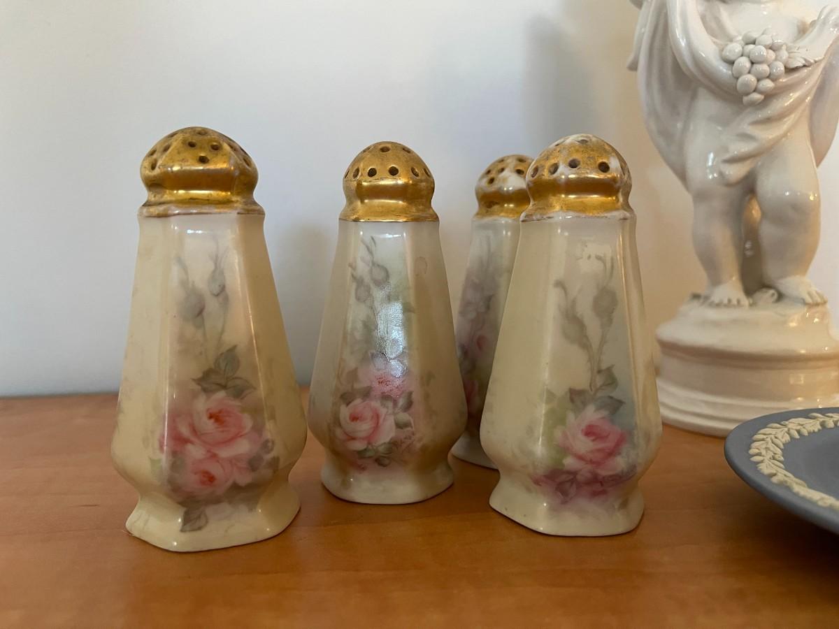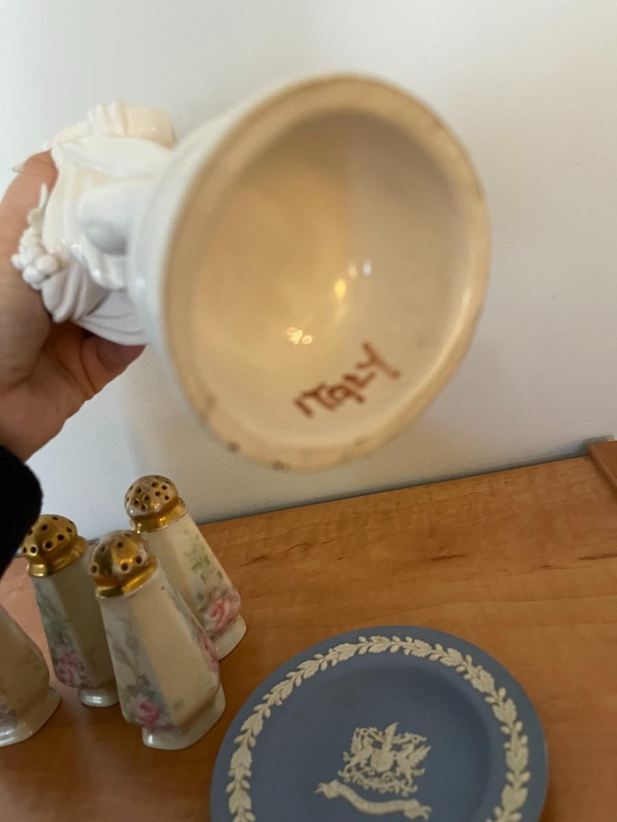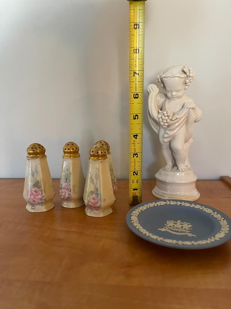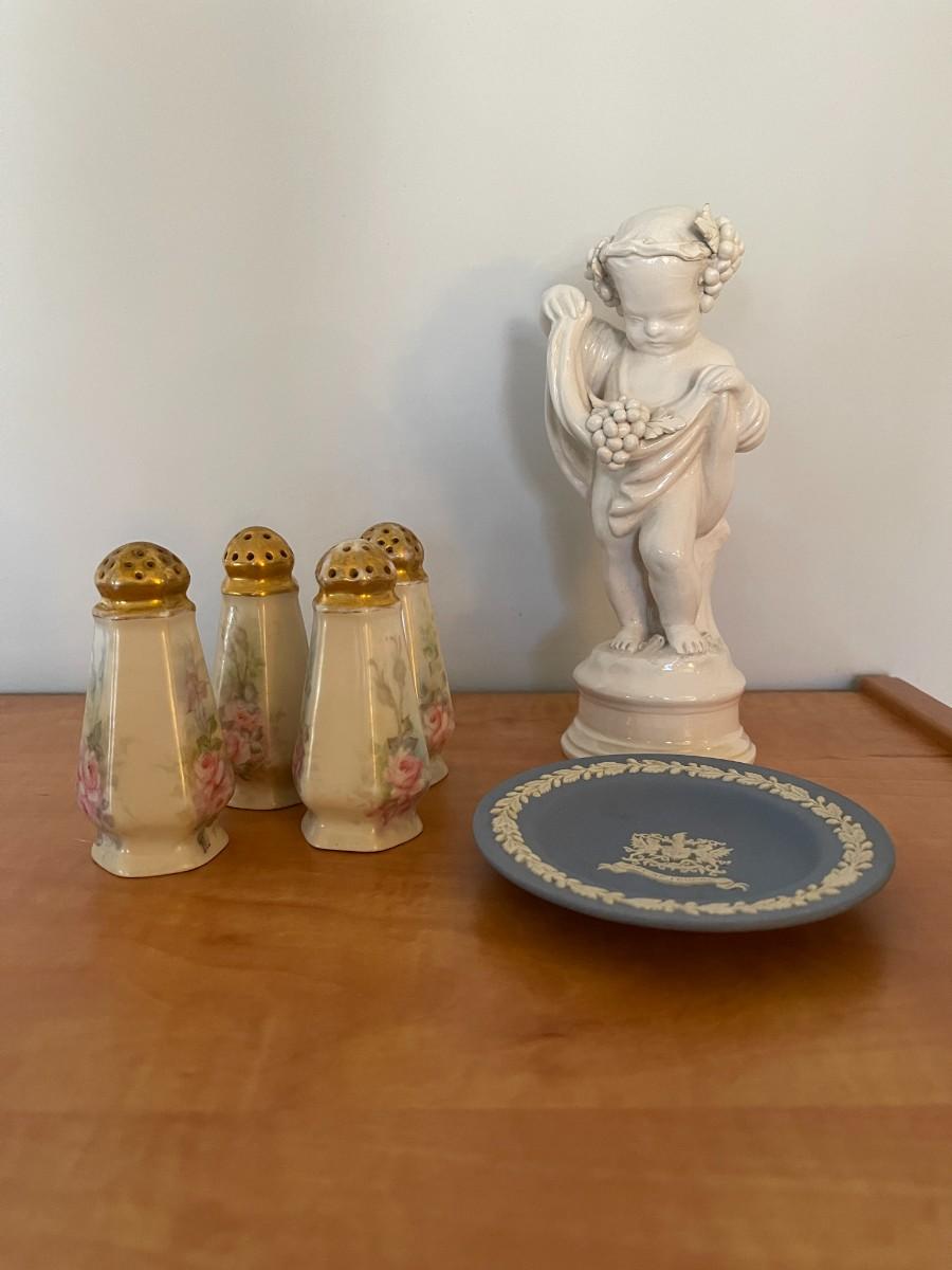 Includes white Italian cherub figurine, 1 pairs of porcelain salt and pepper shakes with gilt tops and Wedgwood blue jasperware trinket dish.