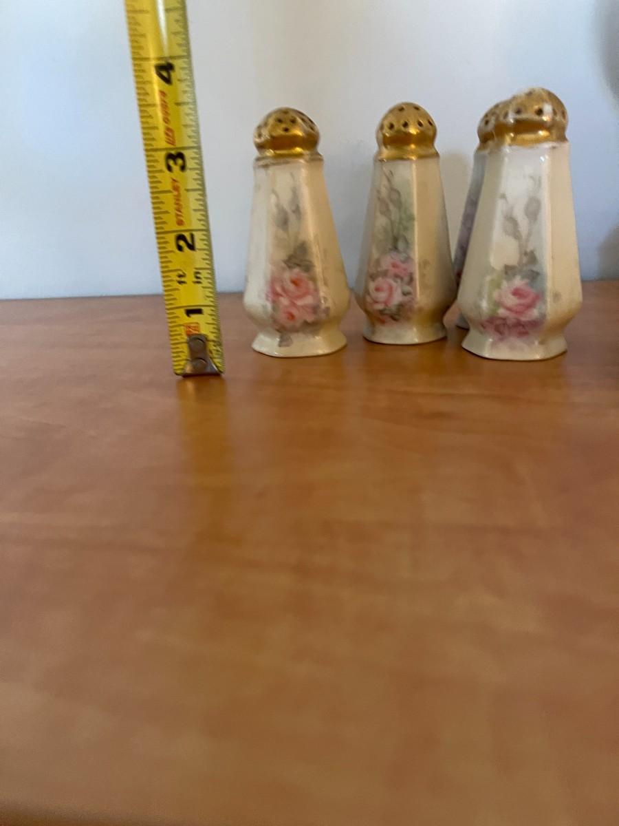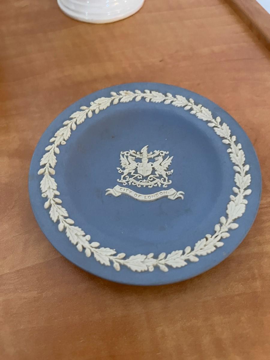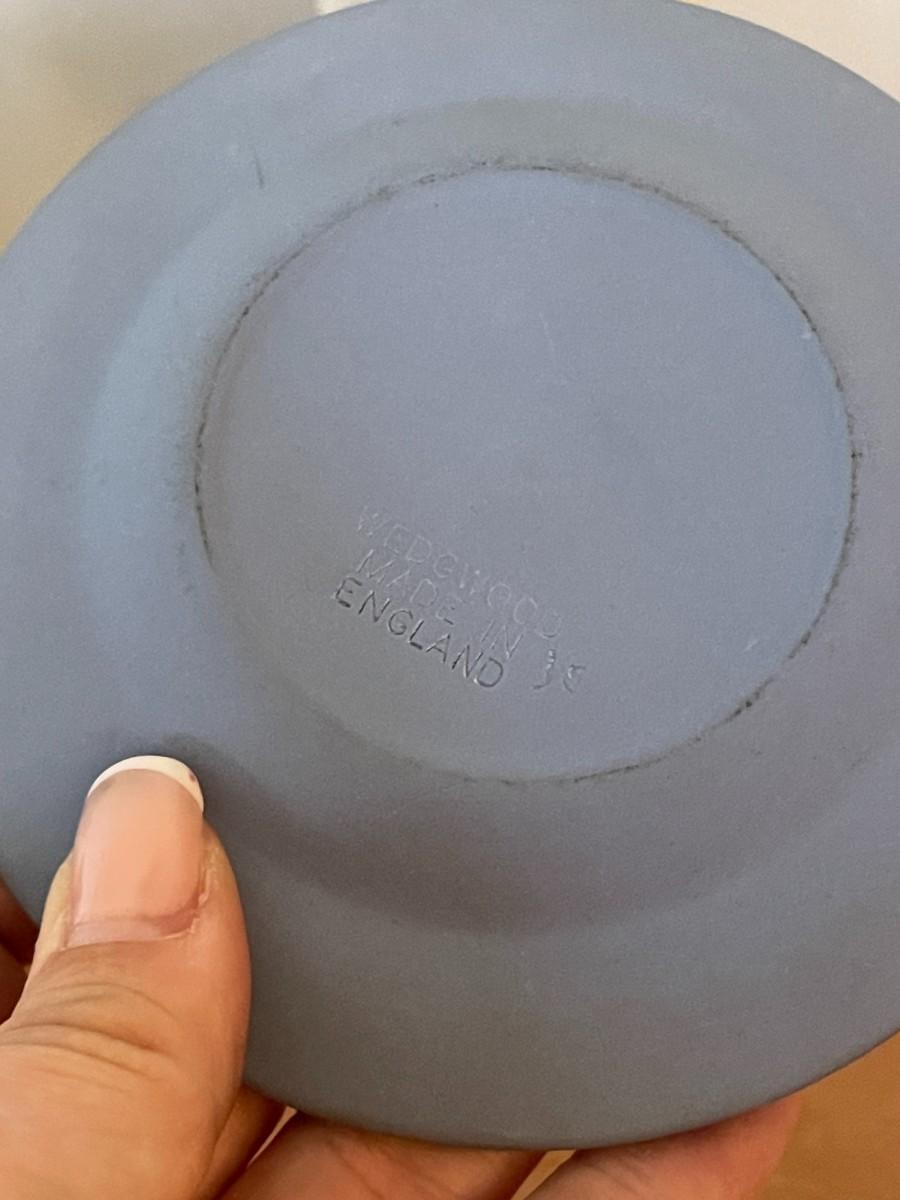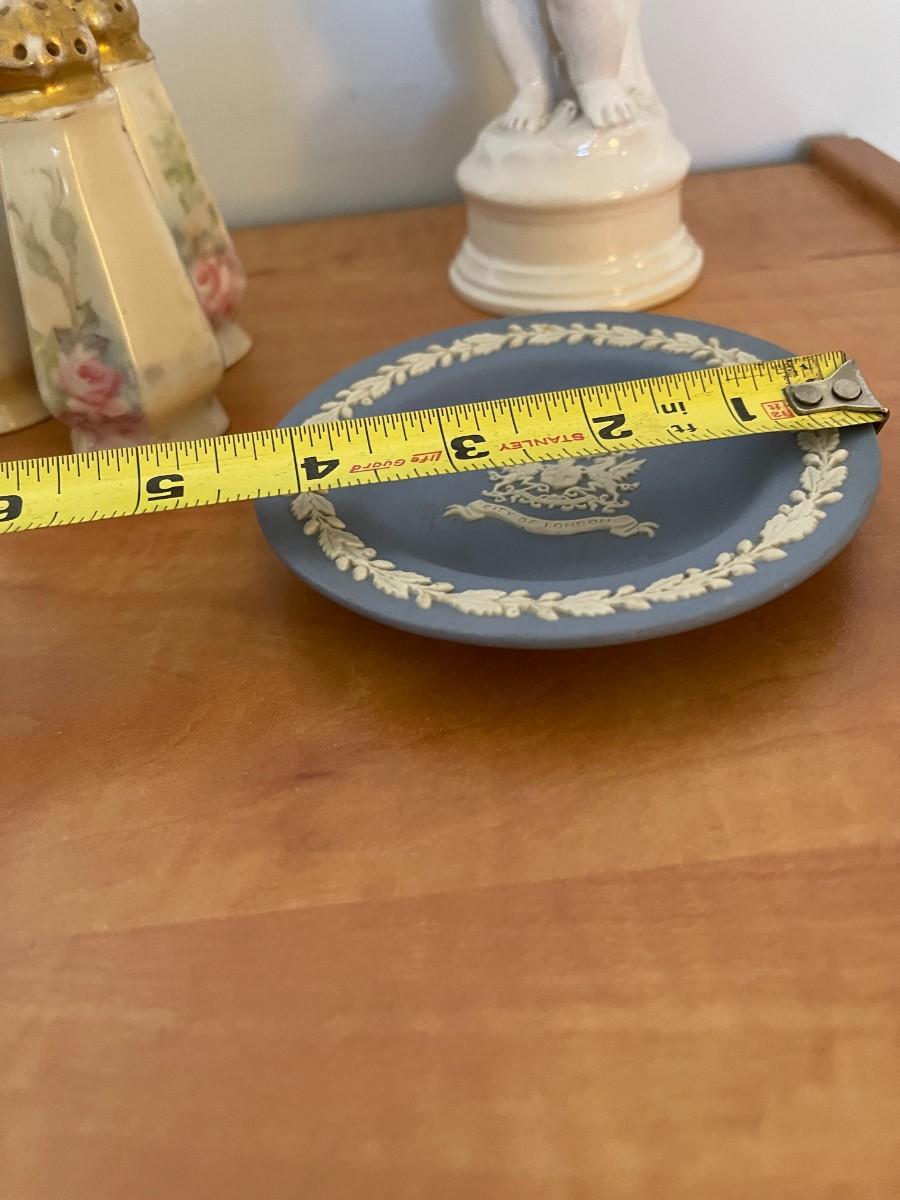 Includes white Italian cherub figurine, 1 pairs of porcelain salt and pepper shakes with gilt tops and Wedgwood blue jasperware trinket dish.