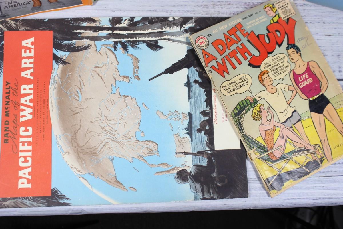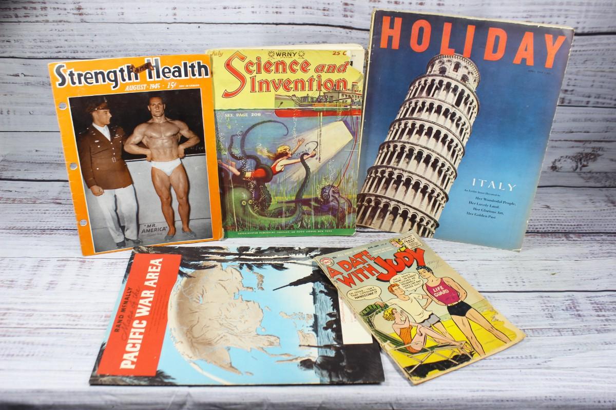 Lot of Vintage Publications Comics, Pulp Magazines, Fitness, Travel, & War, there are no significant rips or tears to any of the pieces and is in good vintage condition. There is some light vintage wear on Science and Invention & A Date with Judy, check pictures for more details and for sizing. Comes with the following 6 publications: Strength Health August 1945 Mr America Clarence Ross, Science and Invention July 1928, Vintage Holiday Italy Guide, Rand McNally Maps of the Pacific War Area, DC Comics a date with Judy Aug - Sept.