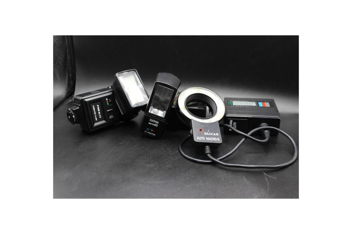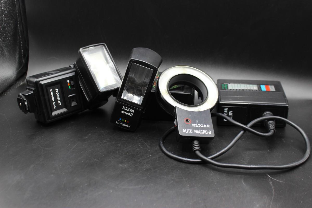 Lot of Vintage Retro Battery Operated & AC Powered Camera Flash Units, there are no significant damage to the bodies or the plastic lens to the flash and is in good vintage condition. These have not been tested, check pictures for more details of what comes in this lot: F700 Blitz Computer Flash, SUNPAK AUTO 411 THYRISTOR FLASH UNIT, ELICAR AUTO MACRO-8 AUTOMATIC POWER PACK.