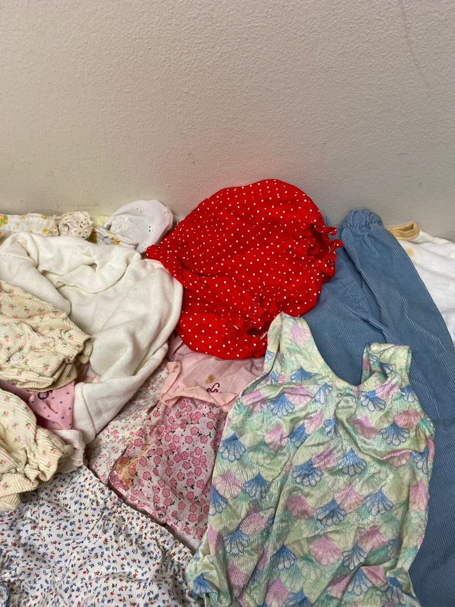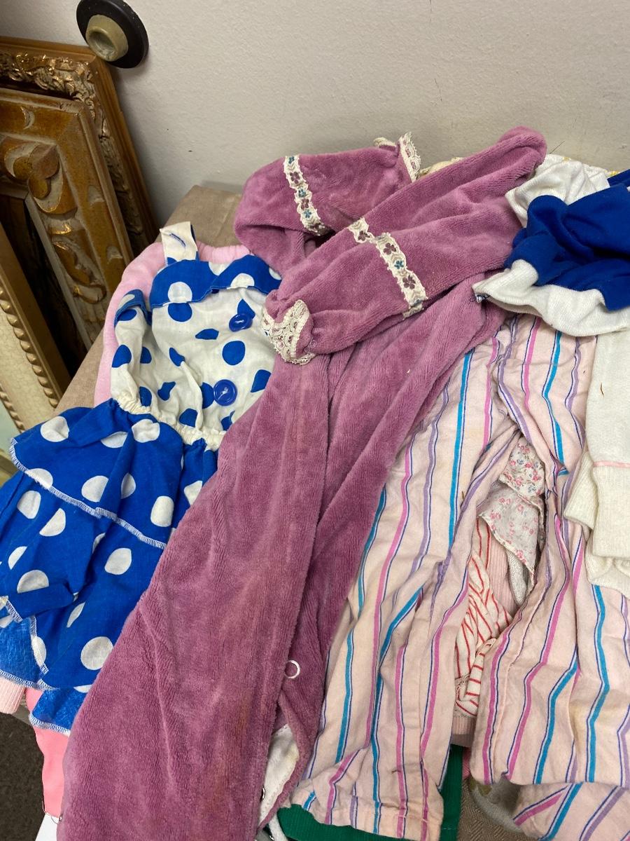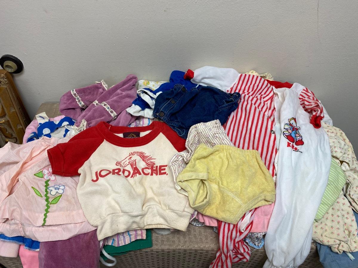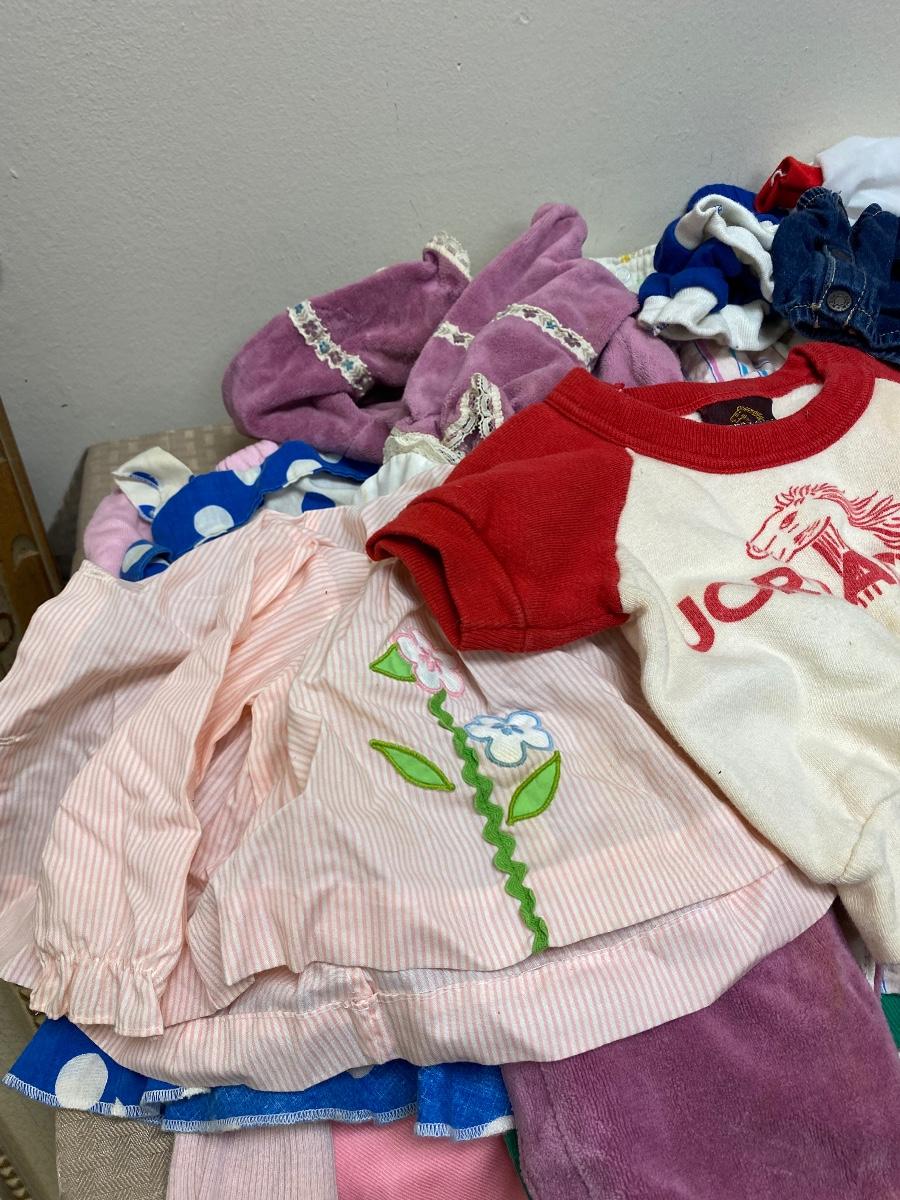 Lot of vintage and retro toddler clothes. Looks mostly for little girl. Around 18 months size. Previously worn, there is some spots and discolor, not sure how clean they would come with washing. Great for dolls.