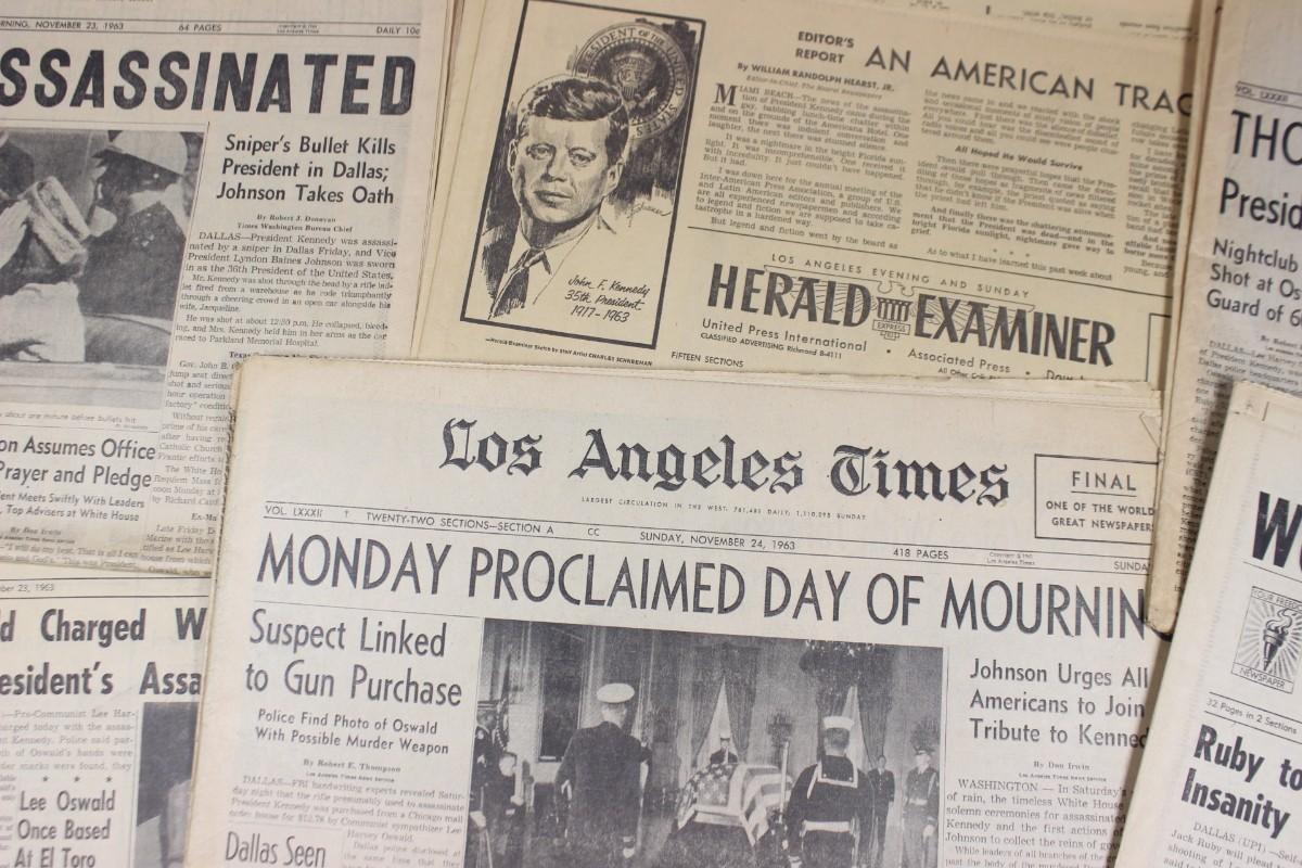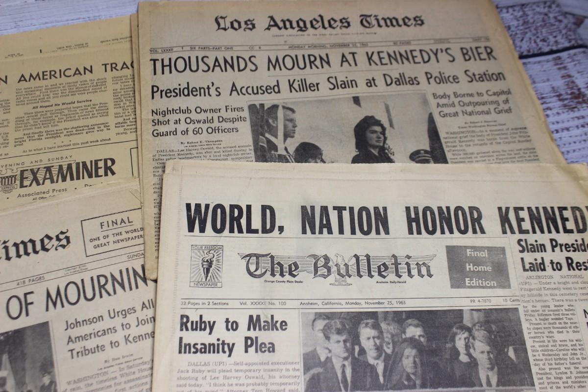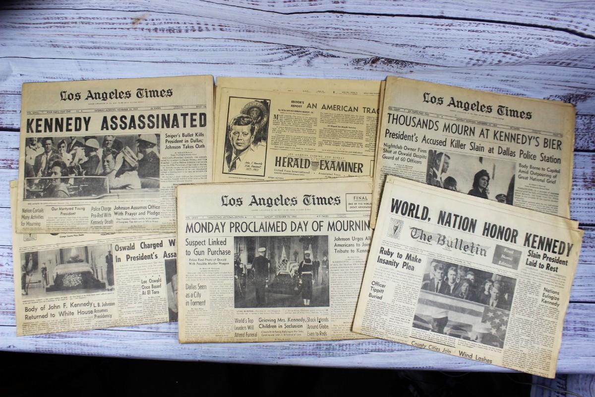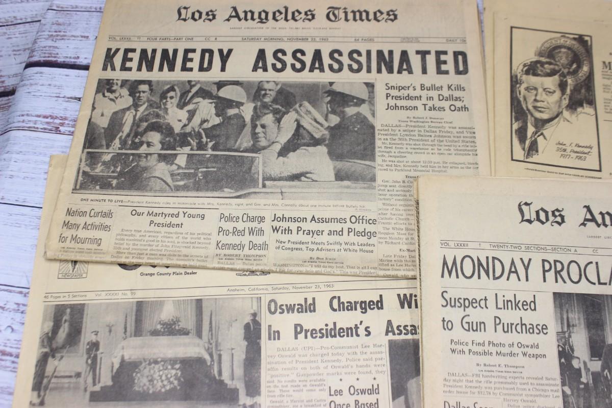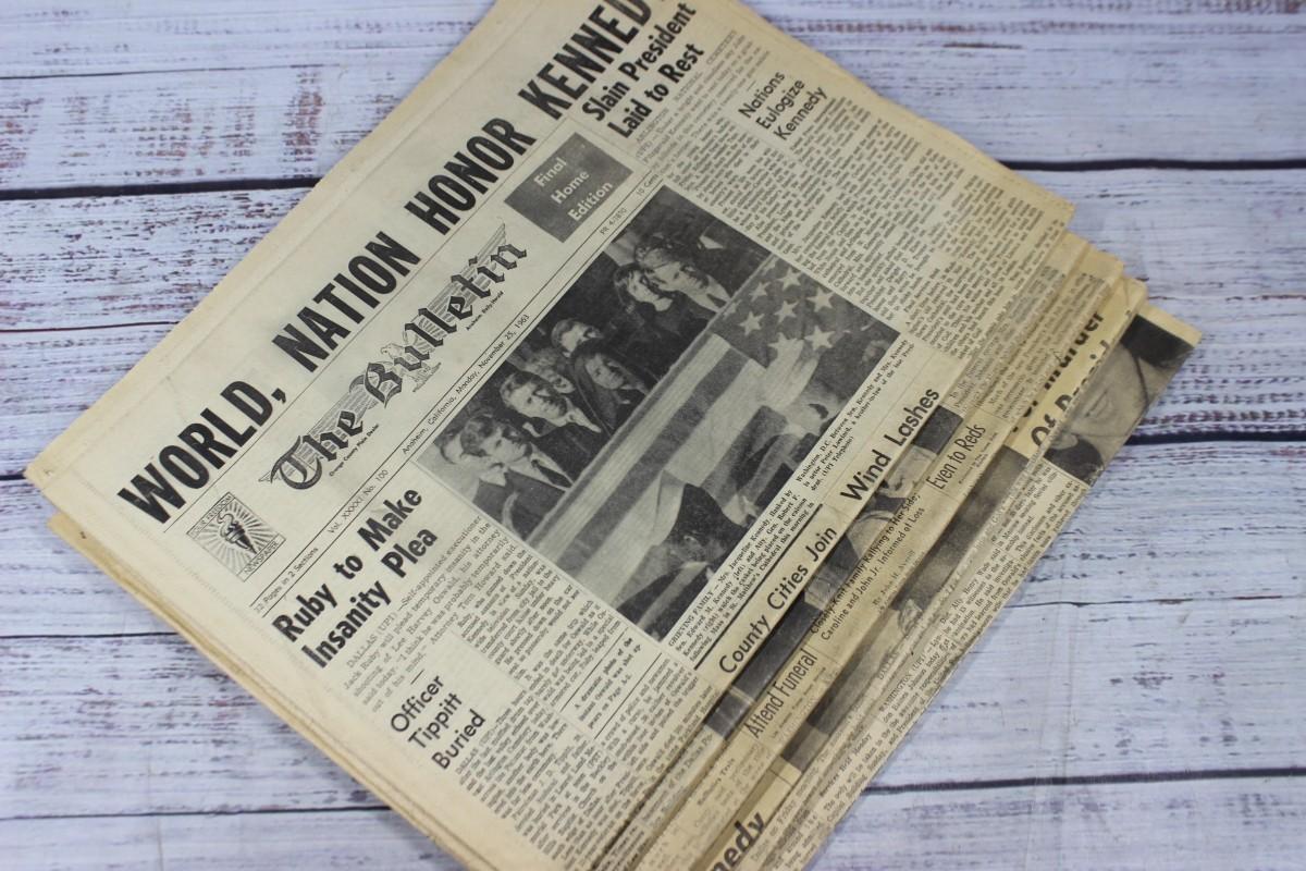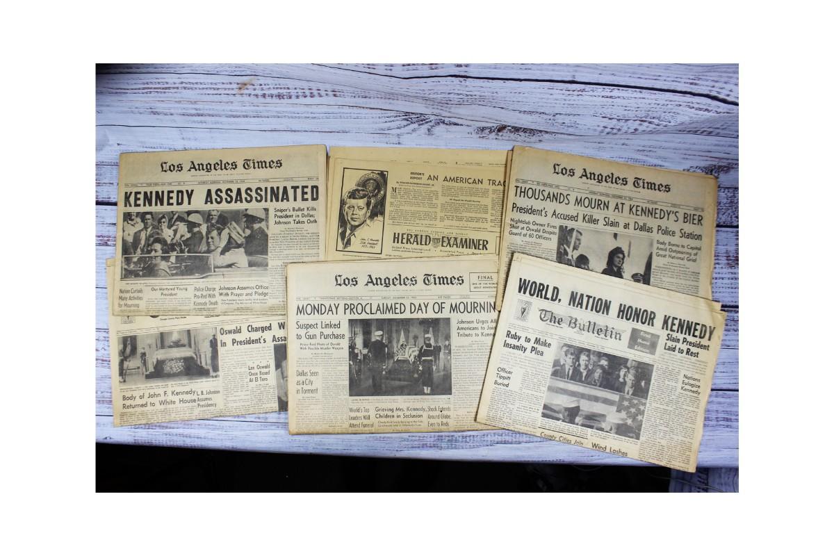 Lot of Vintage Kennedy Assassination Breaking Headlines Newspaper Los Angeles Times, The Bulletin, & More, there is no significant rips or tears to the newspapers and is in good vintage condition. Check pictures for more details and for sizing.