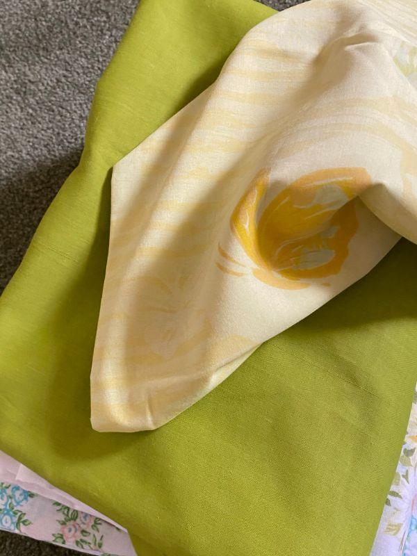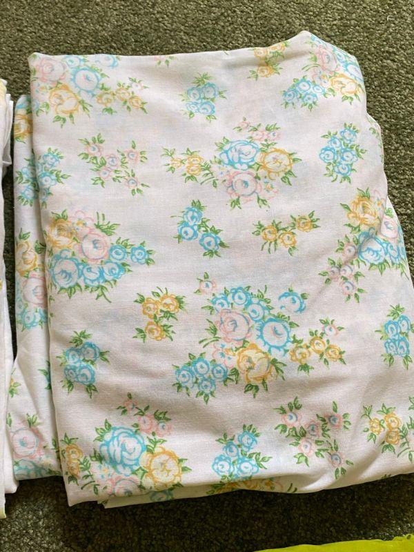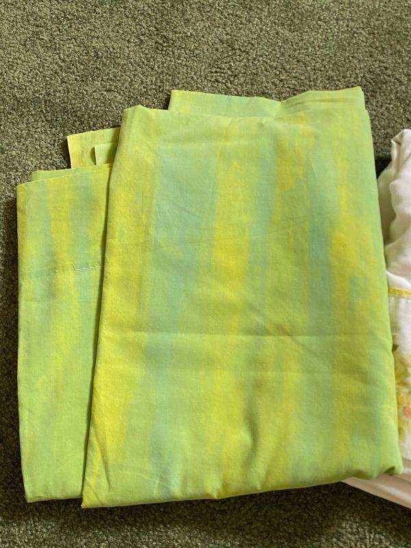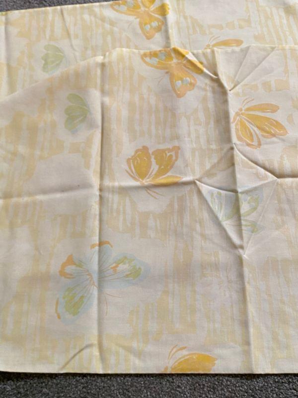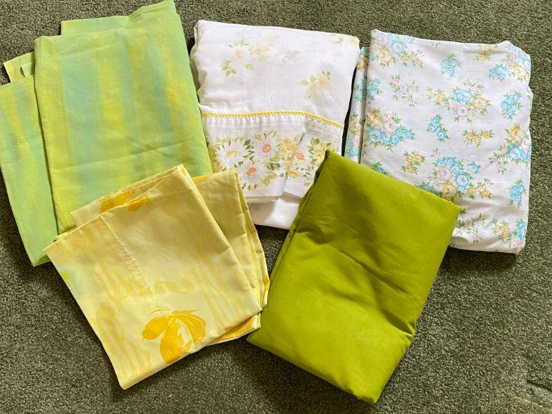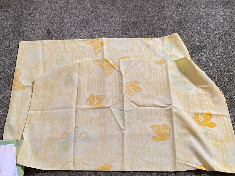 Small lot of vintage sheets and a pair of pillow cases. Floral and green shades. Pillow cases are a yellow butterfly pattern. Did not open fully, look to be full size or larger. Great for repurpose projects.