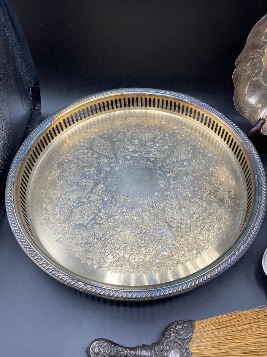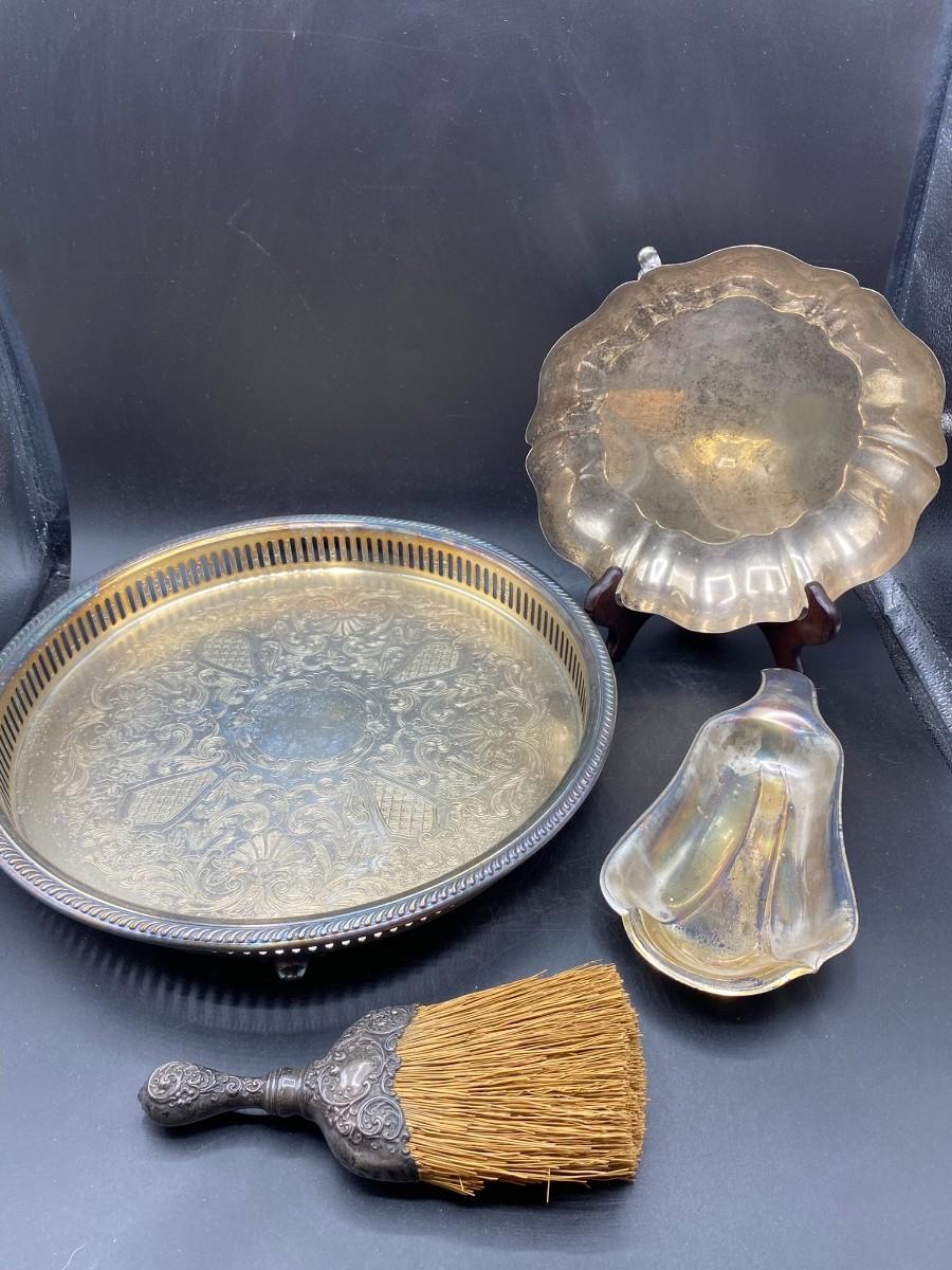Lot of Vintage Silver Plate Serving Pieces & Hand Broom
