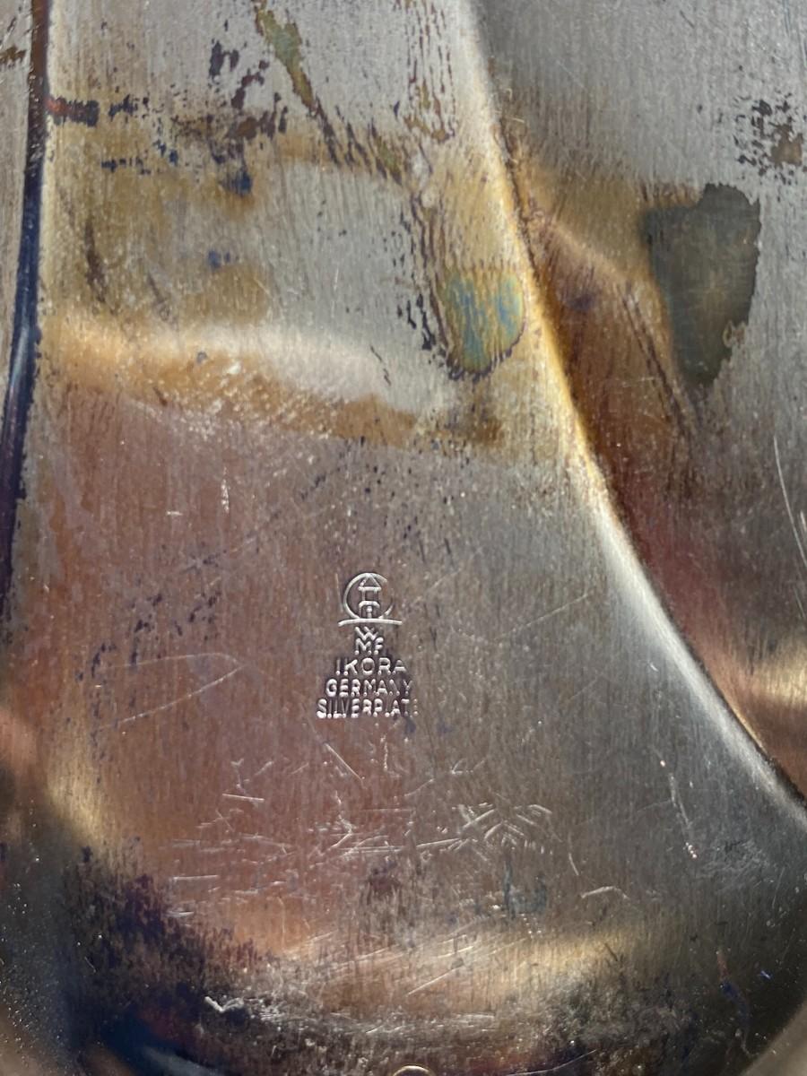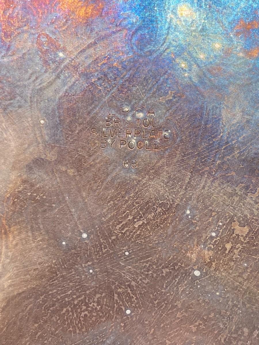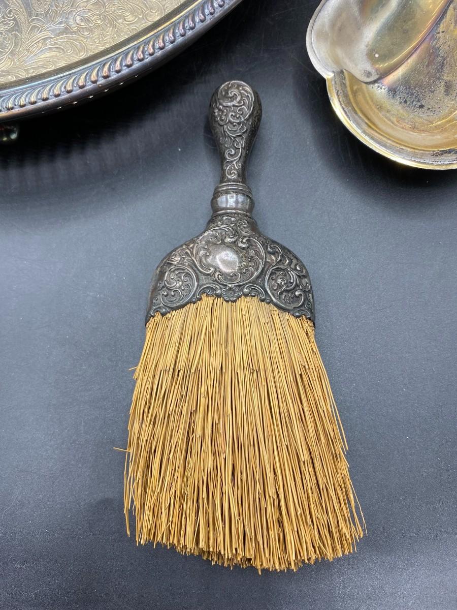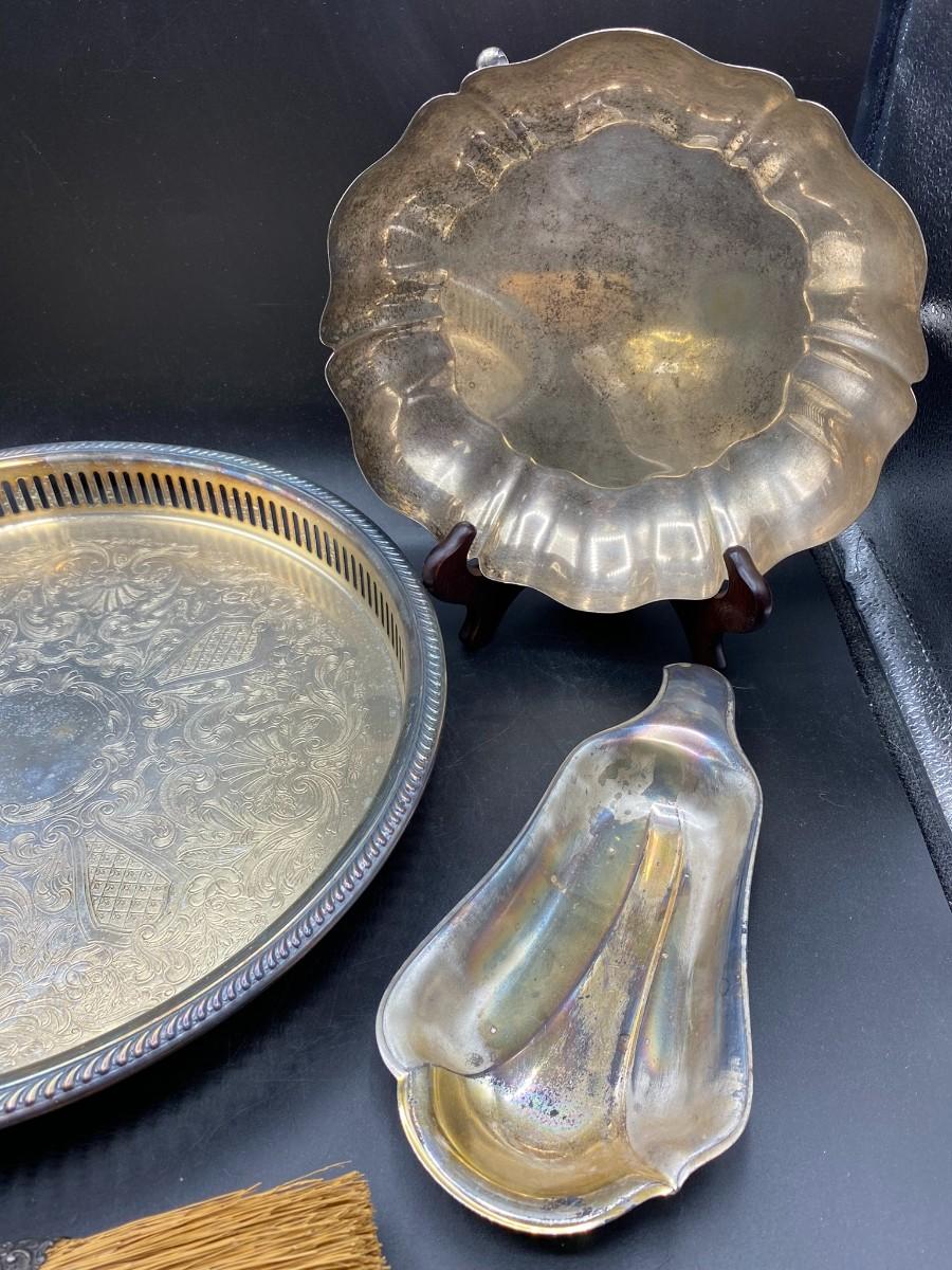 Lot of vintage silver-plated serving pieces and a small hand broom. Broom has some wear to the straw. Pieces are in good condition, need to be polished.
