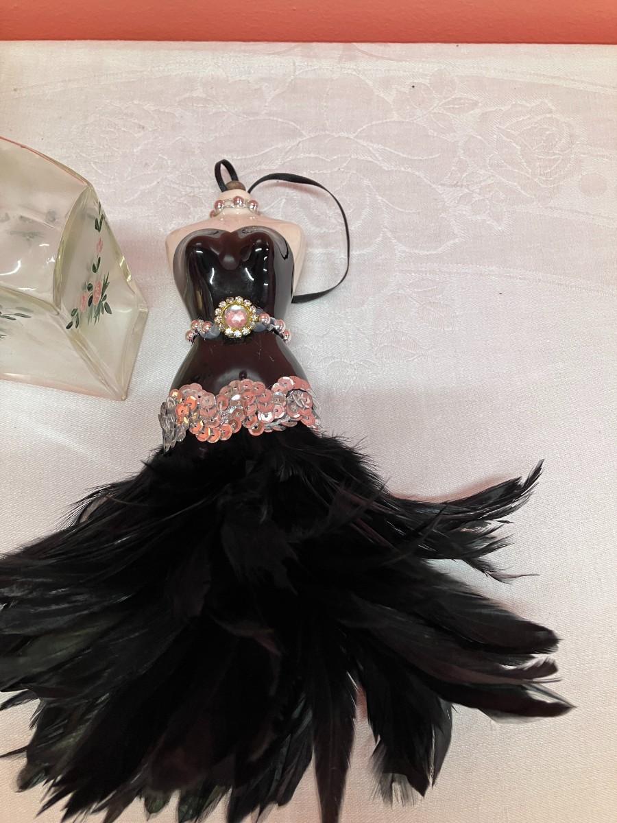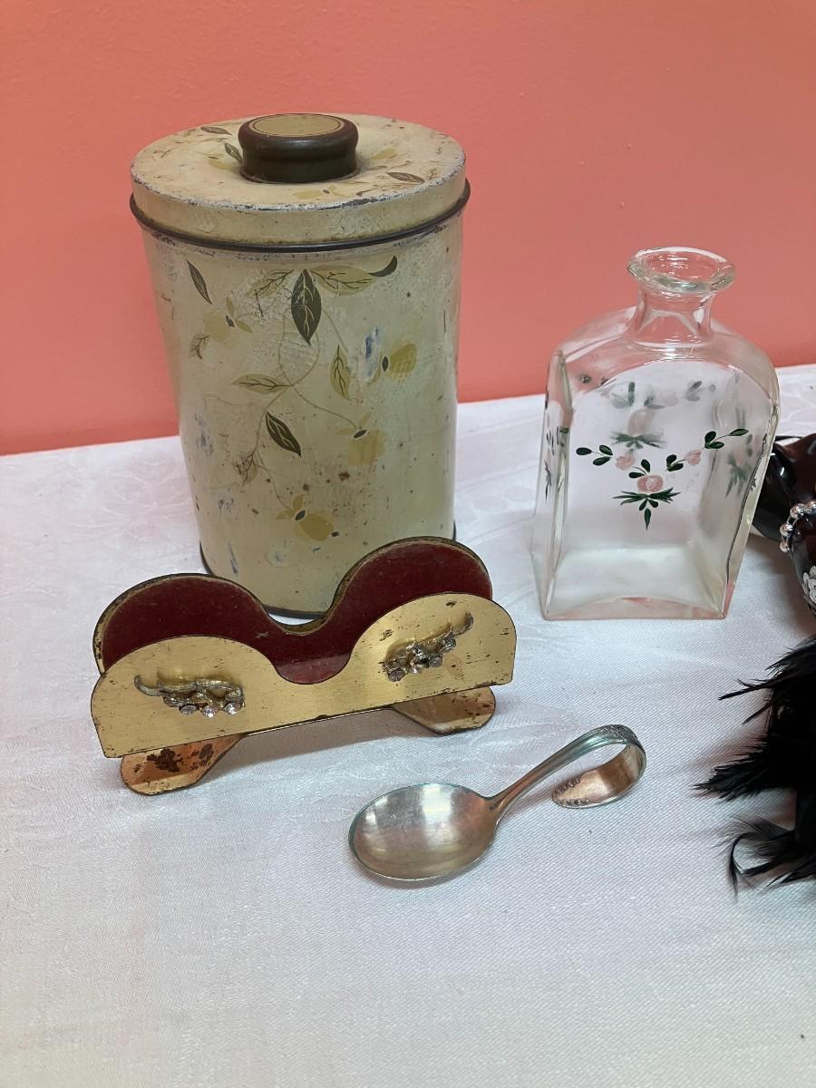 Miscellaneous lot of vintage small items including a glasses holder, silver plate baby spoon, vintage tin, handpainted bottle and BONUS fancy ornament!