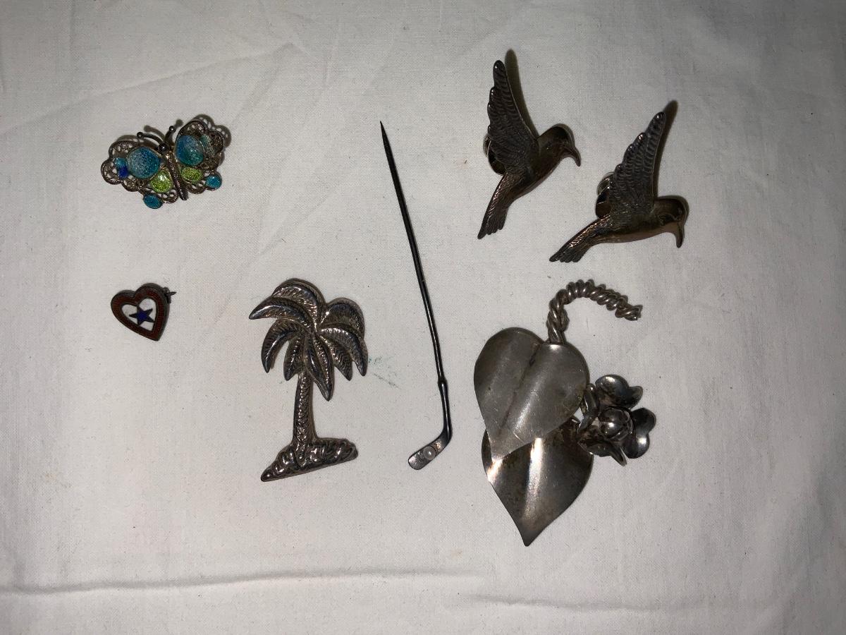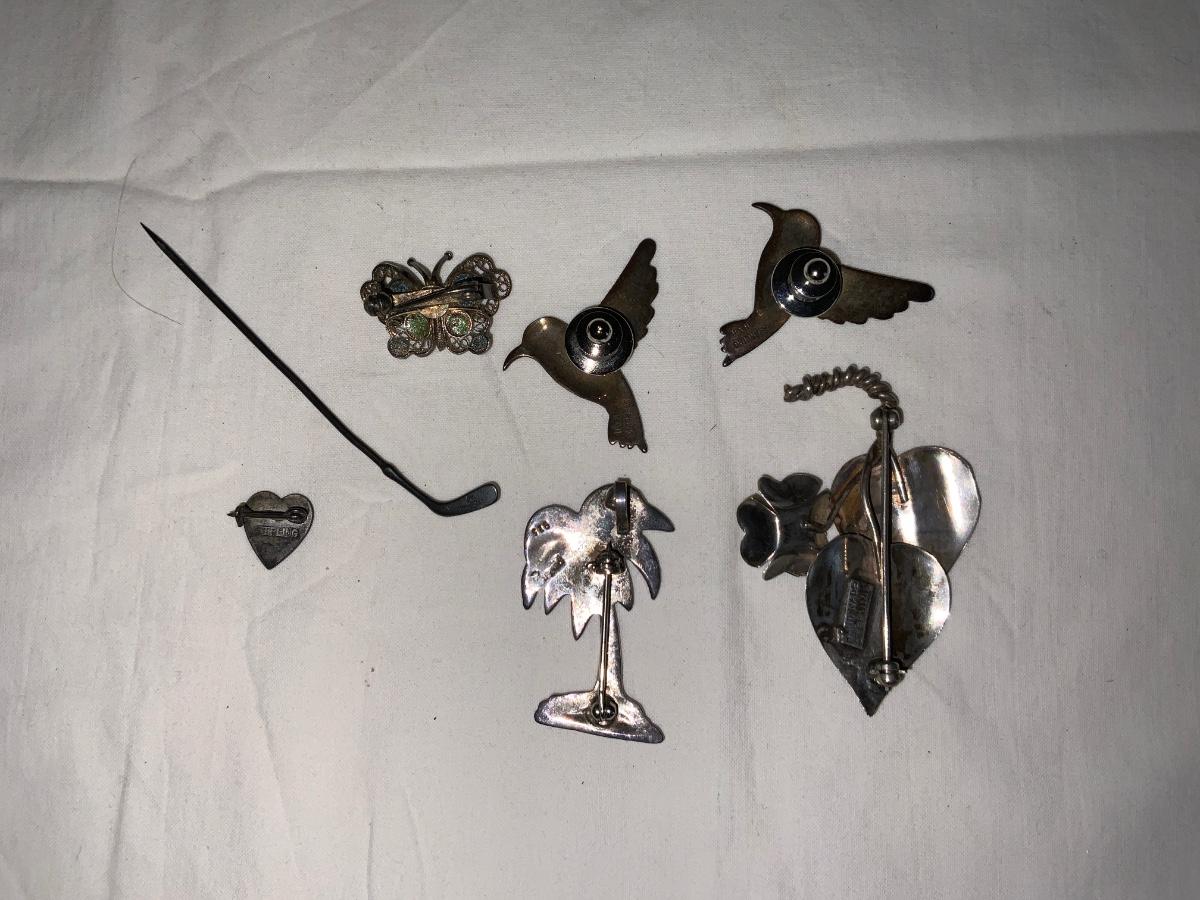 Lot of Sterling Silver Pins/Brooches. All marked Sterling or 925 with the exception of the butterfly which is somewhat indistinguishable. Not verified or tested. Please see photos for condition