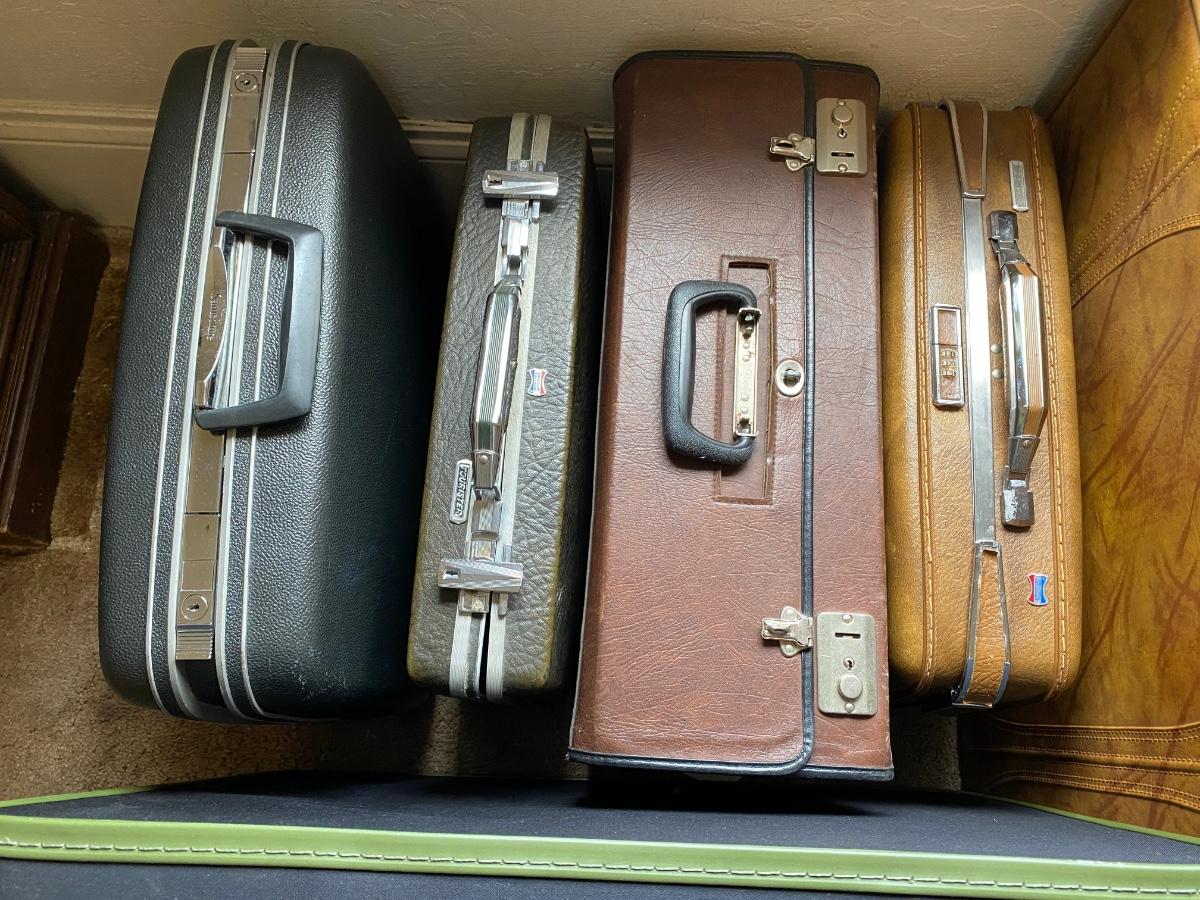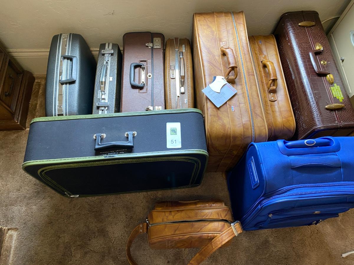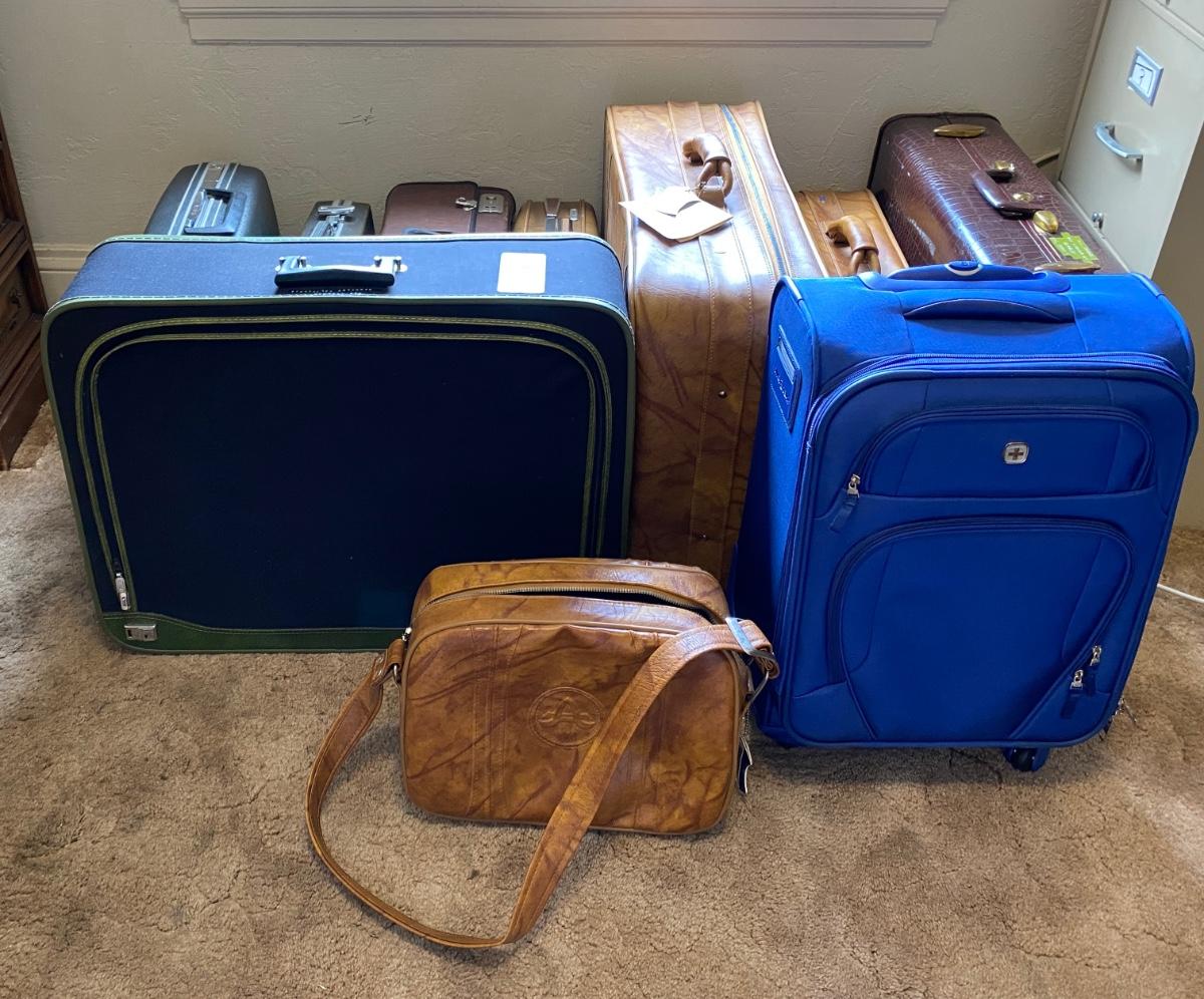 10 suitcases. Some are briefcases. Largest is 20x26x7”. Smallest is 12x17x3”